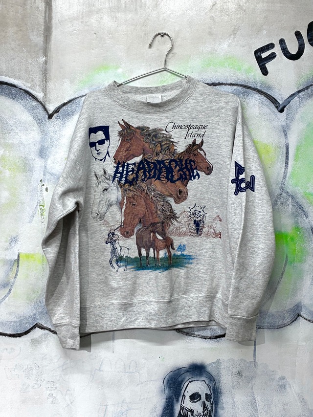 古着にシルク印刷でタトゥーを入れています。シンコティーグ島はバージニア州にあるリゾートアイランドで、野生のポニー、シーフード、美しいビーチ、そして毎年恒例の「ポニー・スイム」で有名、だそうです。そこのスウェットです。怪しげなサングラス男が馬を強奪して島を荒らしている感じが偶然にも出ていますね。 サイズは画像でご確認ください。 古着です。シミ・汚れ・日焼け等は、その服の個性、とご理解いただける方のみご購入ください。