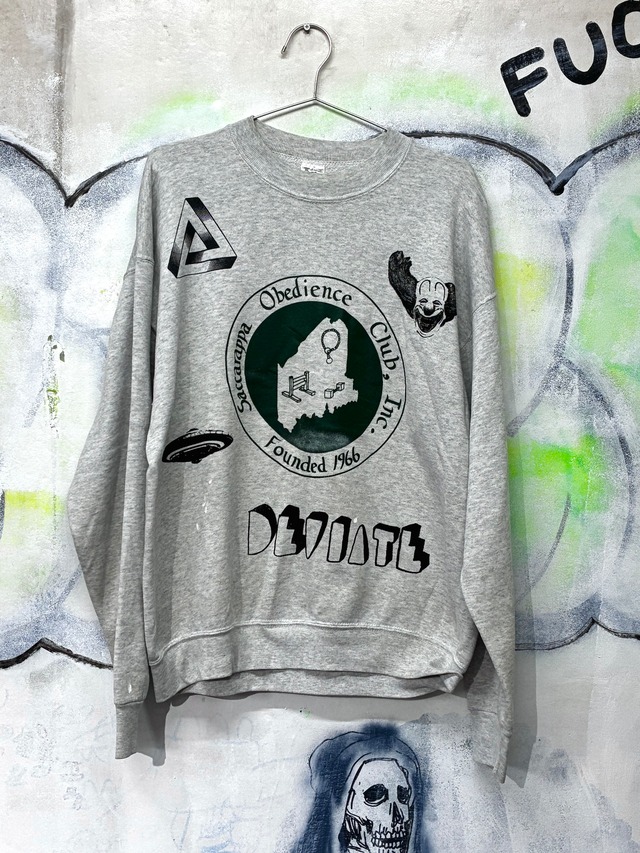 古着にシルク印刷でタトゥーを入れています。アメリカ・メイン州ポートランドにある犬のしつけ教室のスウェットです。最初、手柄が死刑台かと思って警戒しましたが、犬のしつけ用具でした。なので、ピエロや不可能図形、UFOなど、陰謀論的な不穏な雰囲気をプラスし、死刑台側に寄り戻しています。 サイズは画像でご確認ください。 白ペンキ汚れが複数あります。それもまた良きです。 古着です。シミ・汚れ・日焼け等は、その服の個性、とご理解いただける方のみご購入ください。