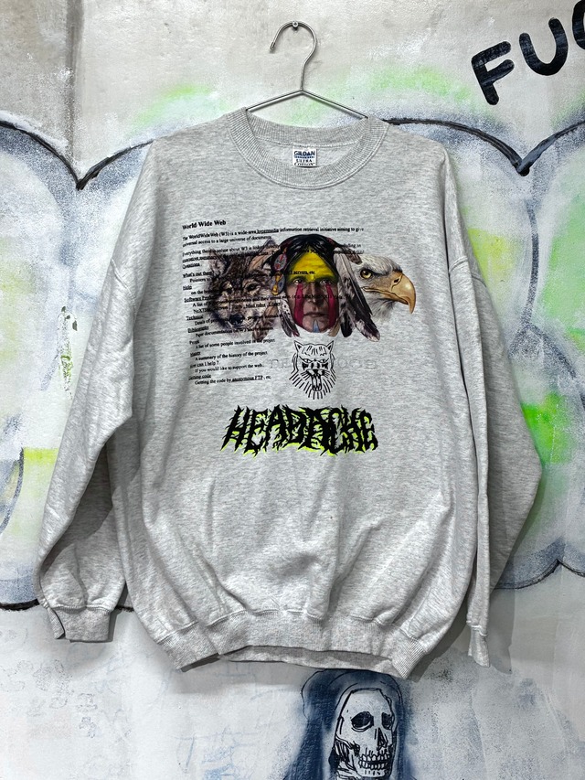 古着にシルク印刷でタトゥーを入れています。ネイティヴアメリカン+狼+鷲=土地に根差しがち3兄弟スウェットです。そこに重なる英字は、world wide webの基本理念です。滅びゆく時代とテクノロジーの悲哀を感じてください。 サイズは画像でご確認ください。 古着です。シミ・汚れ・日焼け等は、その服の個性、とご理解いただける方のみご購入ください。