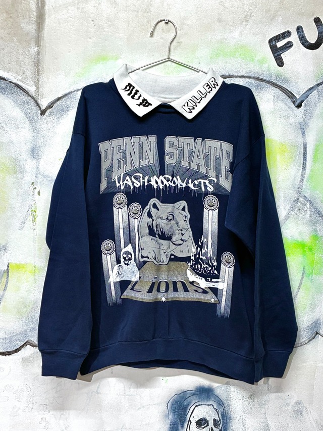 古着にシルク印刷でタトゥーを入れています。ペンシルベニア州立大学のスウェットです。個人的にすごく気に入っています。襟のプリントや死神、炎上パトカーなどが不穏な空気を演出し、大学の象徴であるライオンが図らずも、呪術的な印象を醸し出しています。 サイズは画像でご確認ください。 古着です。シミ・汚れ・日焼け等は、その服の個性、とご理解いただける方のみご購入ください。