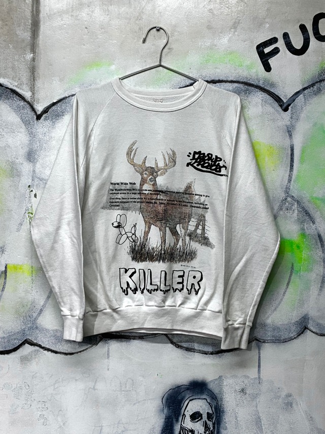 古着にシルク印刷でタトゥーを入れています。ハンティング系のスウェット。鹿に被せてworld wide web の開発理念の一部が書かれています。KILLERは、鹿が言ってるとしたら、人殺しじゃなくて鹿殺しですね。 サイズは画像でご確認ください。 古着です。シミ・汚れ・日焼け等は、その服の個性、とご理解いただける方のみご購入ください。