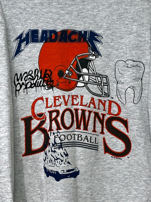 古着にシルク印刷でタトゥーを入れています。NFLクリーブランドブラウンズのスウェットです。ヘルメットにHEADACHE(頭痛)の文字が生えます。抜けた歯や炎上パトカーが荒々しいチームの雰囲気を表現しています。 でもほんとはそんなチームではないはずです。 サイズは画像でご確認ください。 古着です。シミ・汚れ・日焼け等は、その服の個性、とご理解いただける方のみご購入ください。