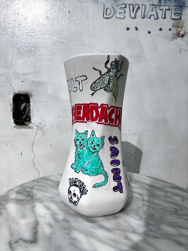 昭和の大理石花瓶とポップカルチャー、工業部品などをマッシュアップし、1点ものとすることで価値を高める、価値のリサイクル作品です。 鈍器とも言うべき重い花瓶にペイントし、工業部品で作ったタグを付けています。 最大幅8Φ×高さ22cm ペイント部分は金属などにも描けるインクで描いてますので、水洗い等は可能ですが、固いもので強くこすると剥がれますので、ご注意ください。手でこすったりのレベルでは問題ありませんが、経年も楽しめる方のみご購入お願いします。