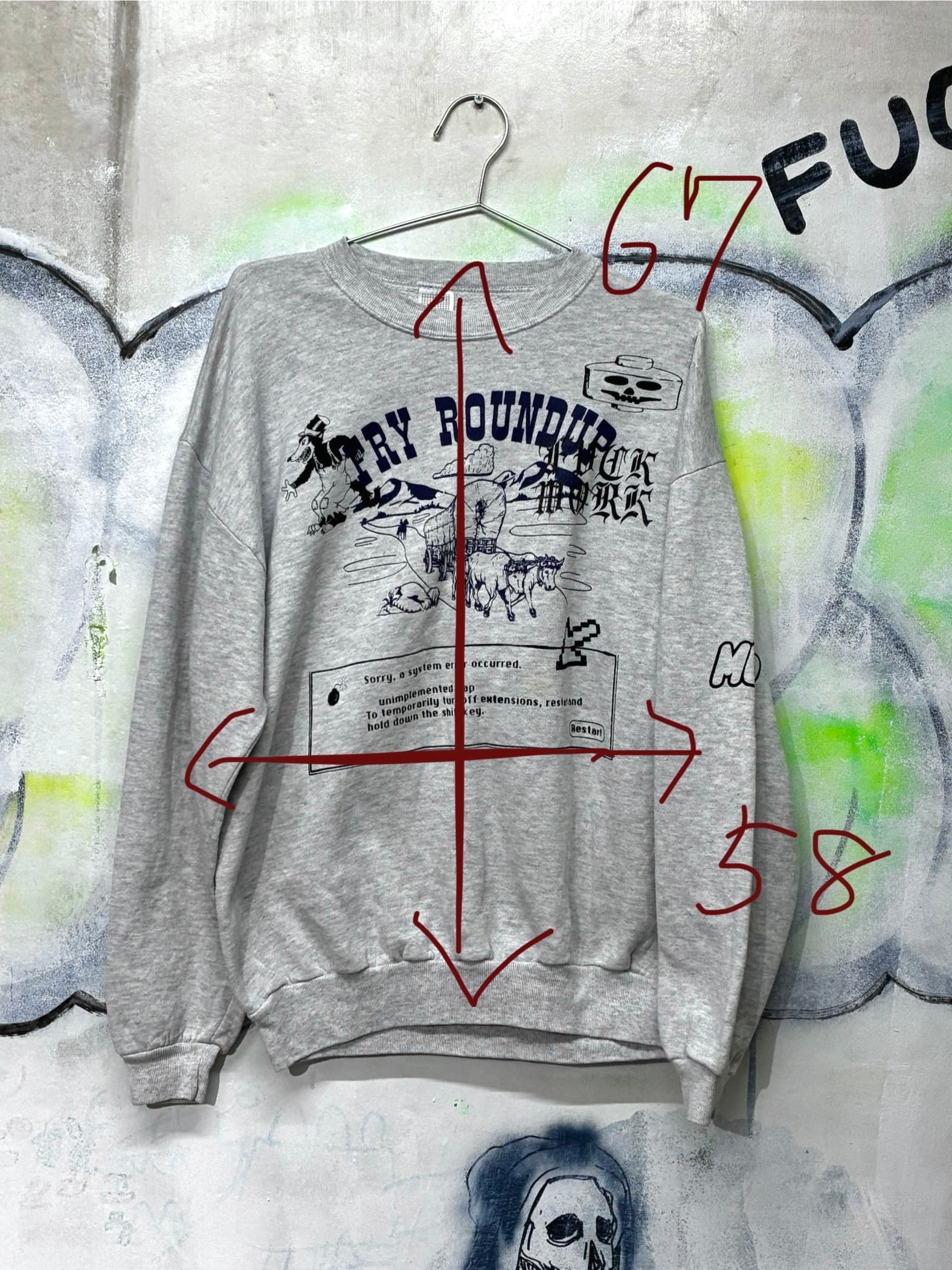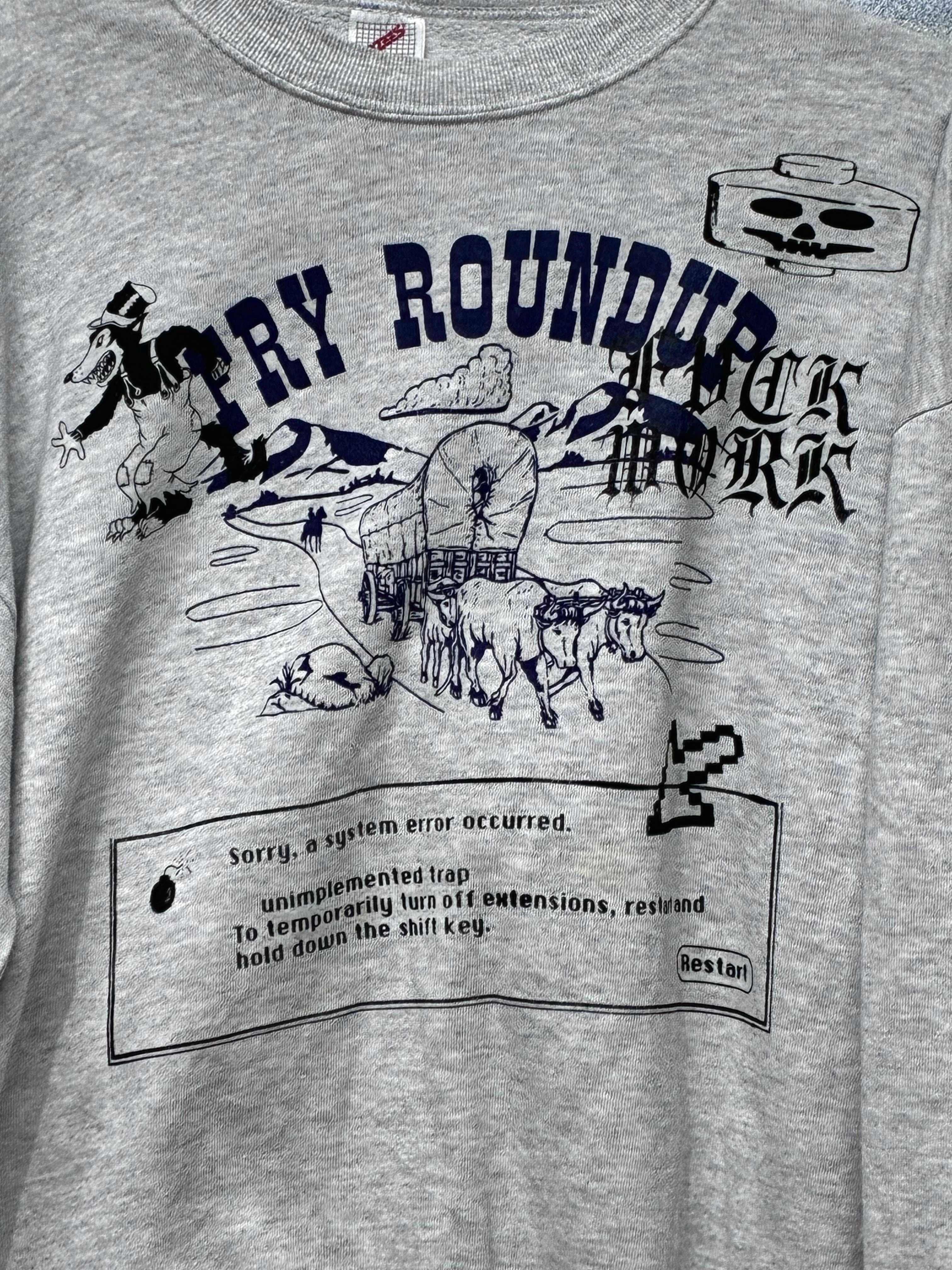 古着にシルク印刷でタトゥーを入れています。英字の絵柄は、初期Macのエラーメッセージです。