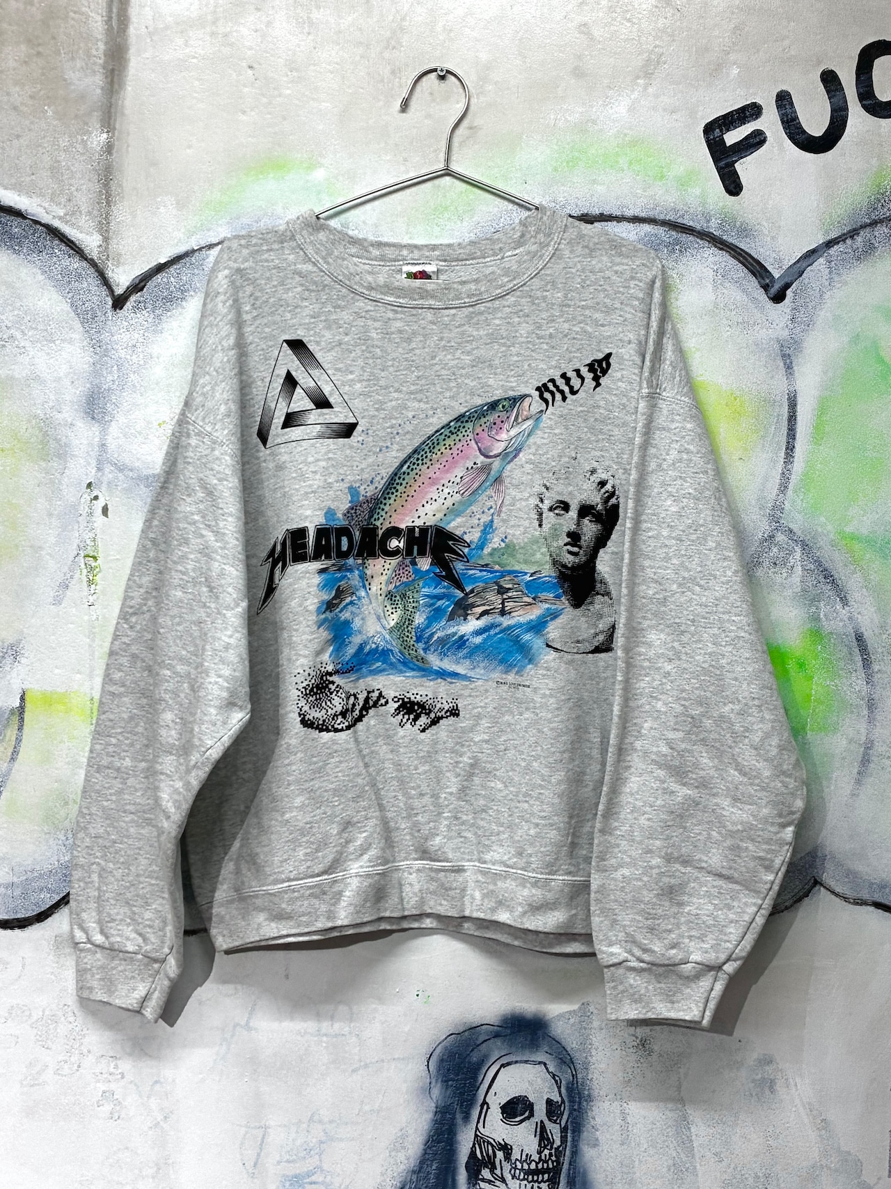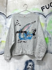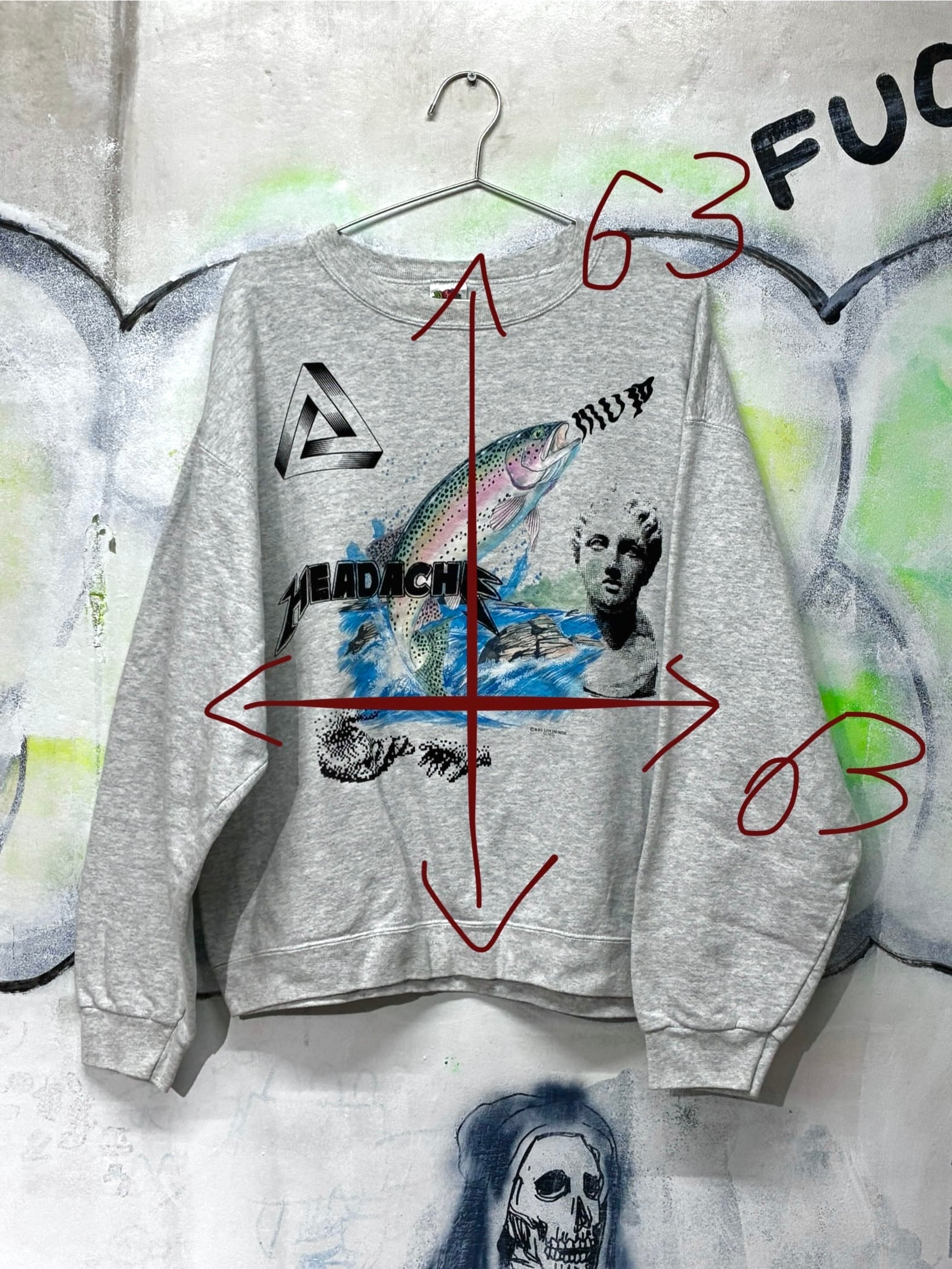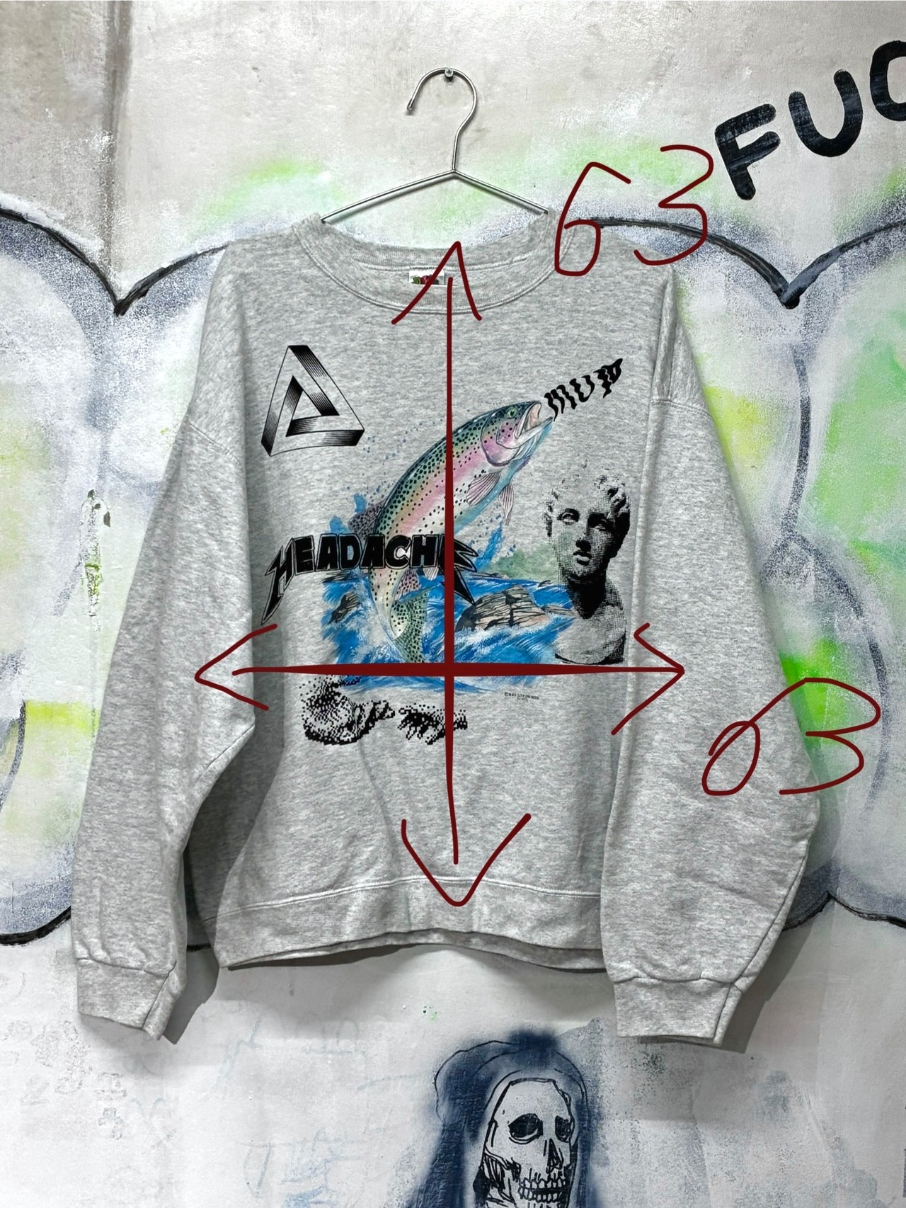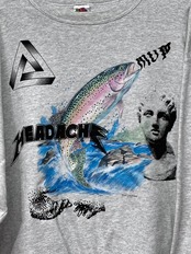古着にシルク印刷でタトゥーを入れています。古着には釣り系というジャンルがありますが、これは珍しい川釣り系です。知らんけど。不可能図形、headache頭痛、美術室の彫刻像、初期エリクソンの携帯初期画面(神と人類の手)、などがプリントしてます。