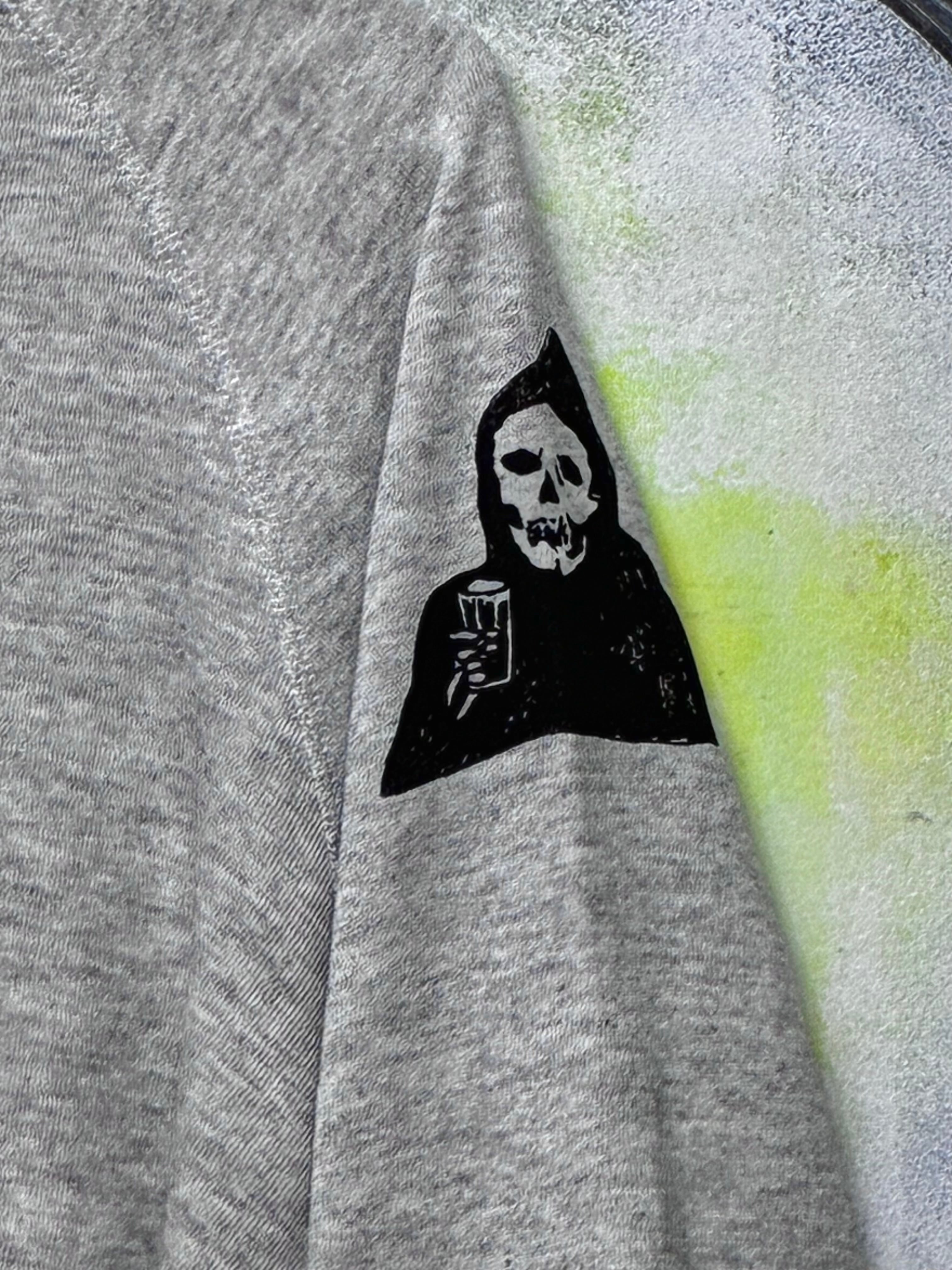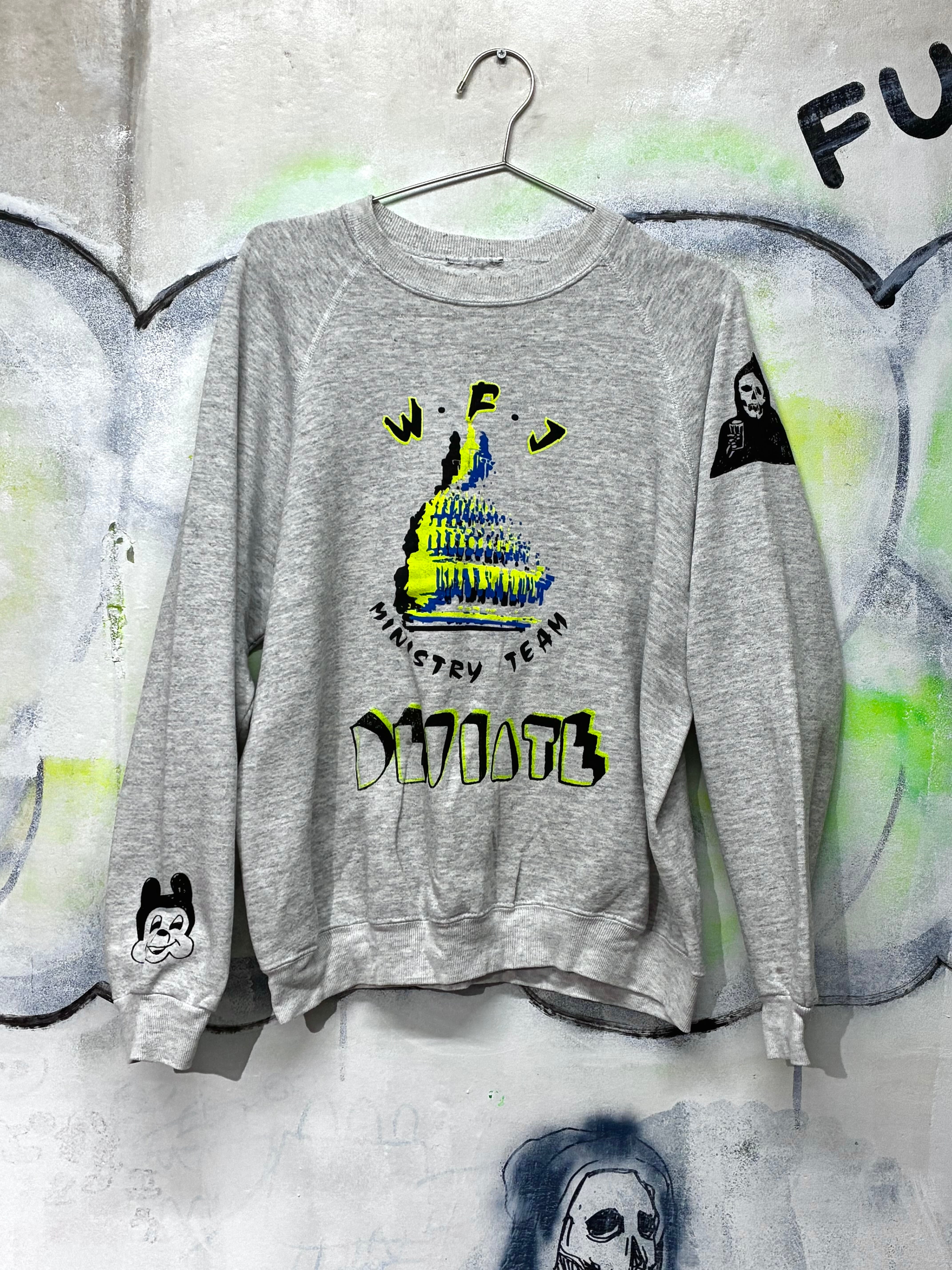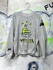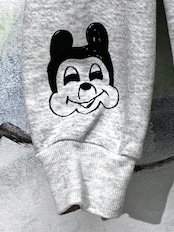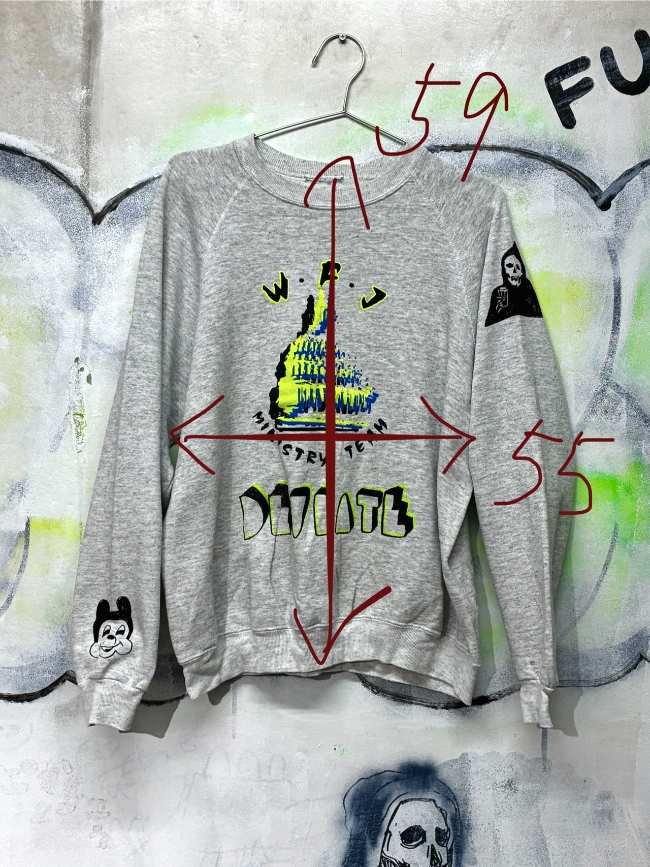 古着にシルク印刷でタトゥーを入れています。はっきり分かりませんが、ministry teamとは、主に キリスト教会団体などで、奉仕などの役割を担うチーム、ということのようです。そんな趣旨のスウェットに、DEVIATE(道を外れる)、死神、あざ笑う偽ミッキ、など不穏な空気をプラスしています。アナーキー。