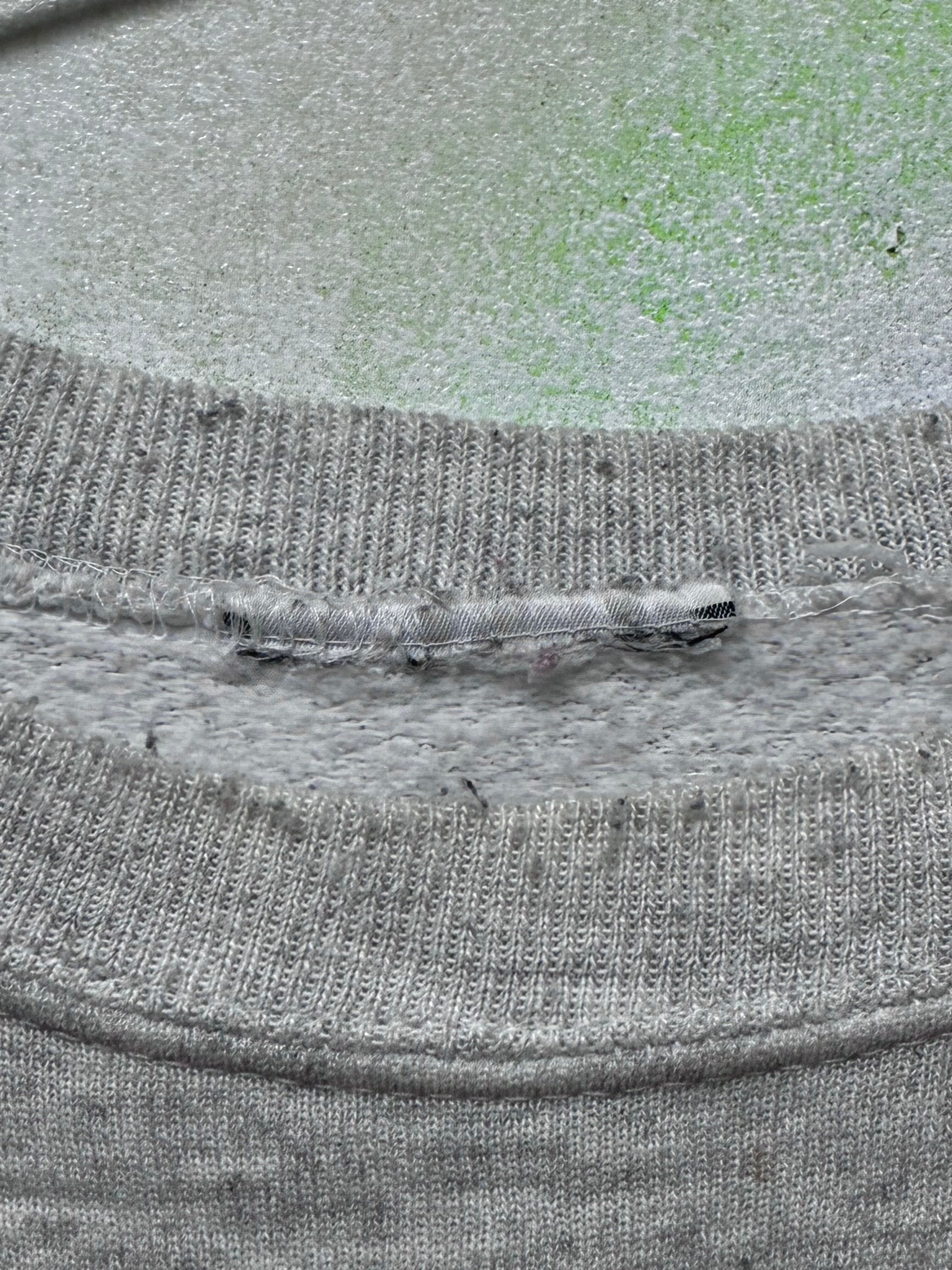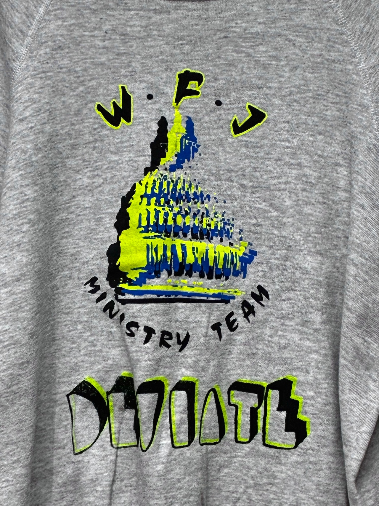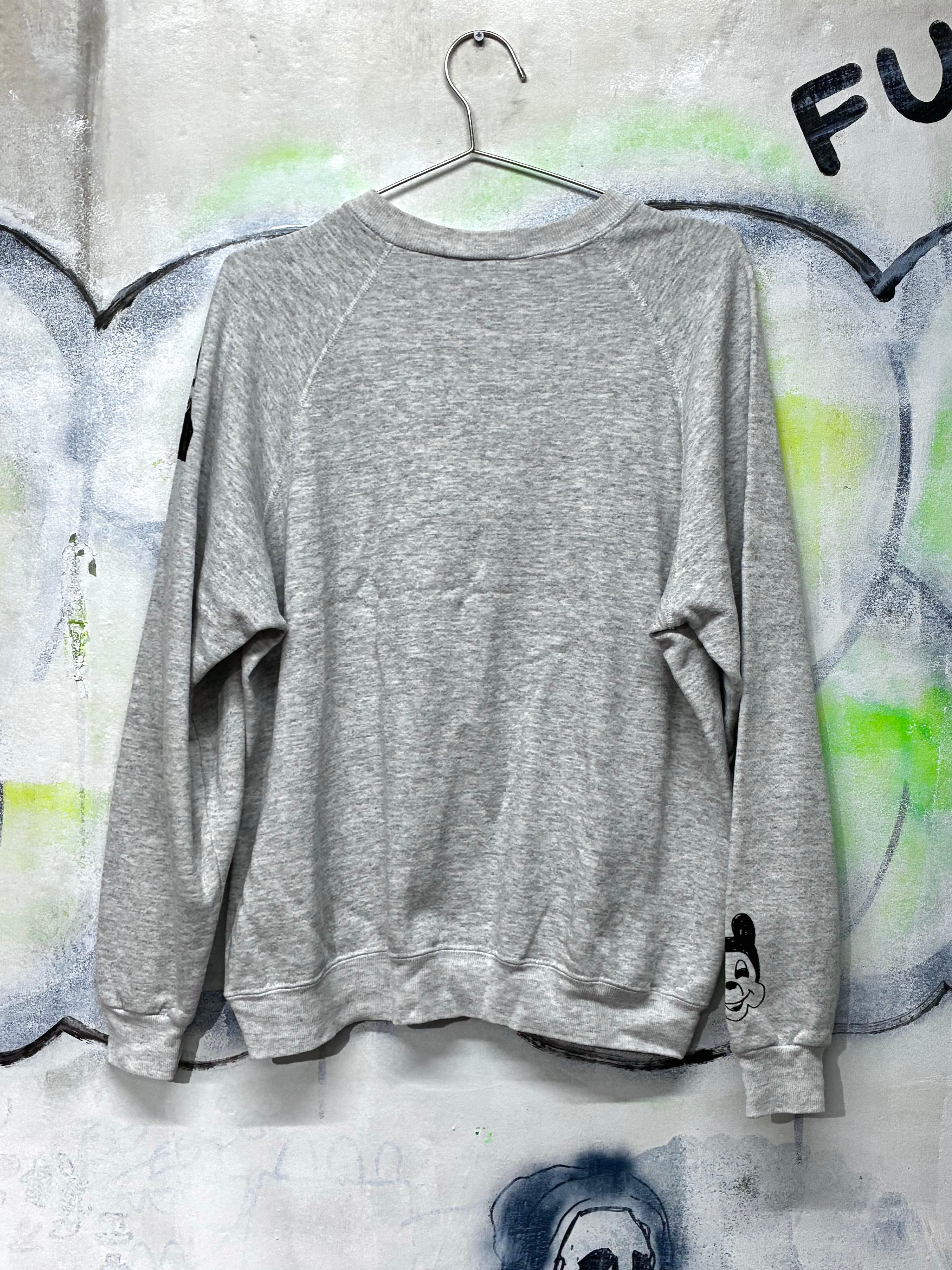 古着にシルク印刷でタトゥーを入れています。はっきり分かりませんが、ministry teamとは、主に キリスト教会団体などで、奉仕などの役割を担うチーム、ということのようです。そんな趣旨のスウェットに、DEVIATE(道を外れる)、死神、あざ笑う偽ミッキ、など不穏な空気をプラスしています。アナーキー。