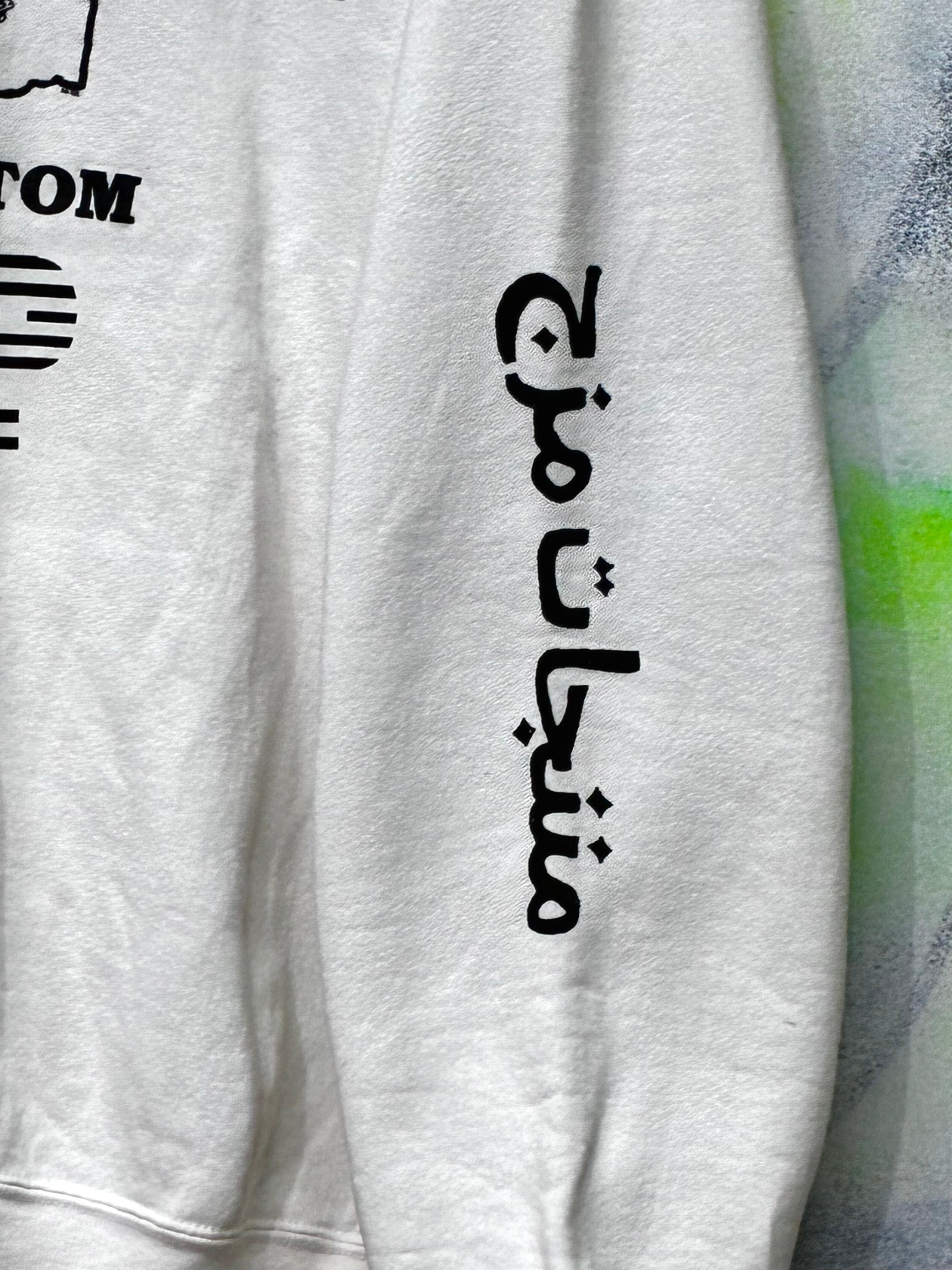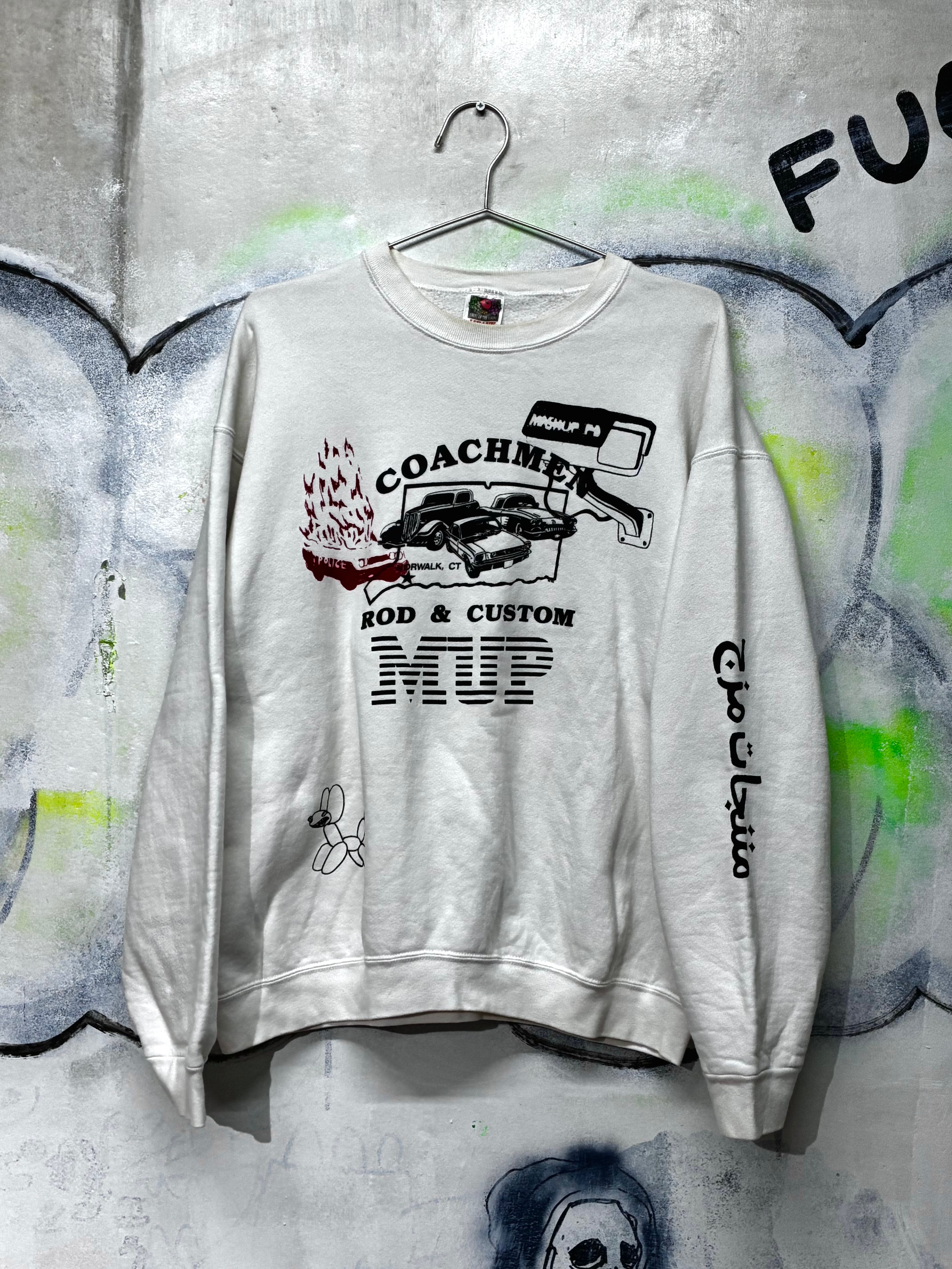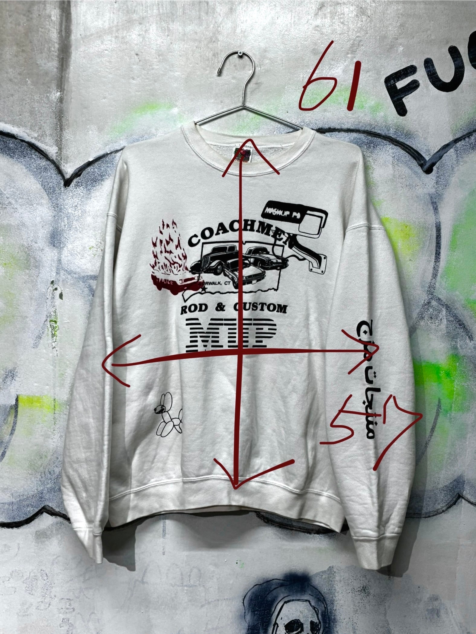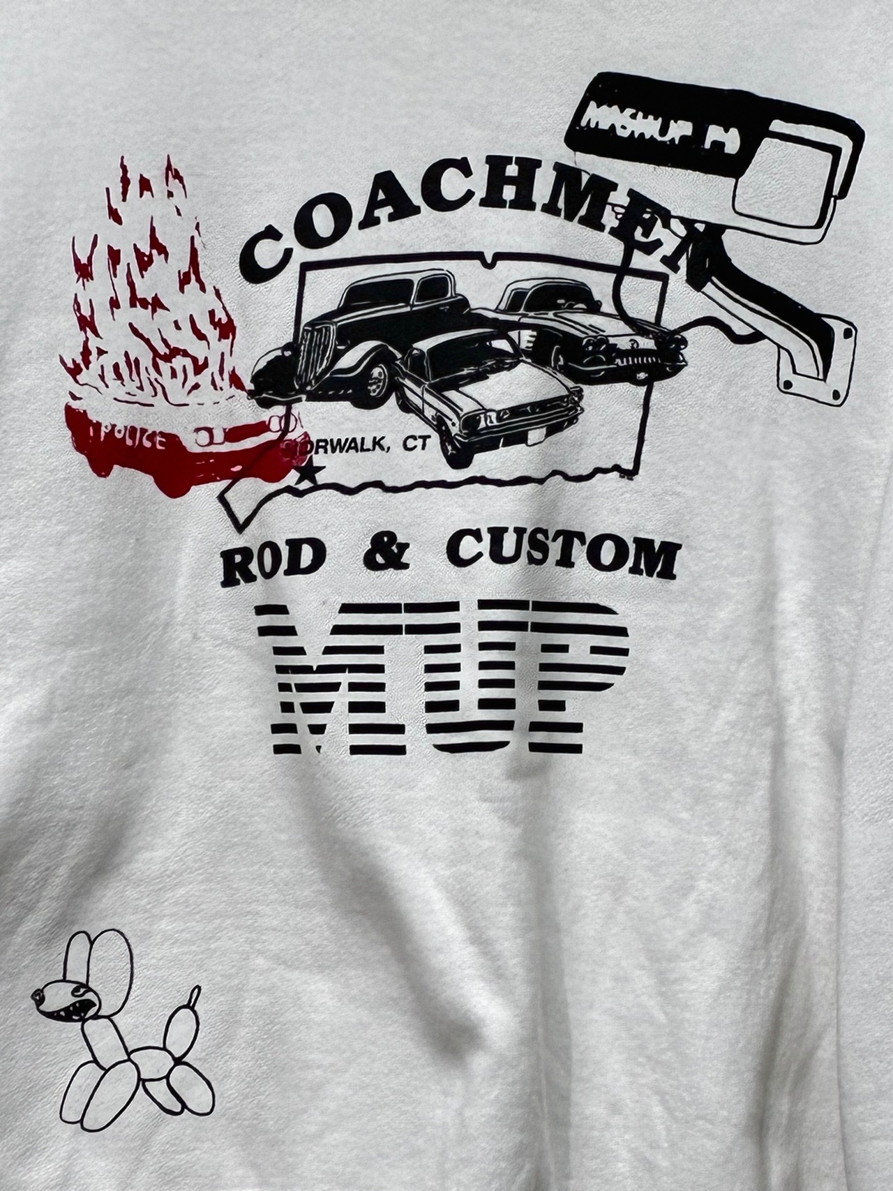 古着にシルク印刷でタトゥーを入れています。アメリカの車カスタム会社のスウェットのようです。監視カメラや炎上パトカーなど、何やら物騒です。風船犬が暴れているのでしょうか?