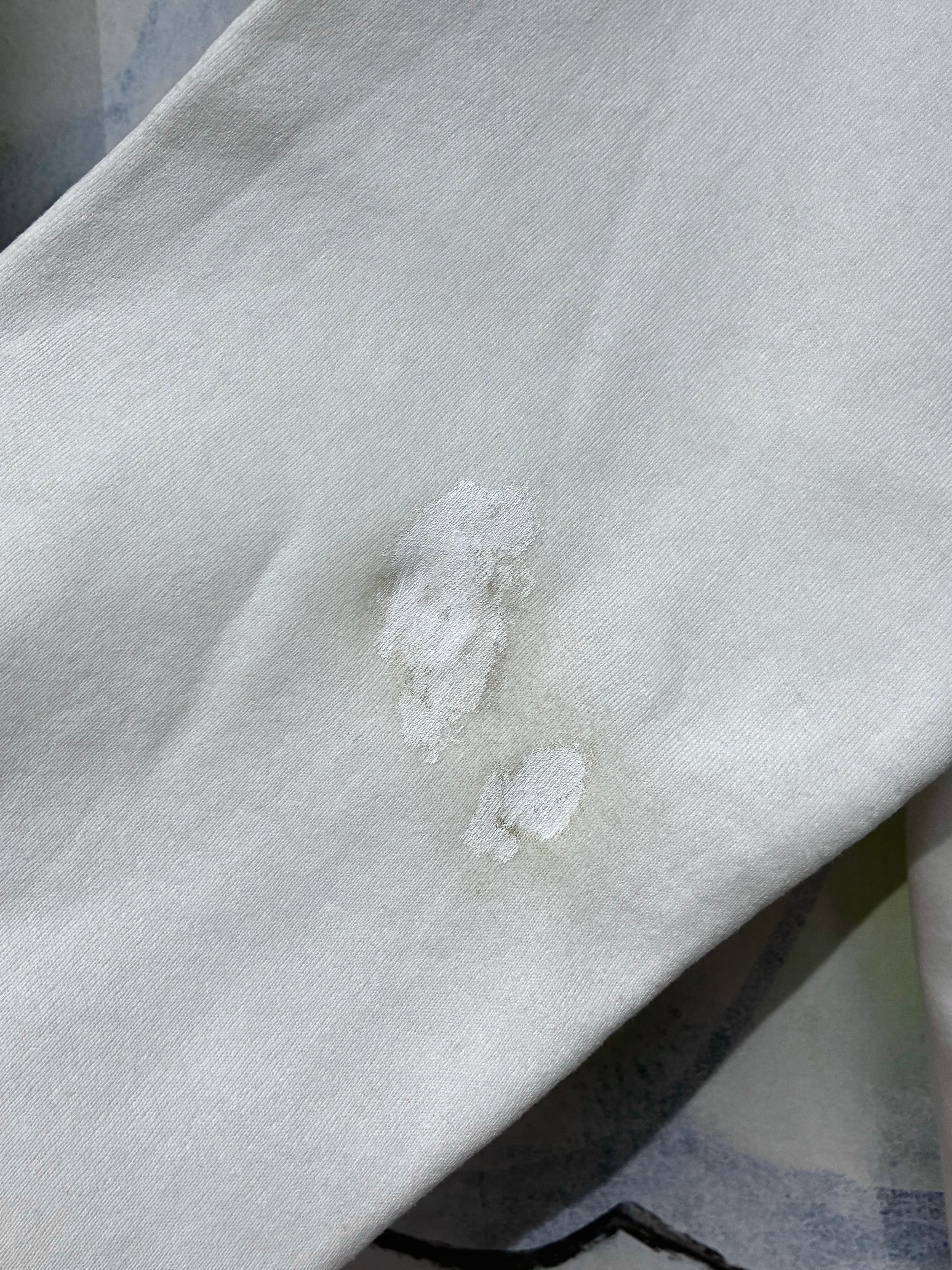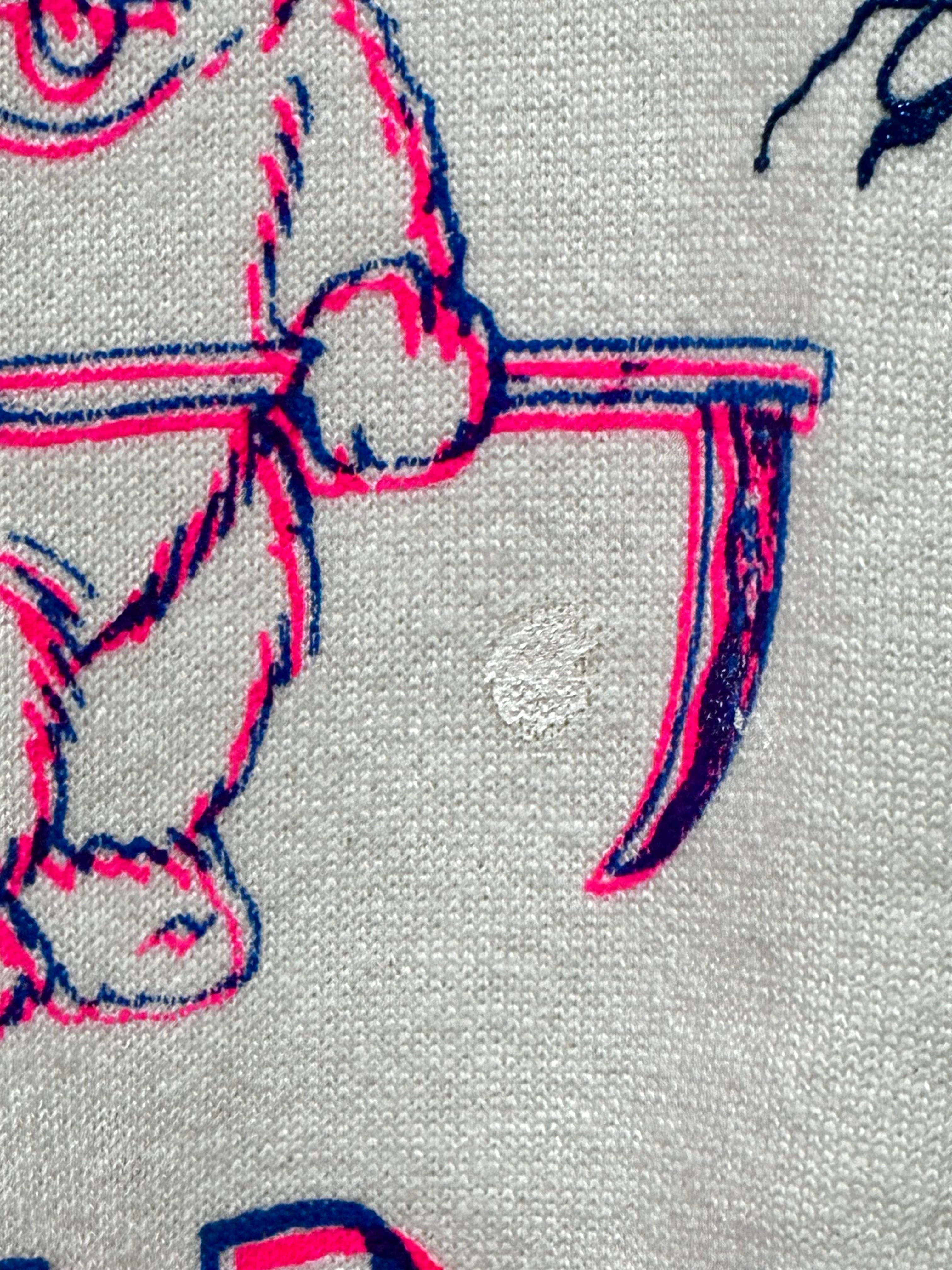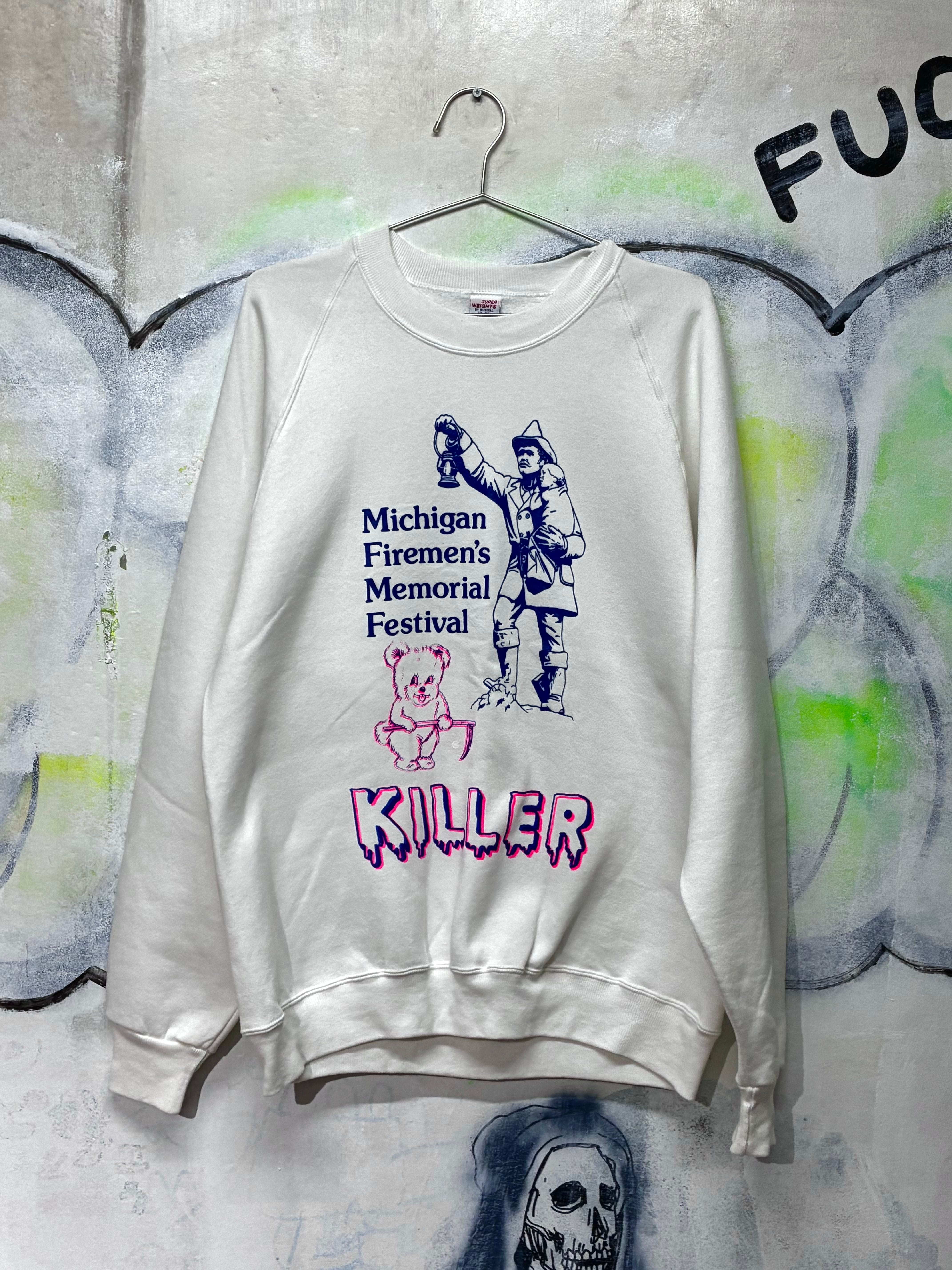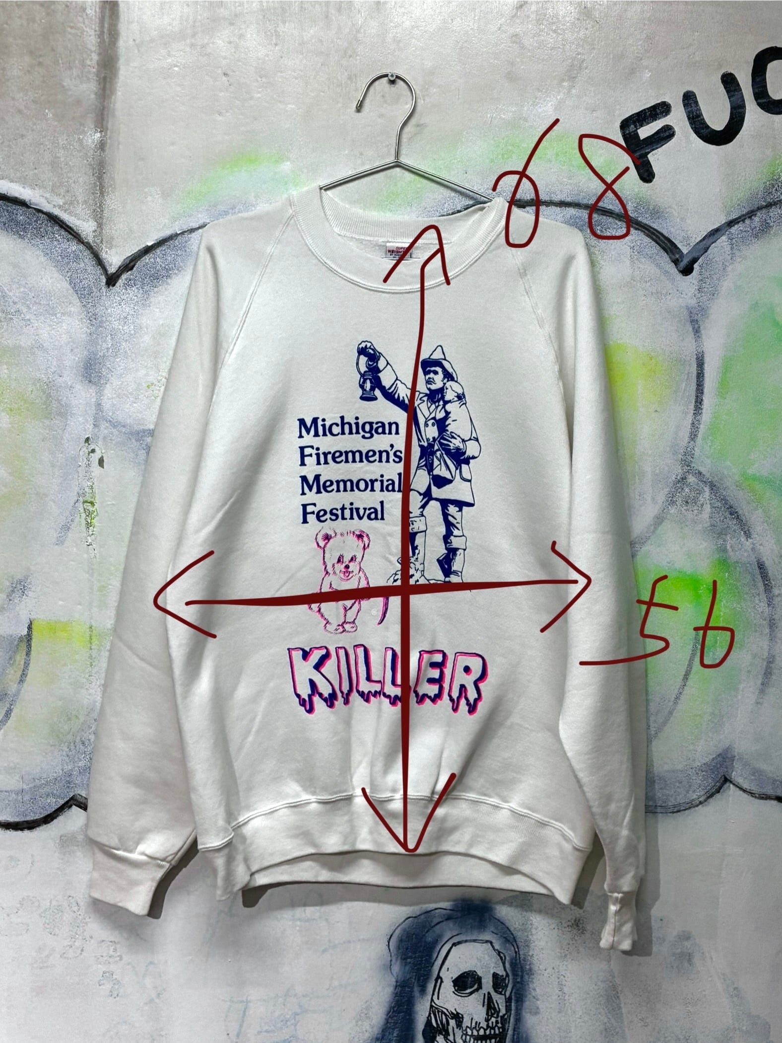 古着にシルク印刷でタトゥーを入れています。ミシガン州に、犠牲になった消防士たちを追悼する記念碑があり、その追悼セレモニーのスウェットです。そんなものにKILLER とはなんだ、と私も思います。可愛いクマちゃんに免じて許してください。