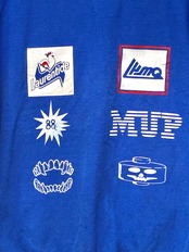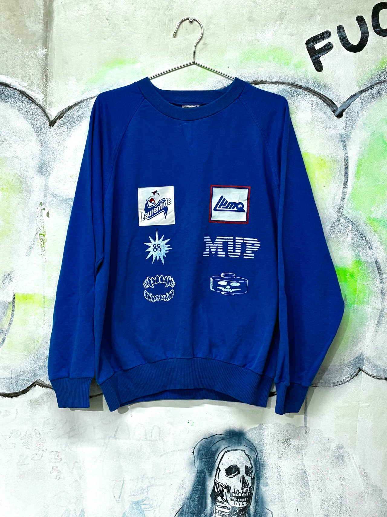 古着にシルク印刷でタトゥーを入れています。ニワトリマークのブランドle coqかと思いきや違うようです。謎の絵柄達がニセモノ臭さを増幅させて、なんかすごくカッコいいです。