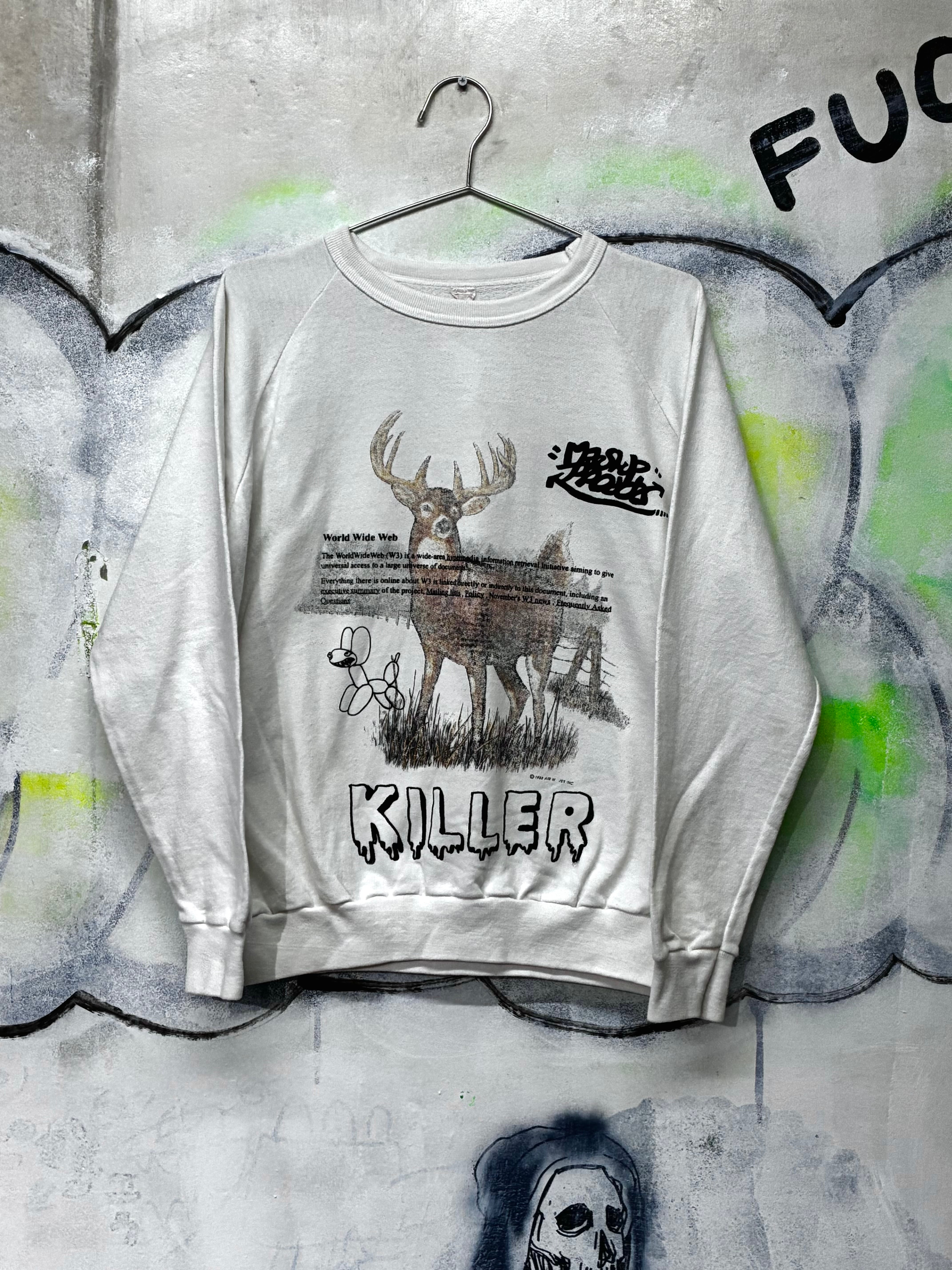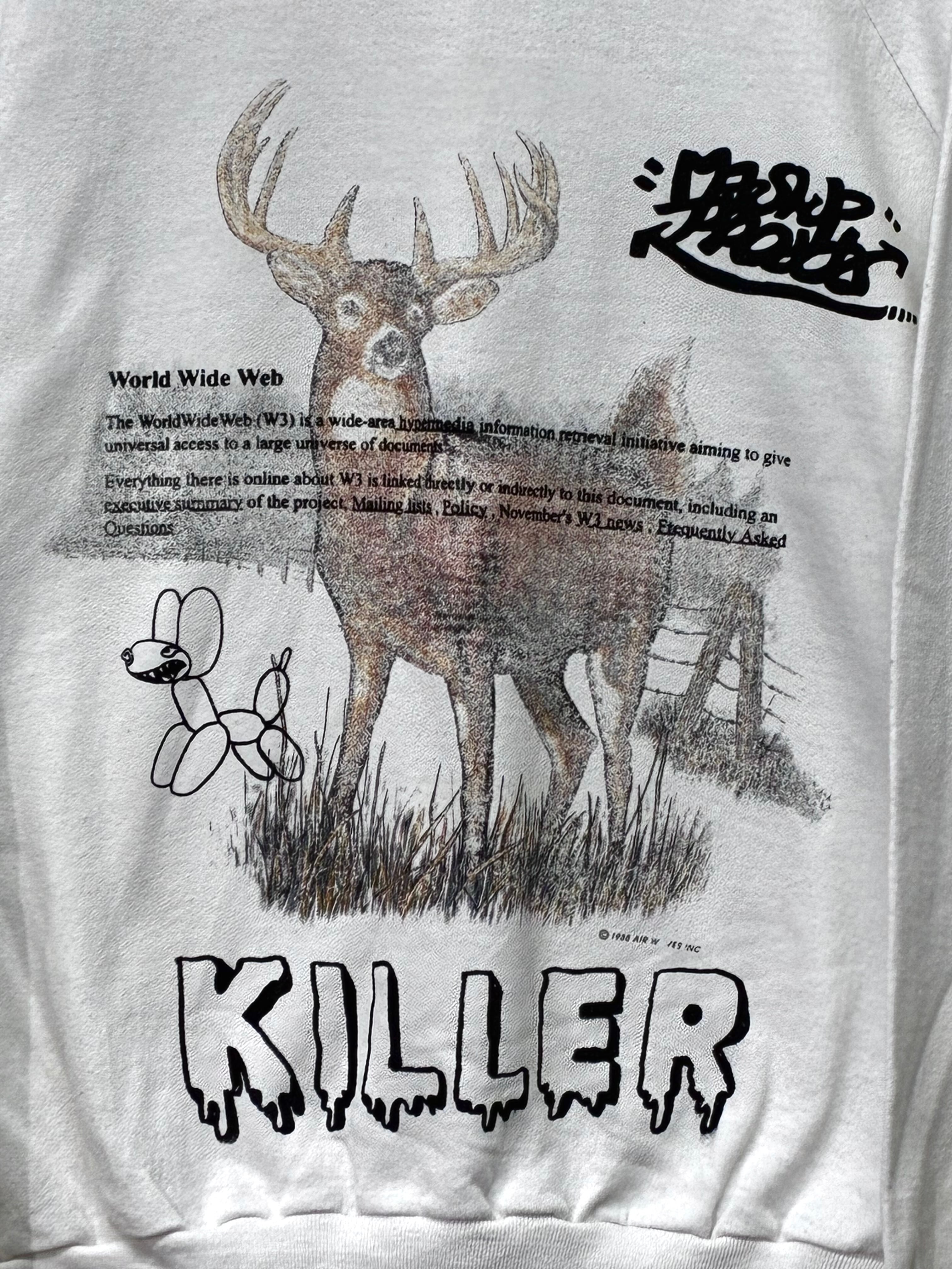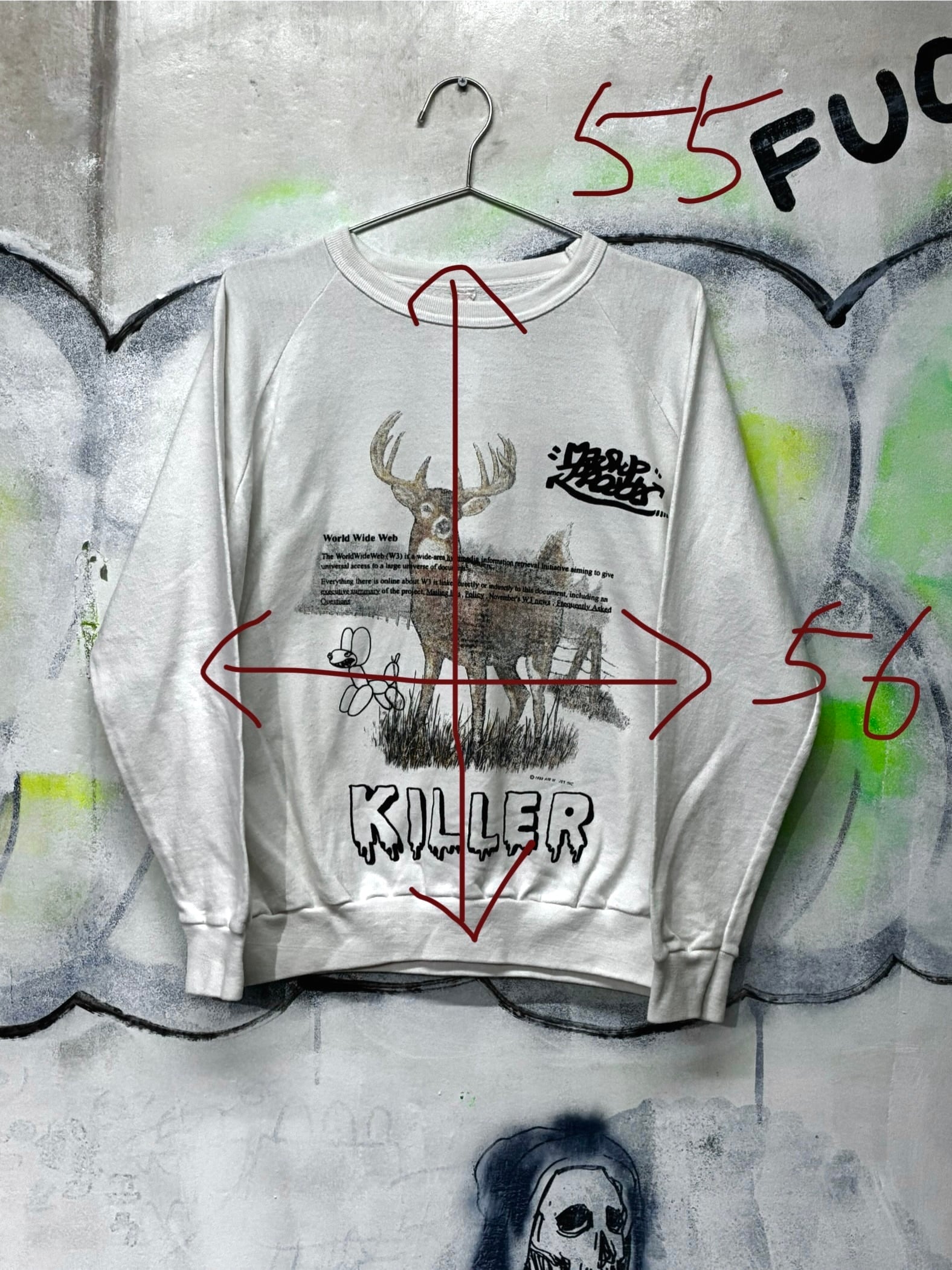 古着にシルク印刷でタトゥーを入れています。ハンティング系のスウェット。鹿に被せてworld wide web の開発理念の一部が書かれています。KILLERは、鹿が言ってるとしたら、人殺しじゃなくて鹿殺しですね。