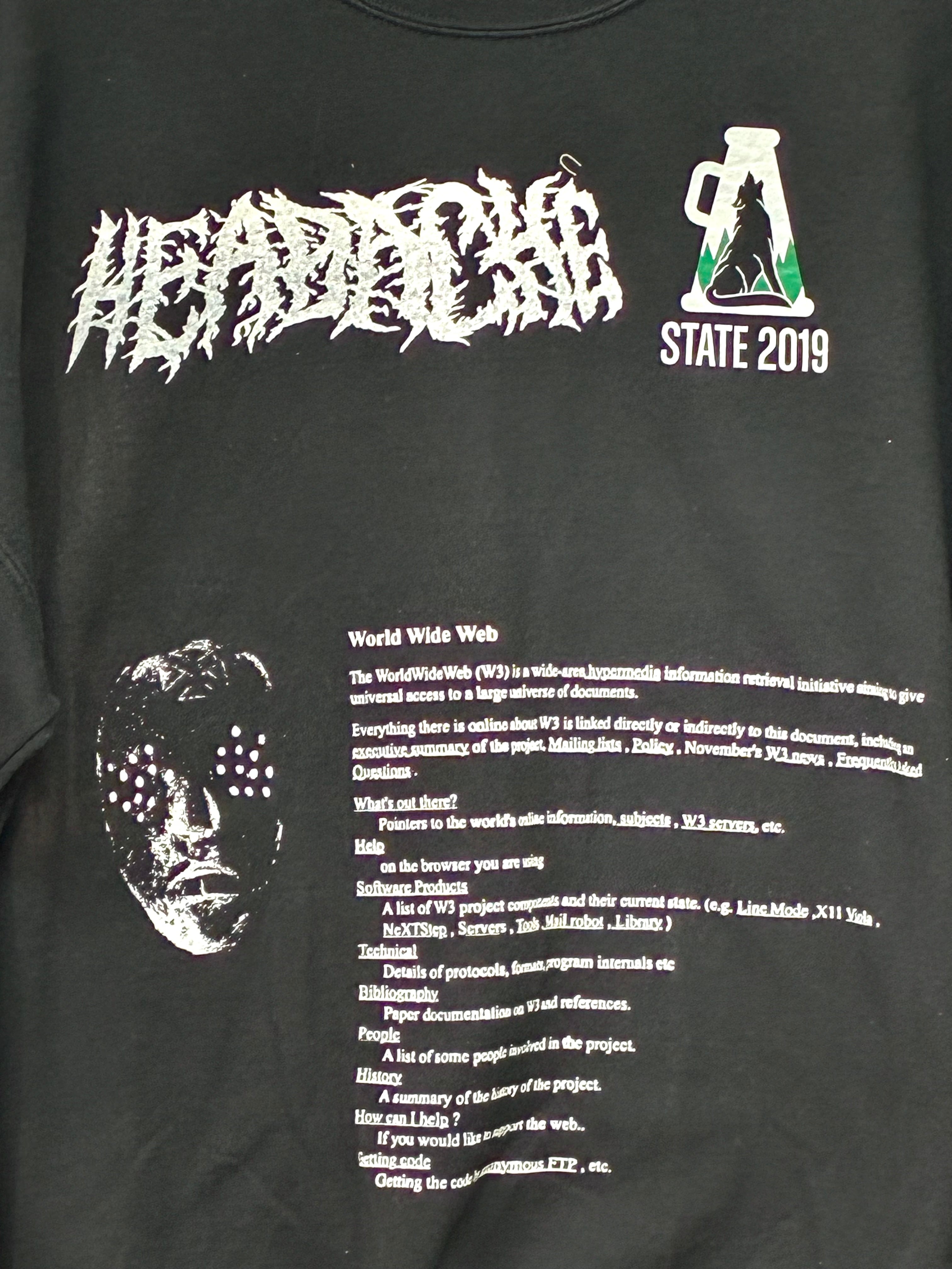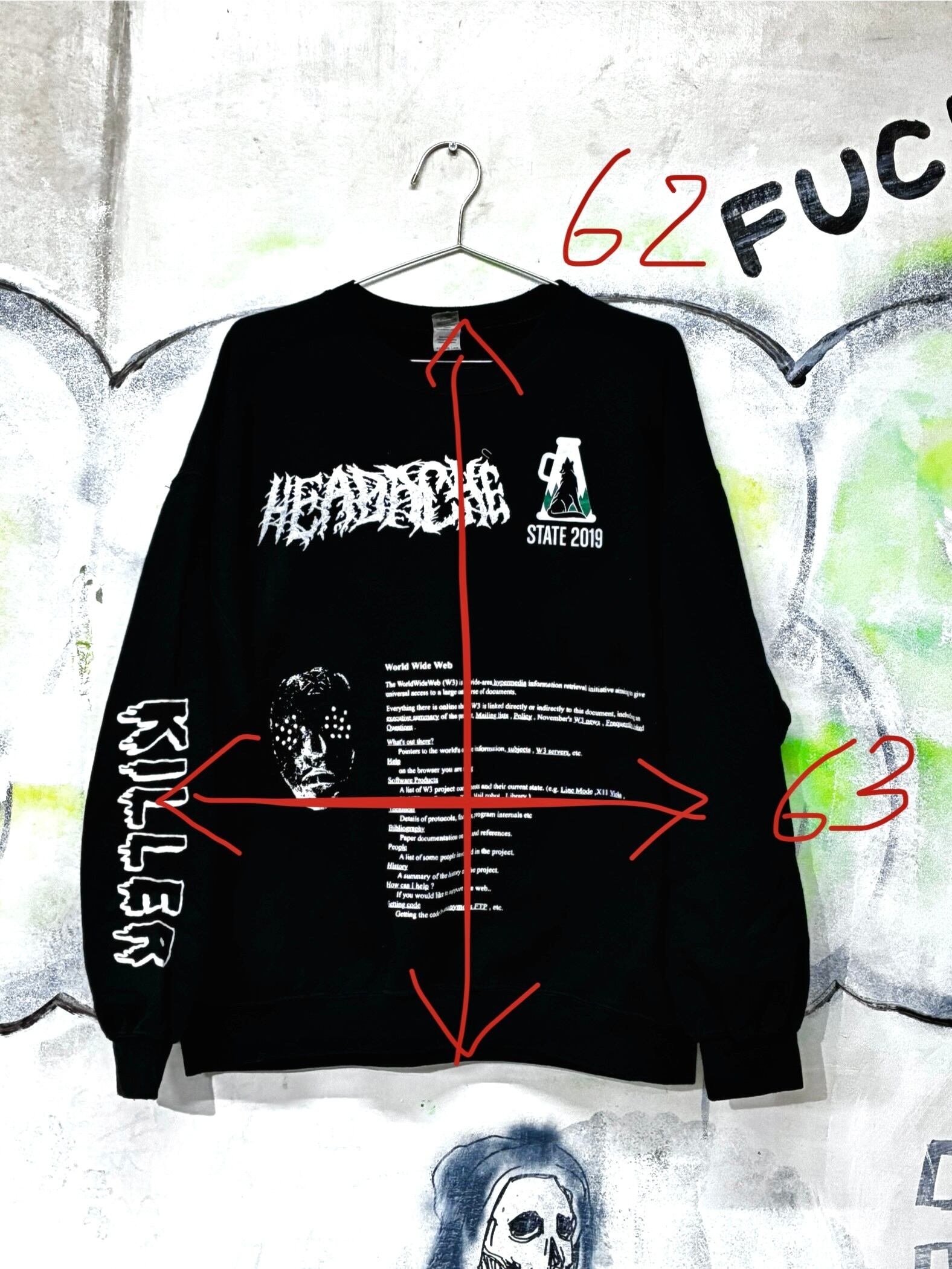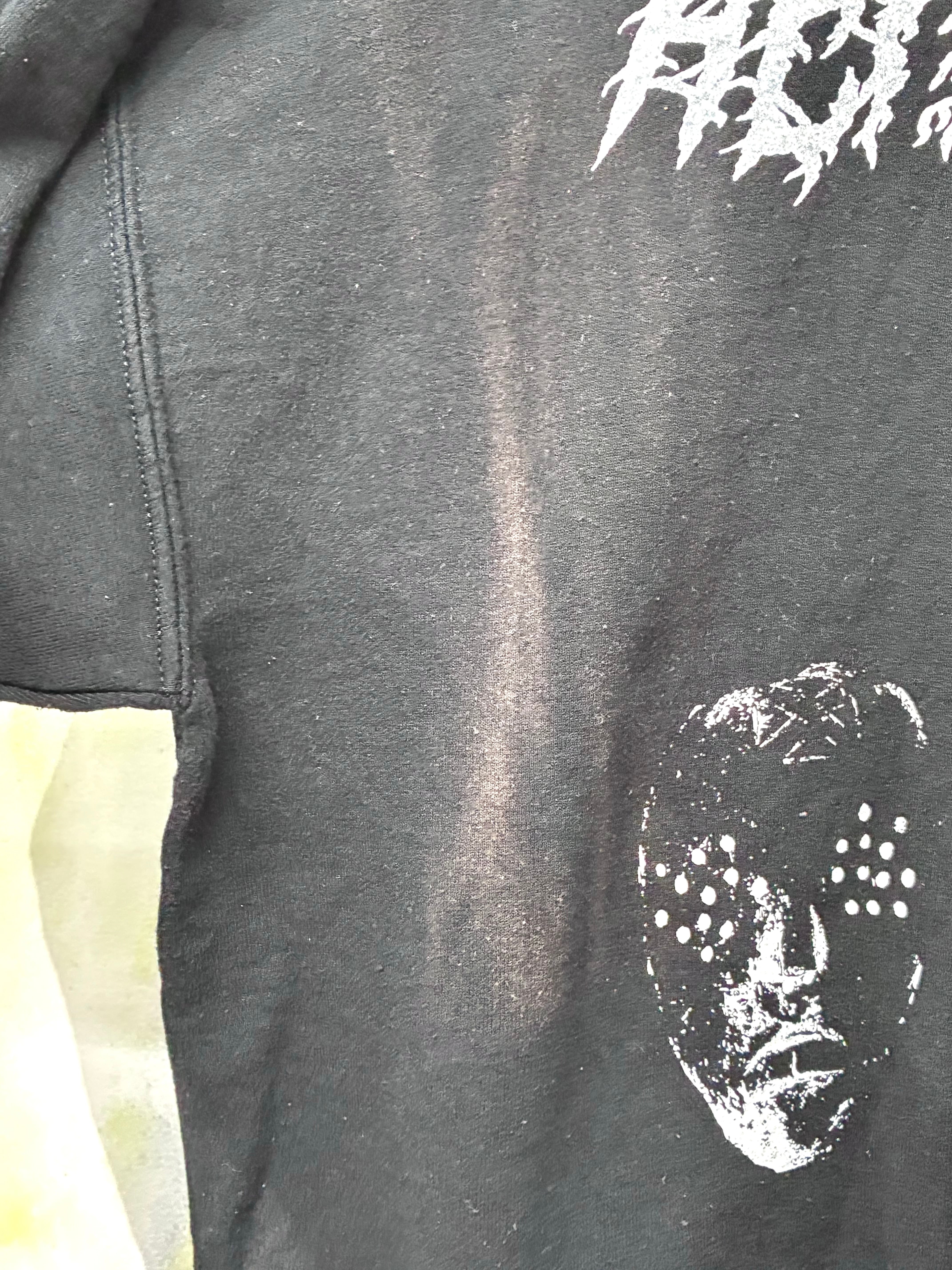 古着にシルク印刷でタトゥーを入れています。全米の高校スポーツ・吹奏楽・学力競技などの州大会(State tournament)のスウェットと思われます。爽やかなルーツなのでとりあえず不気味な感じにしておきました。バックの英字の意味はよく分かりませんが、何だか意気込みがあることはわかりました。