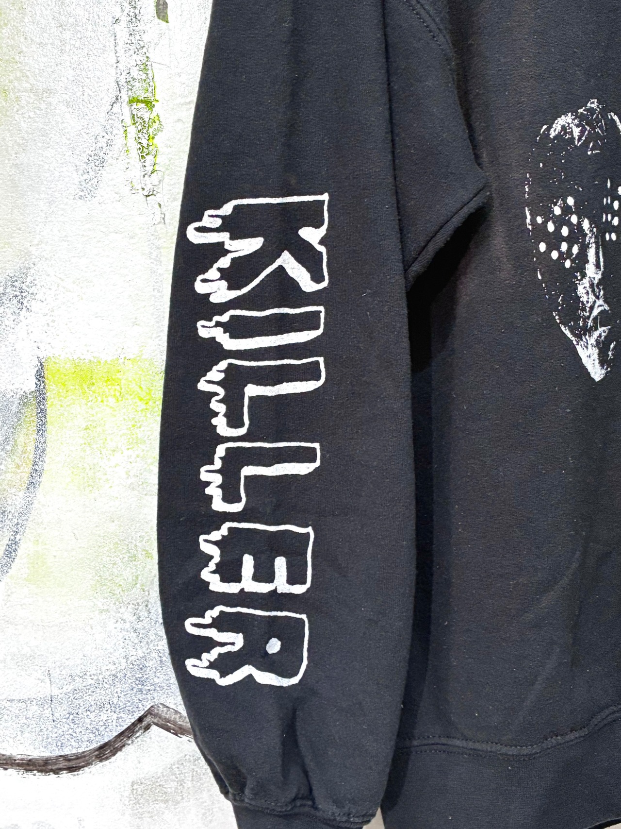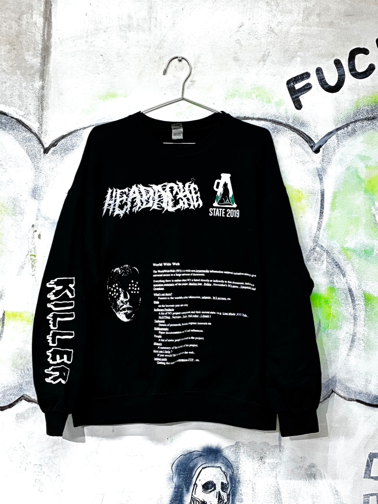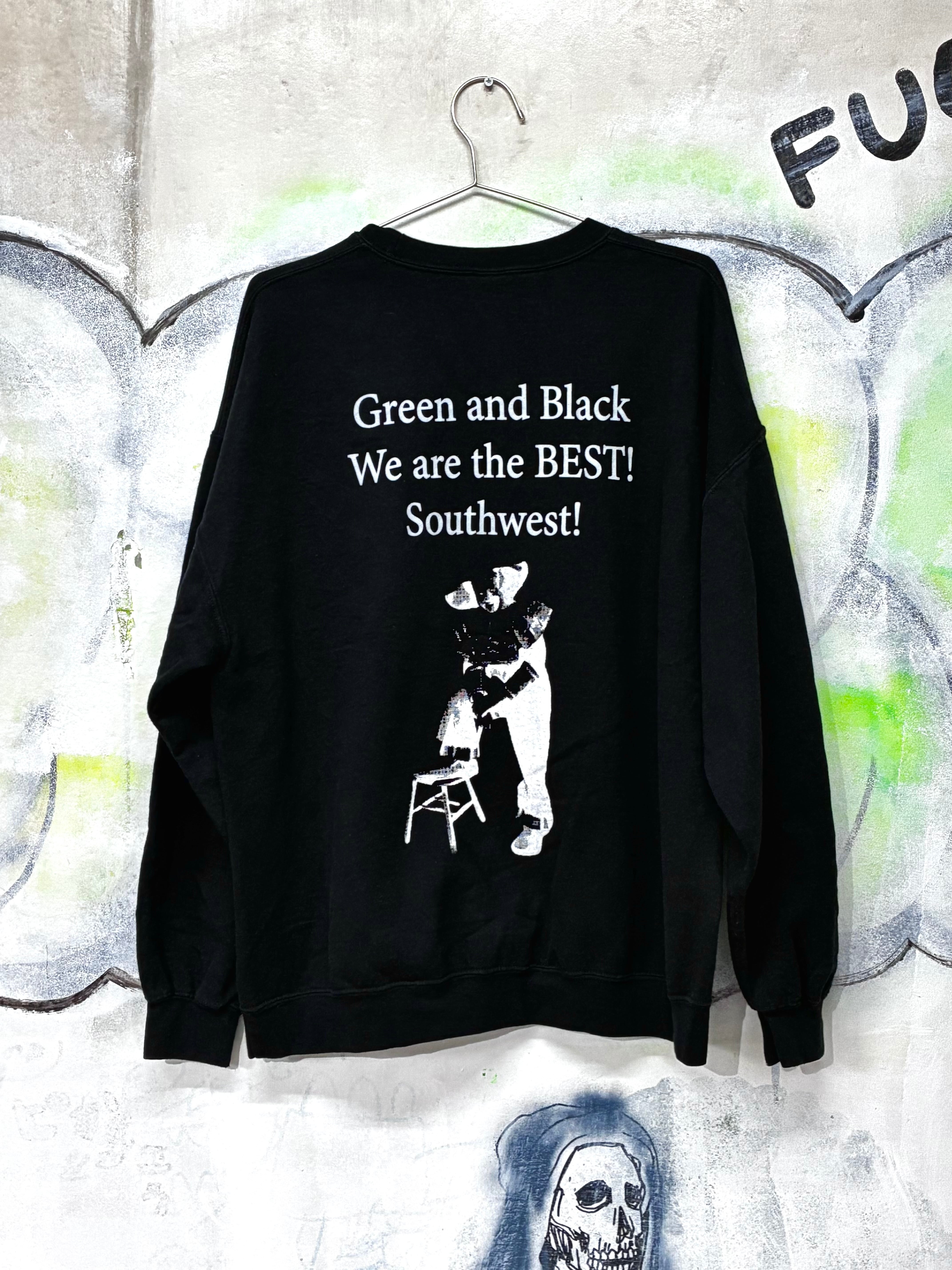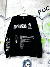 古着にシルク印刷でタトゥーを入れています。全米の高校スポーツ・吹奏楽・学力競技などの州大会(State tournament)のスウェットと思われます。爽やかなルーツなのでとりあえず不気味な感じにしておきました。バックの英字の意味はよく分かりませんが、何だか意気込みがあることはわかりました。