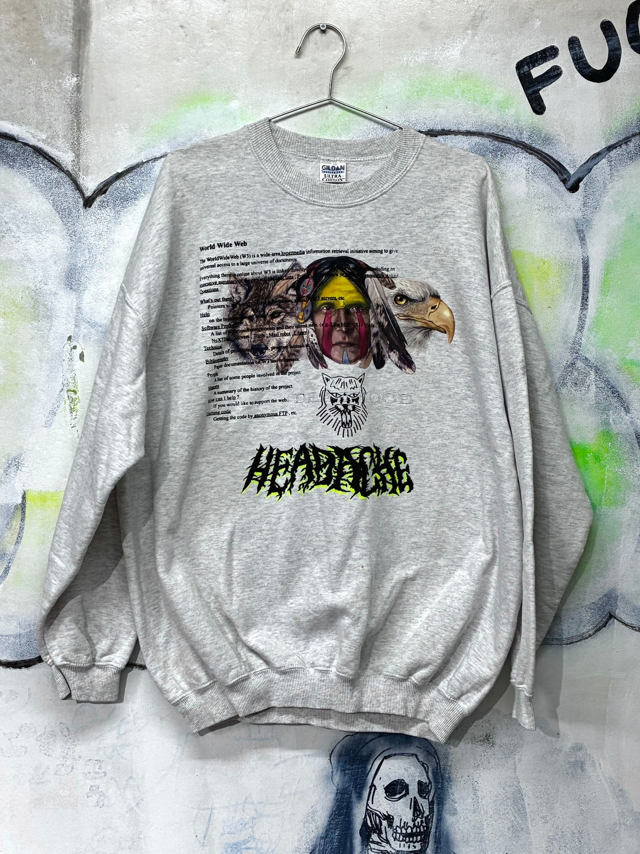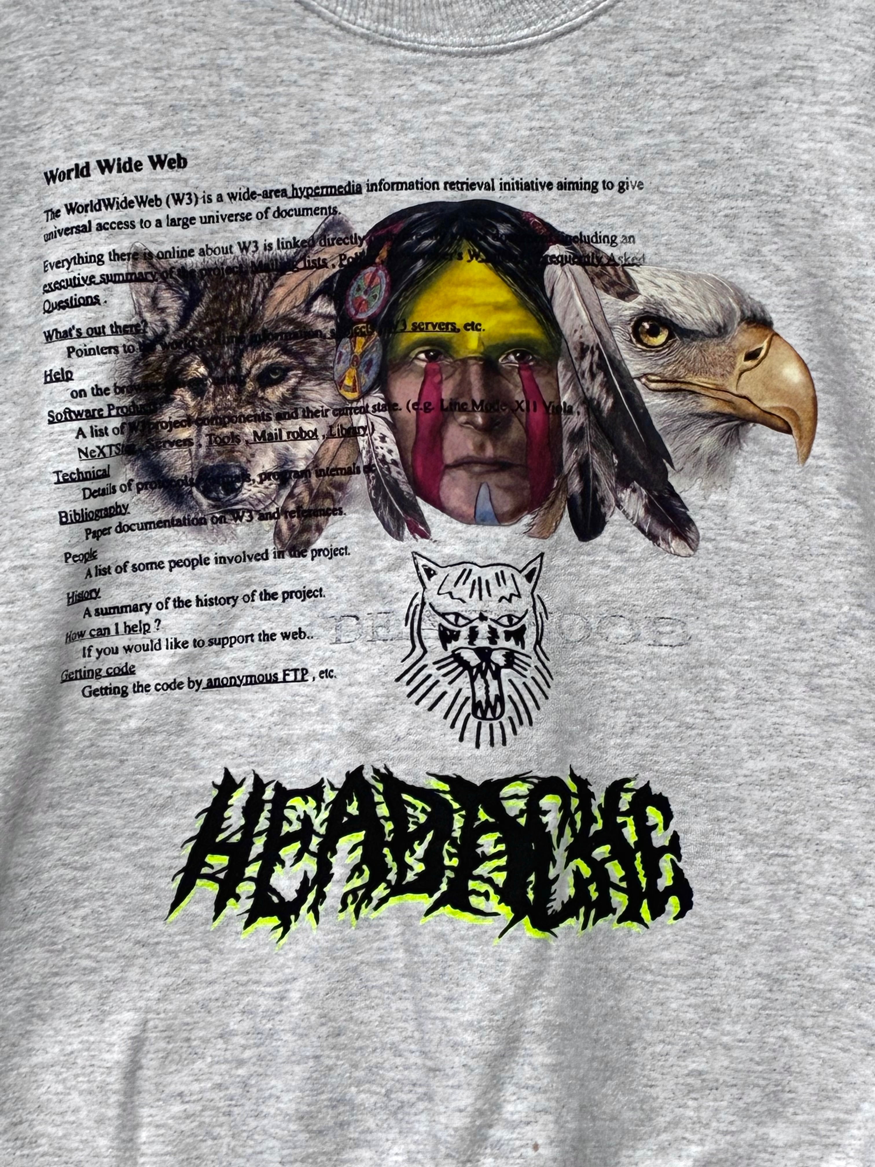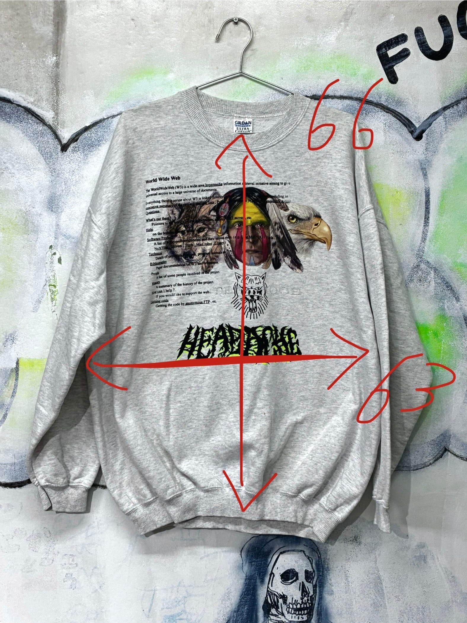 古着にシルク印刷でタトゥーを入れています。ネイティヴアメリカン+狼+鷲=土地に根差しがち3兄弟スウェットです。そこに重なる英字は、world wide webの基本理念です。滅びゆく時代とテクノロジーの悲哀を感じてください。