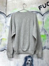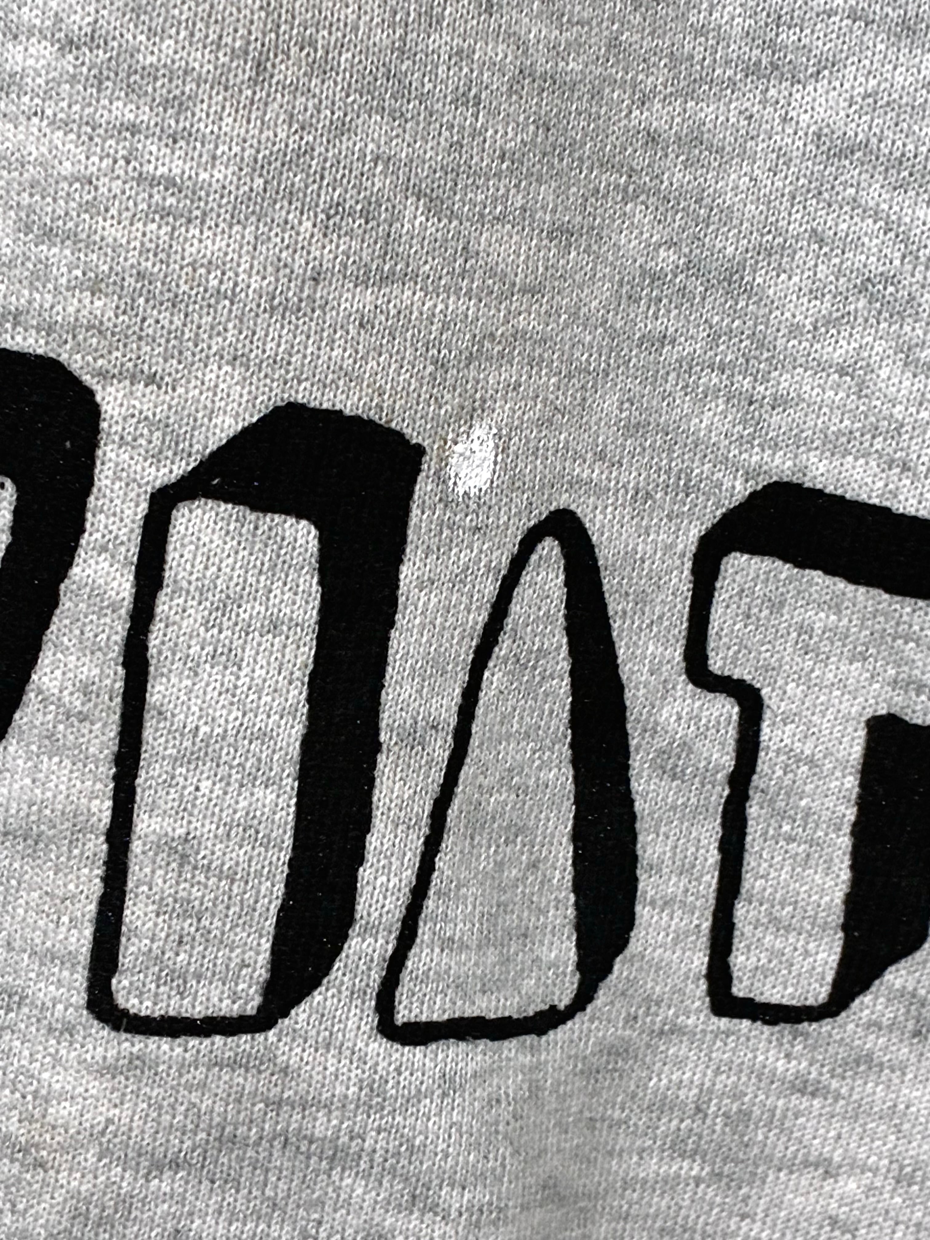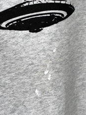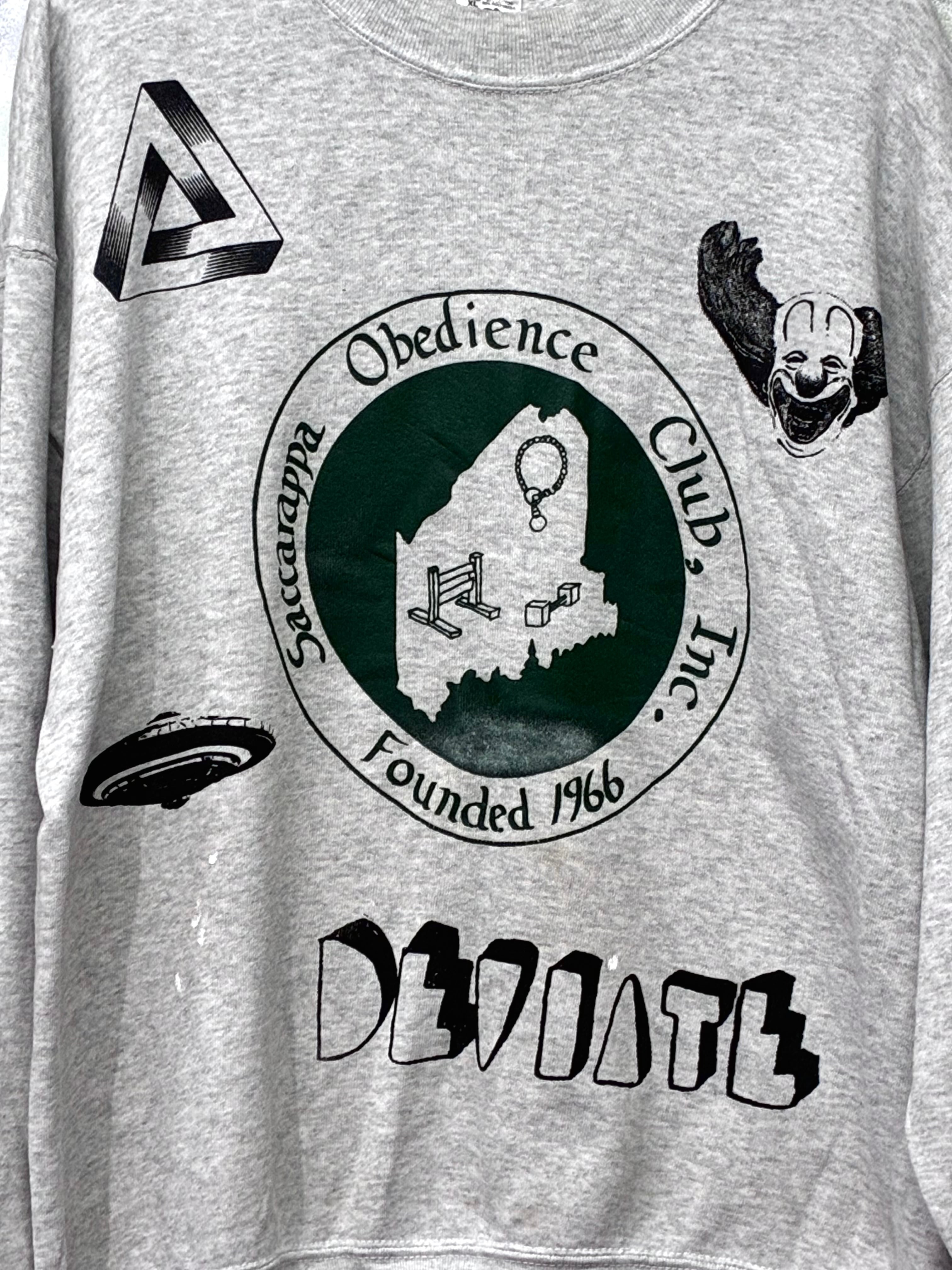 古着にシルク印刷でタトゥーを入れています。アメリカ・メイン州ポートランドにある犬のしつけ教室のスウェットです。最初、手柄が死刑台かと思って警戒しましたが、犬のしつけ用具でした。なので、ピエロや不可能図形、UFOなど、陰謀論的な不穏な雰囲気をプラスし、死刑台側に寄り戻しています。