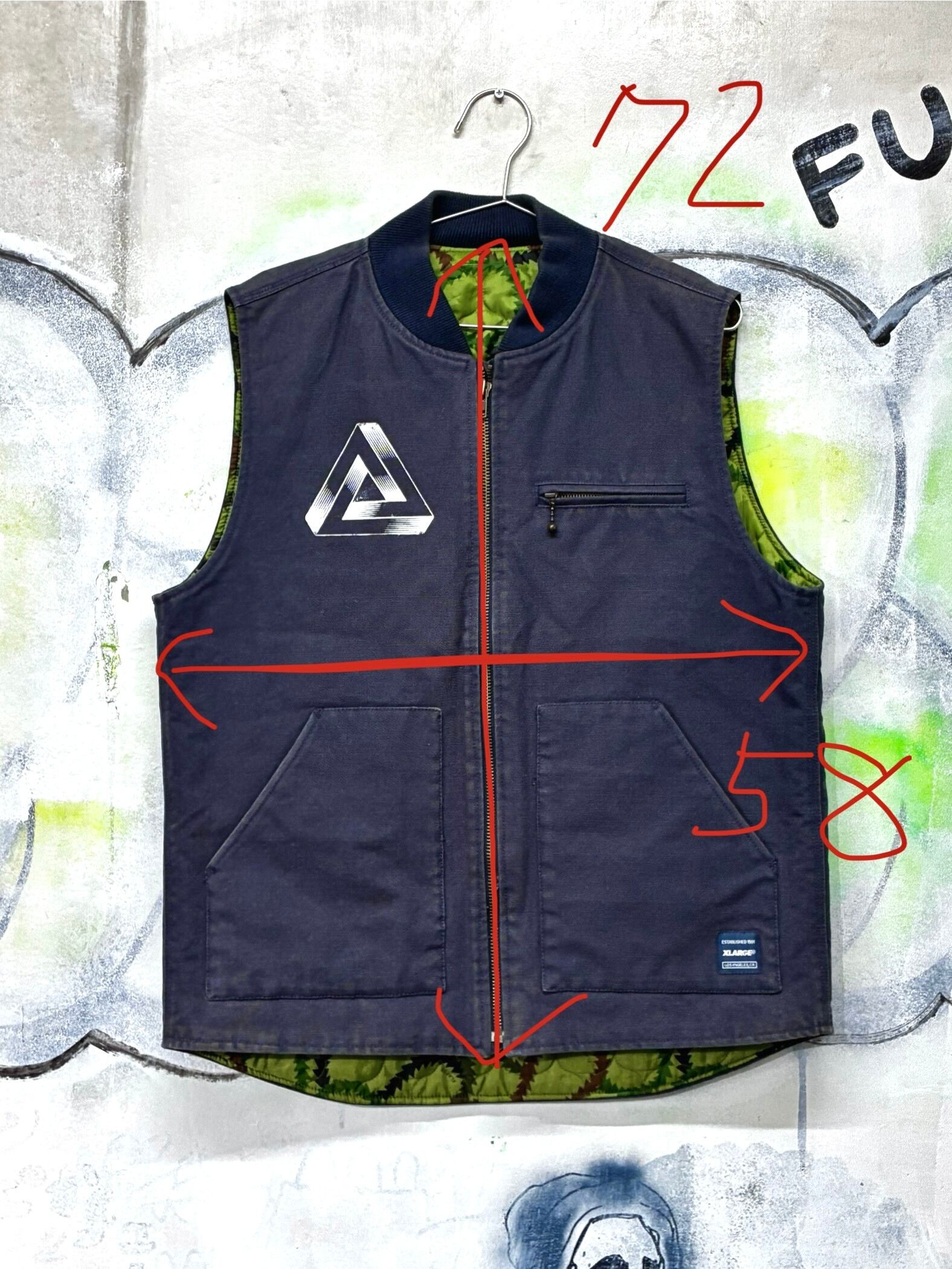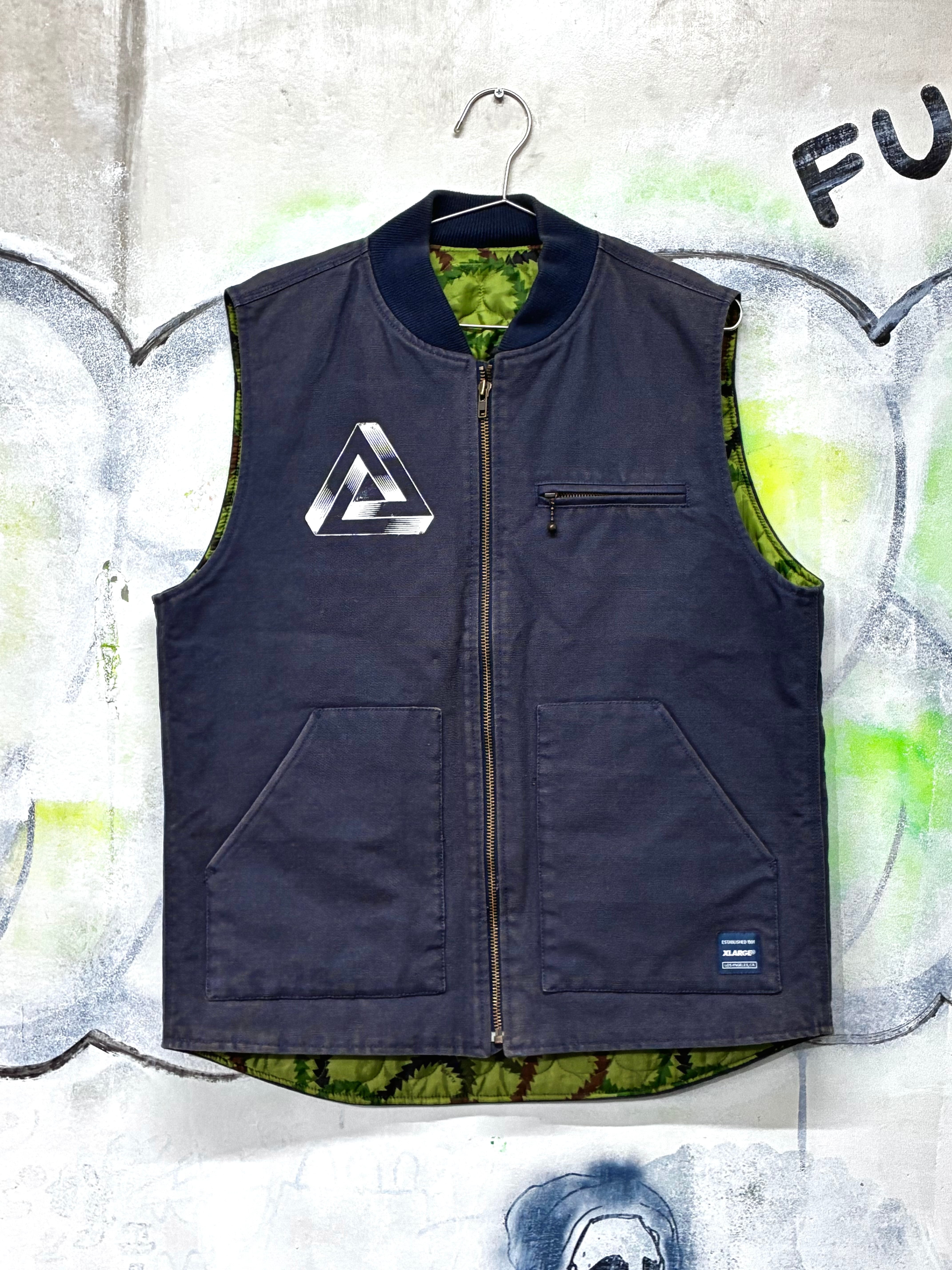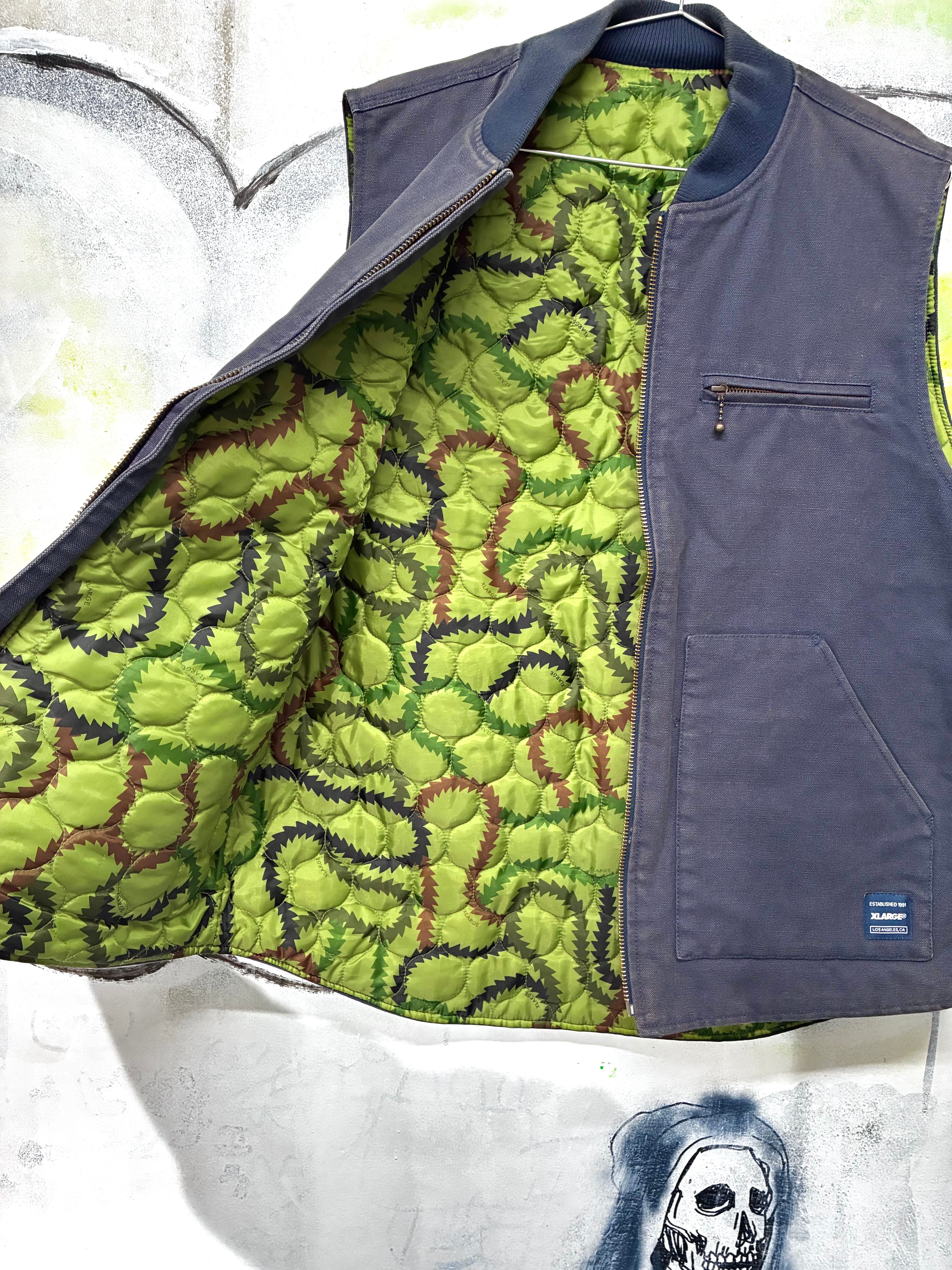 古着にシルク印刷でタトゥーを入れています。X-LARGEの中綿ベストです。裏の迷彩柄がかわいいです。リバーシブルできそうですが、チャックの仕様的にはできないです。