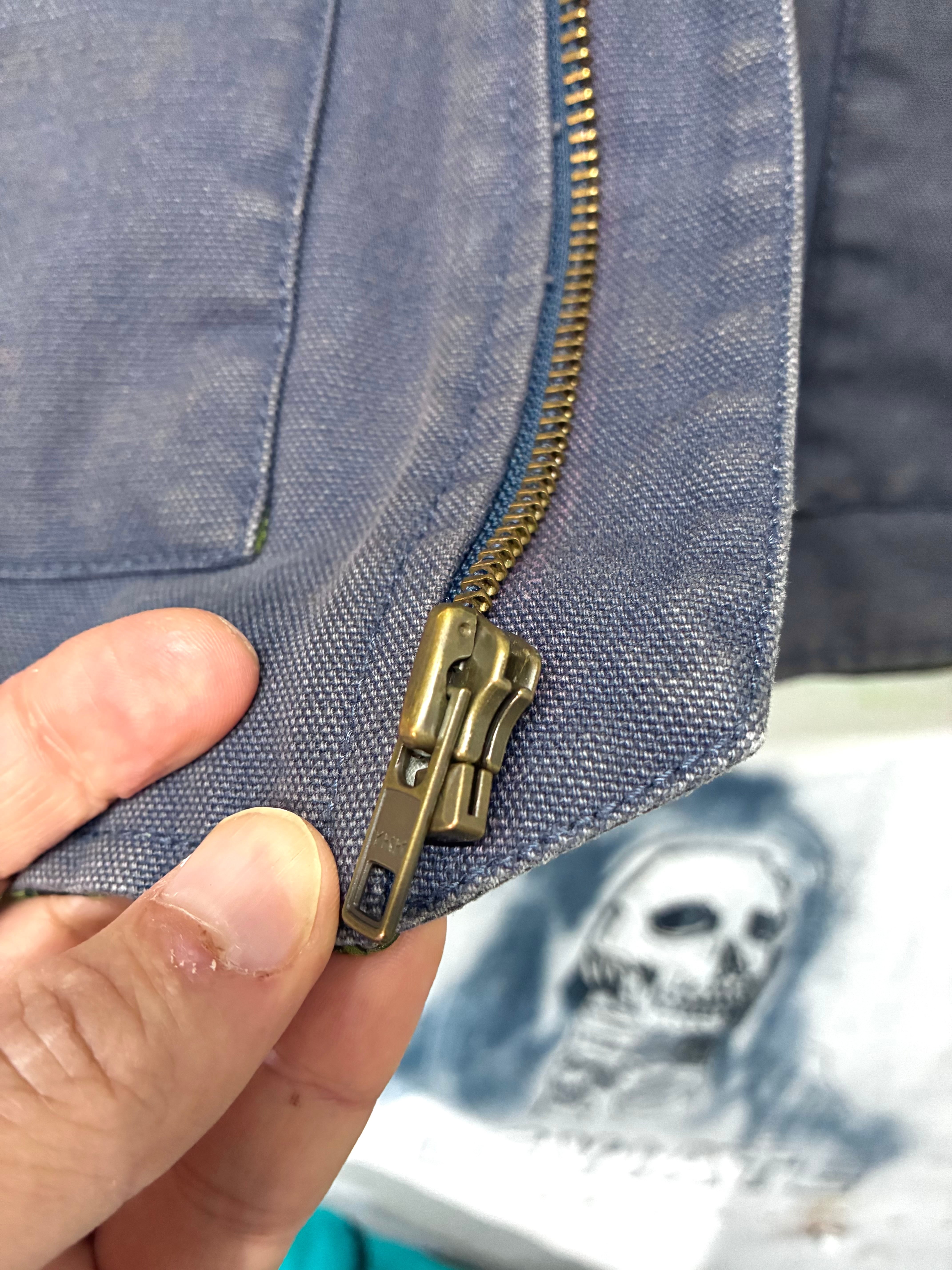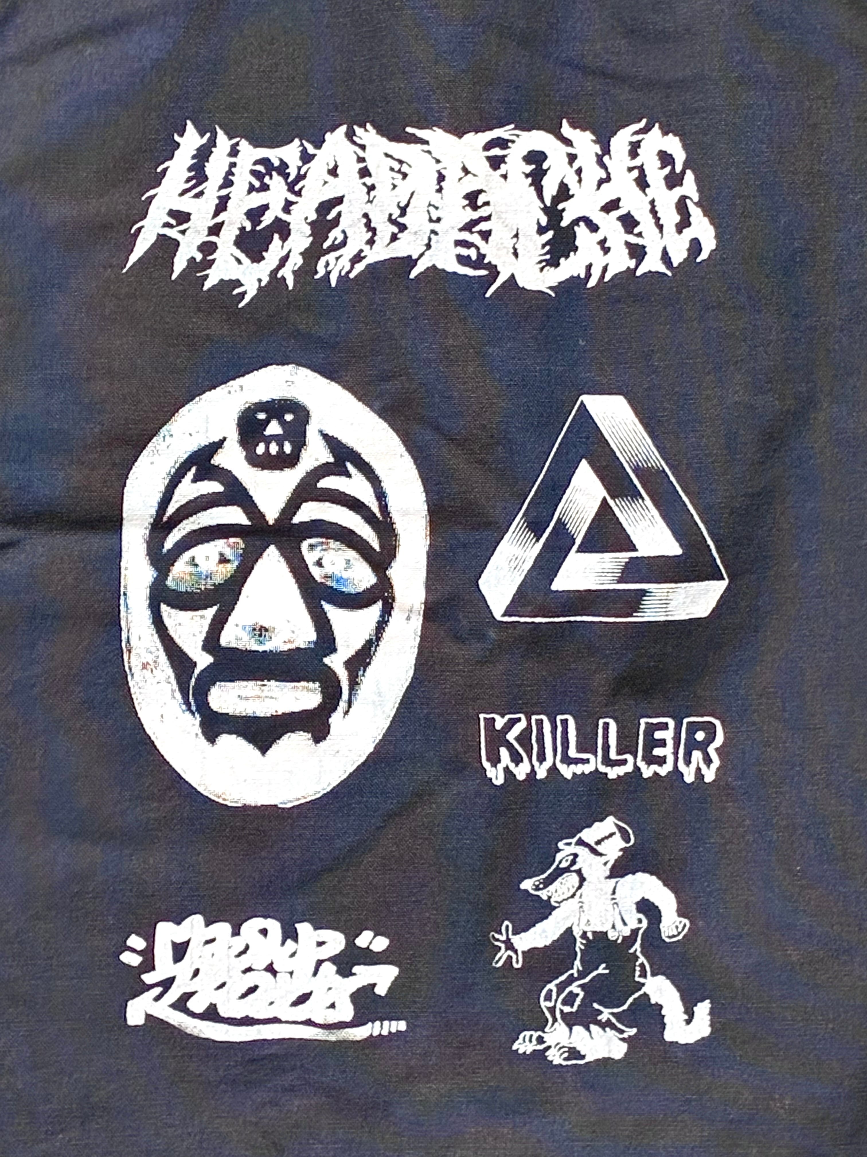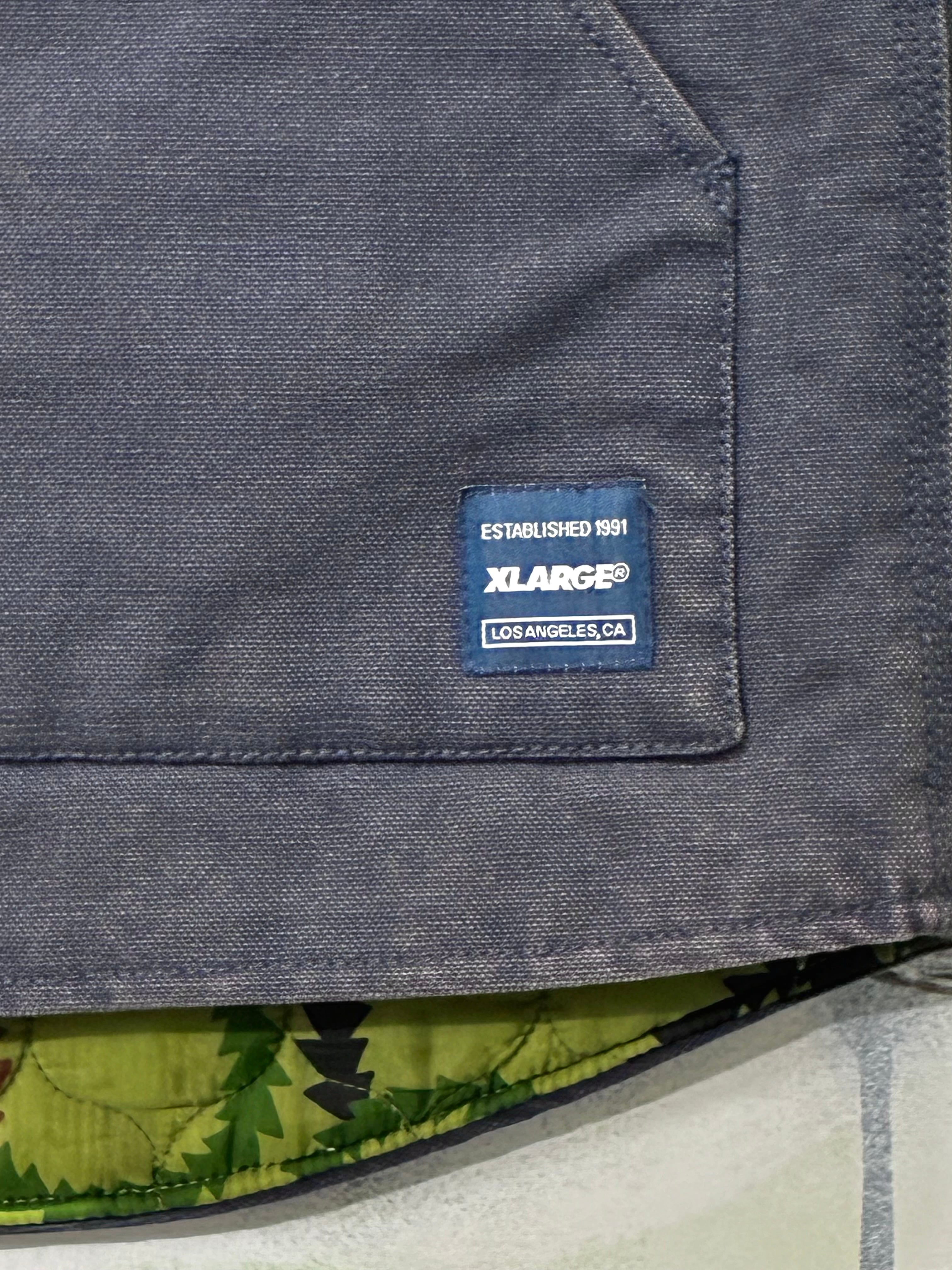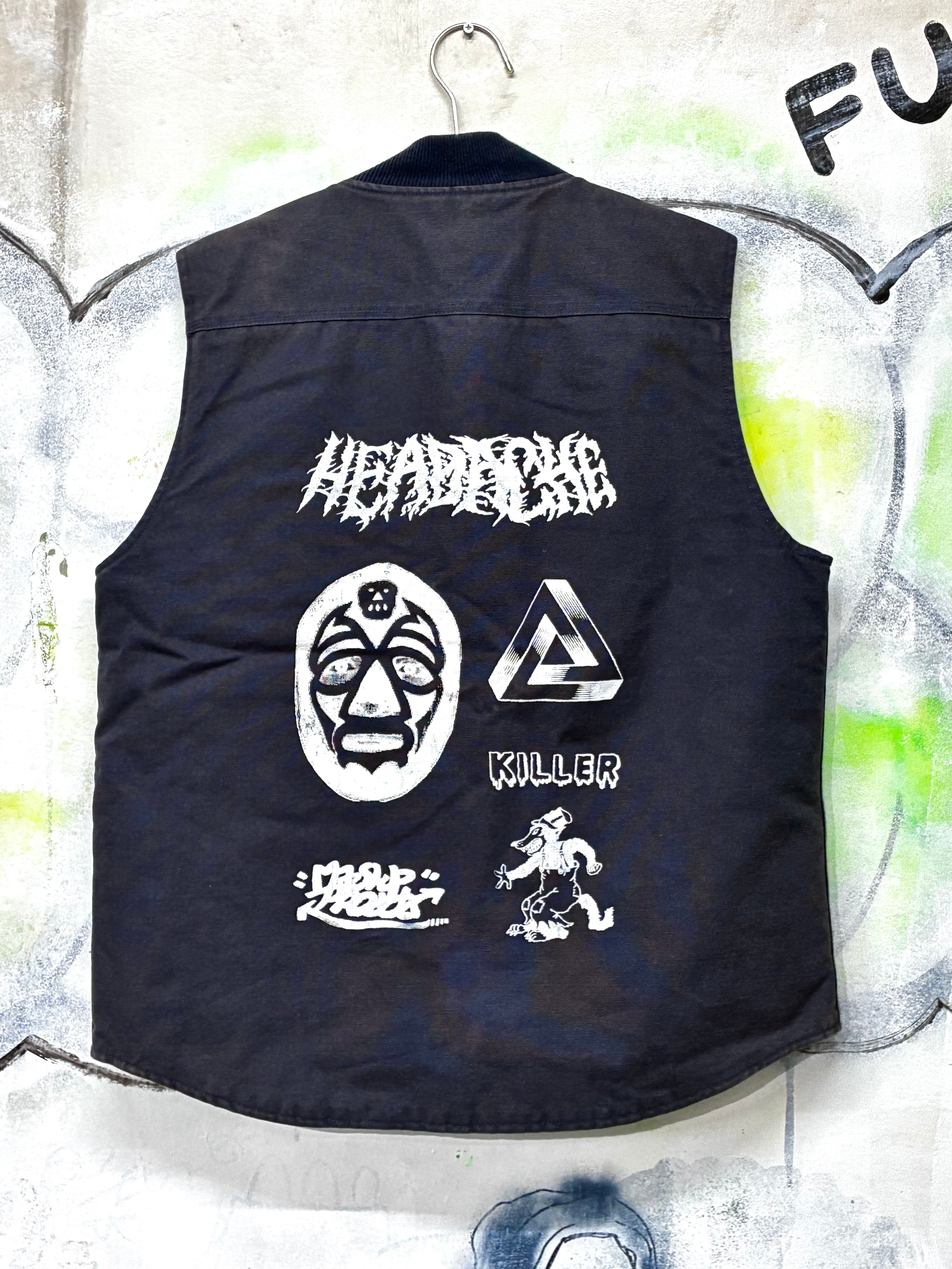古着にシルク印刷でタトゥーを入れています。X-LARGEの中綿ベストです。裏の迷彩柄がかわいいです。リバーシブルできそうですが、チャックの仕様的にはできないです。