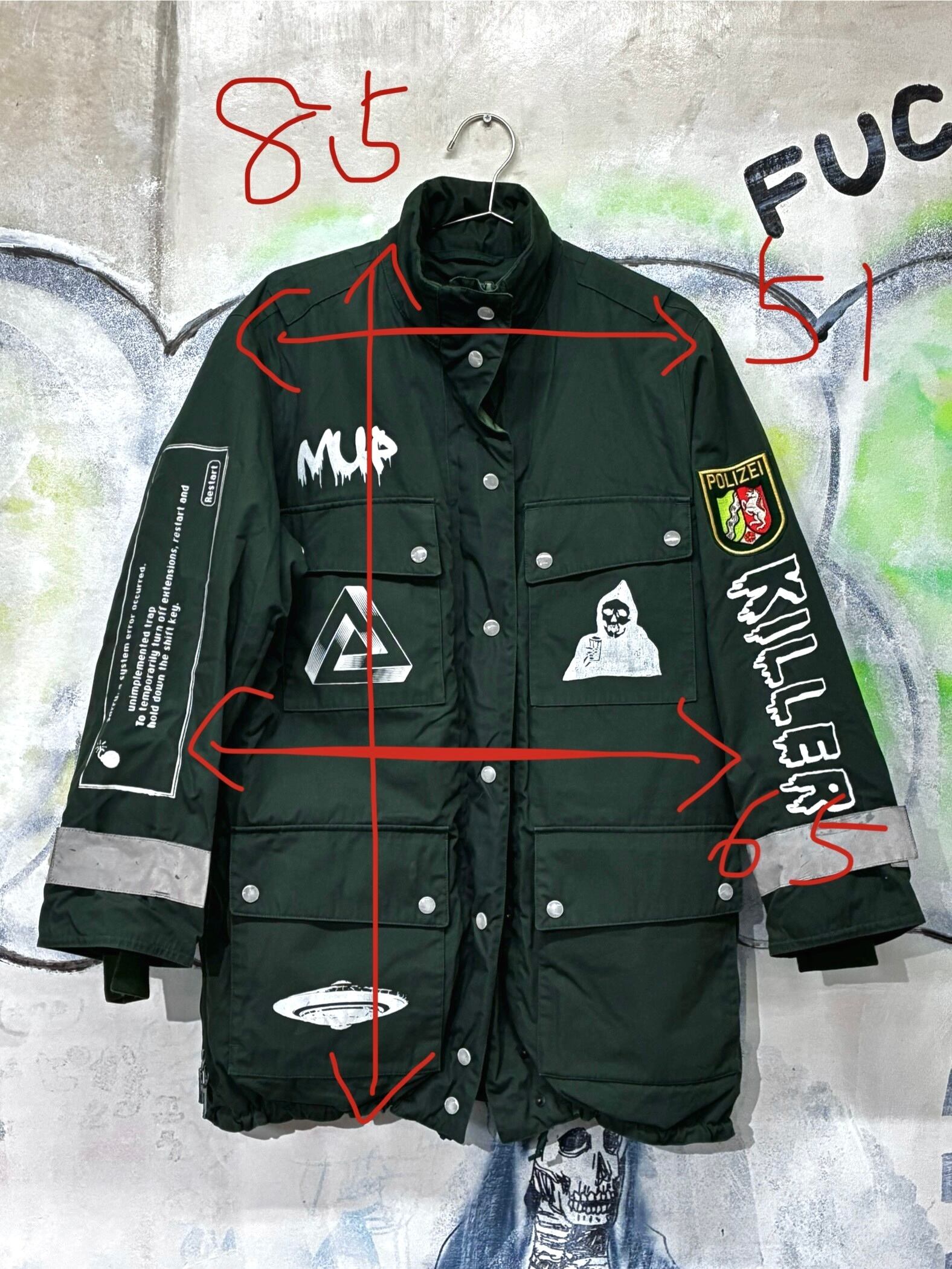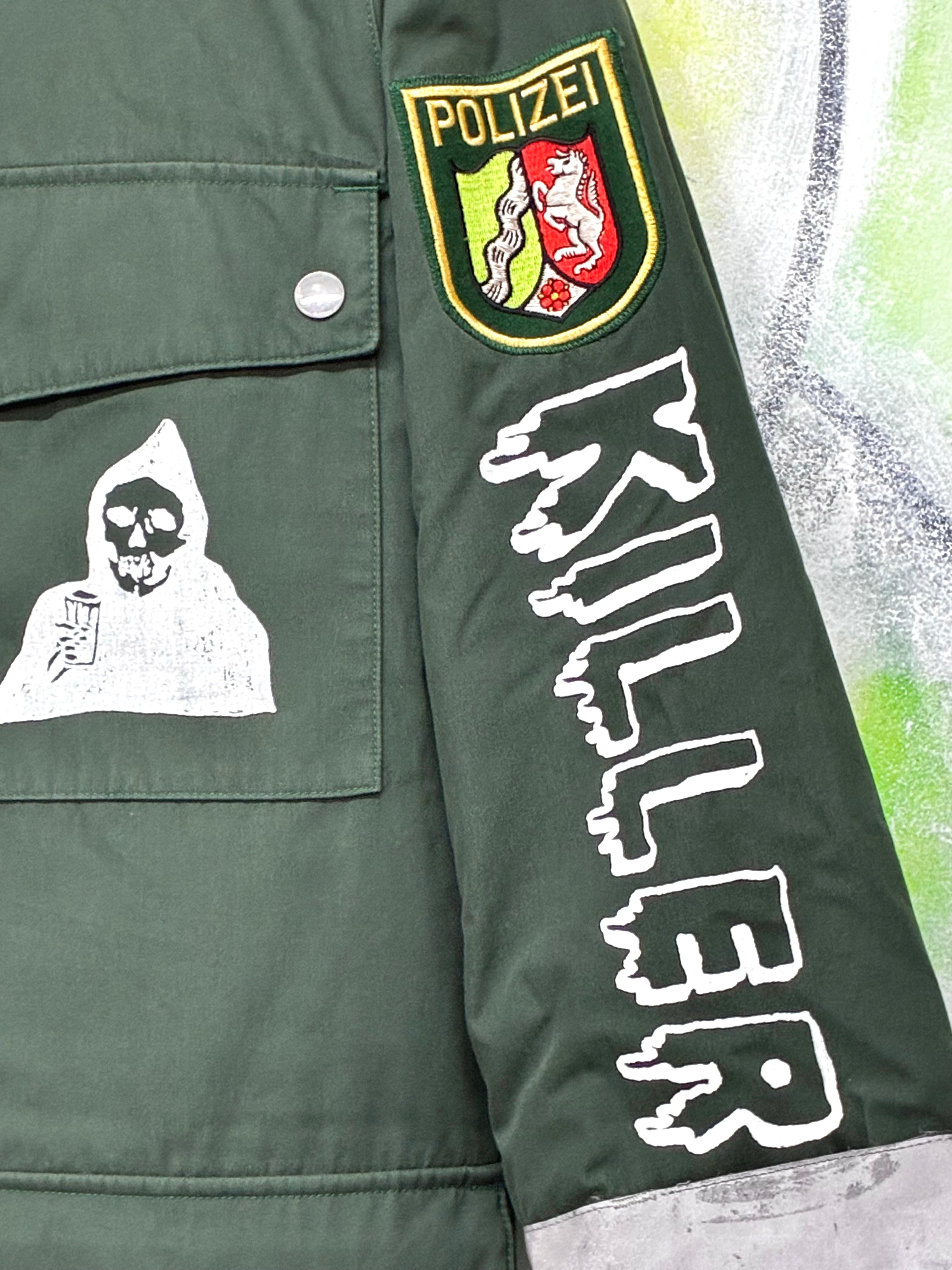左肩にPOLIZEIワッペン。フリースのライナーはジッパーで外せます。フードは切り取られていて、ありません。警察なのにKILLERというところでグッと来る人はご検討ください。