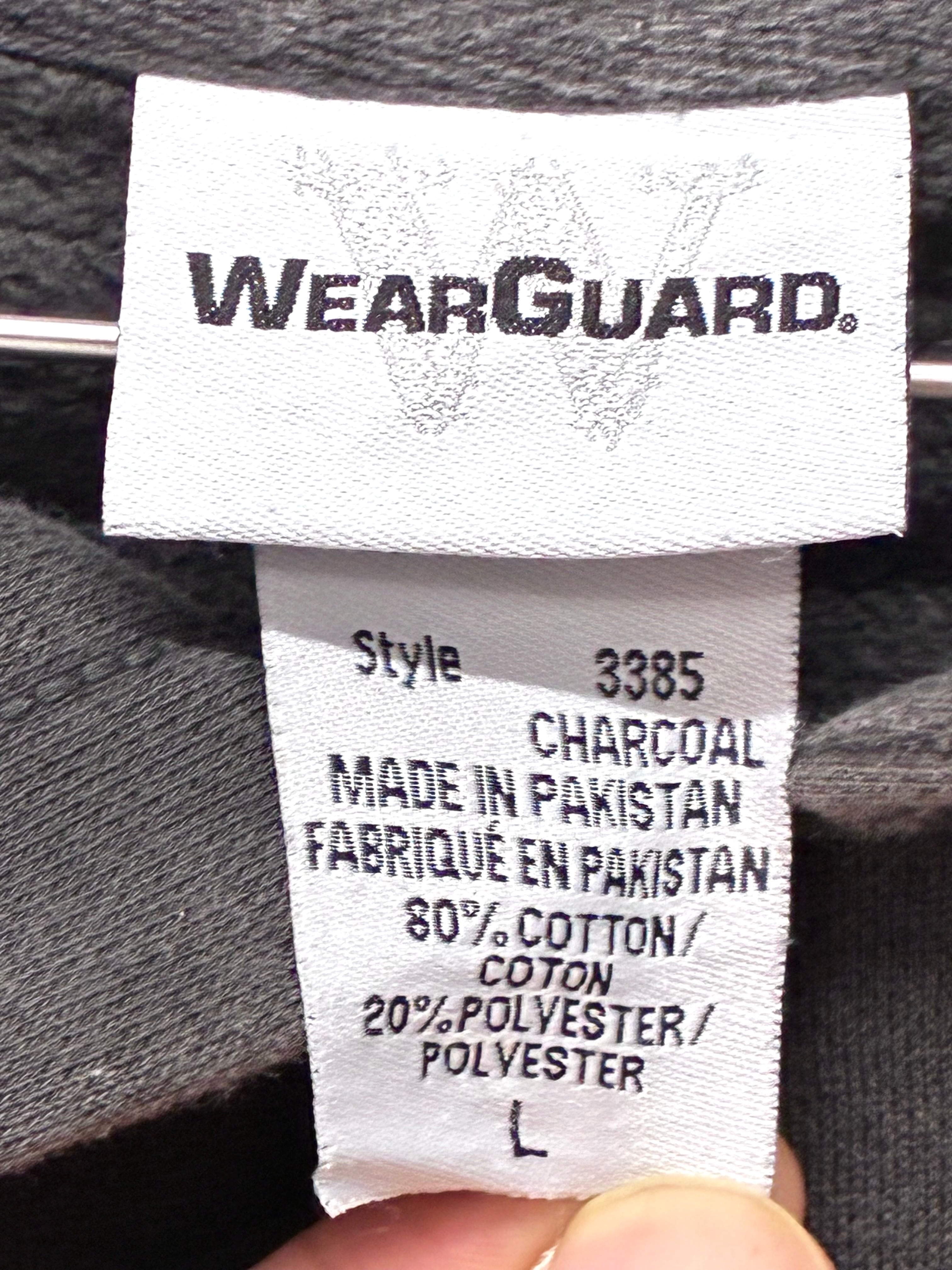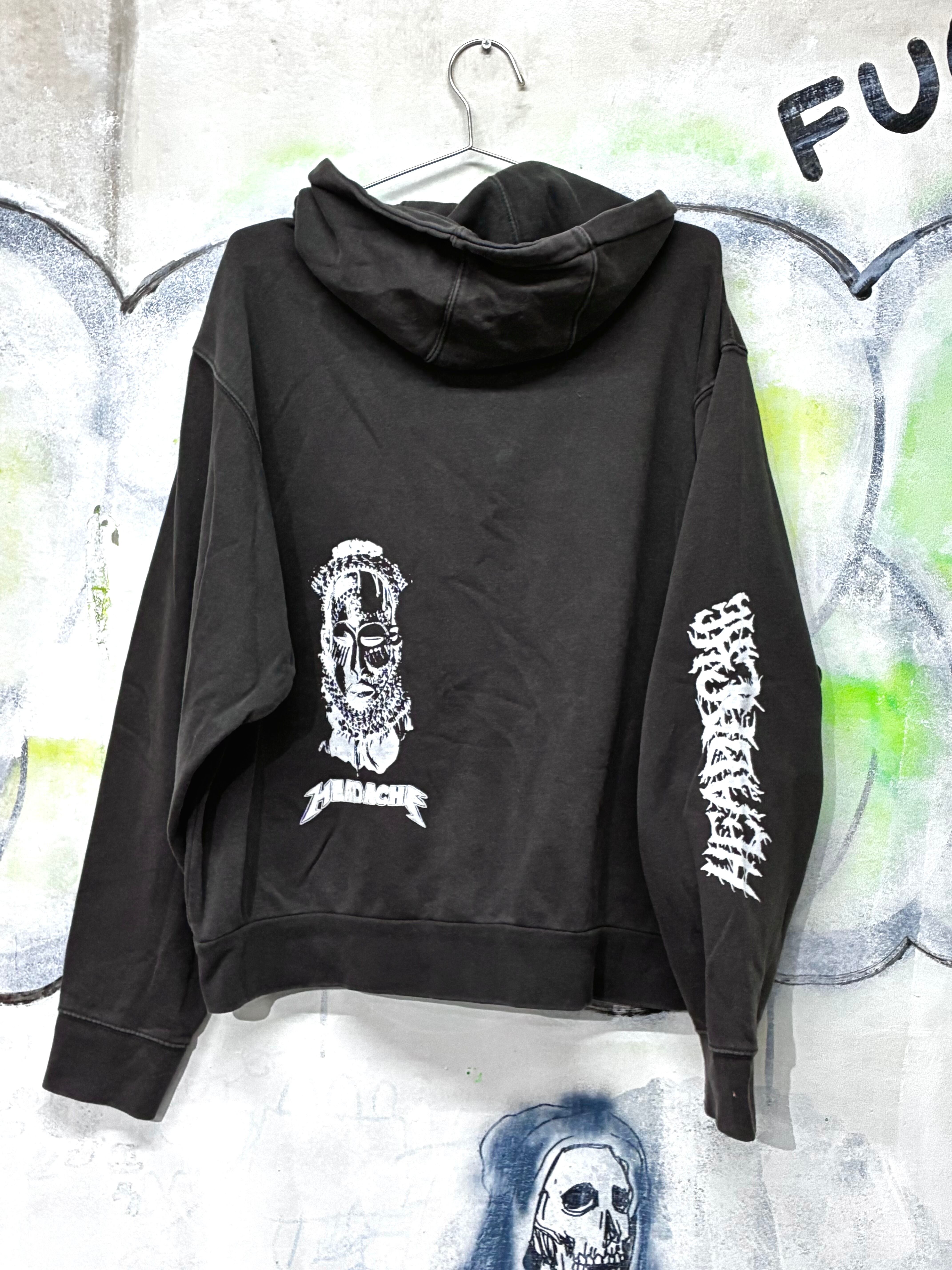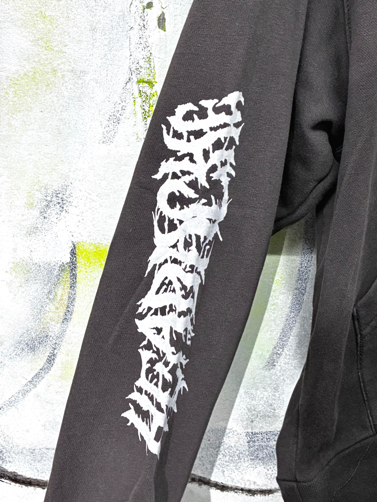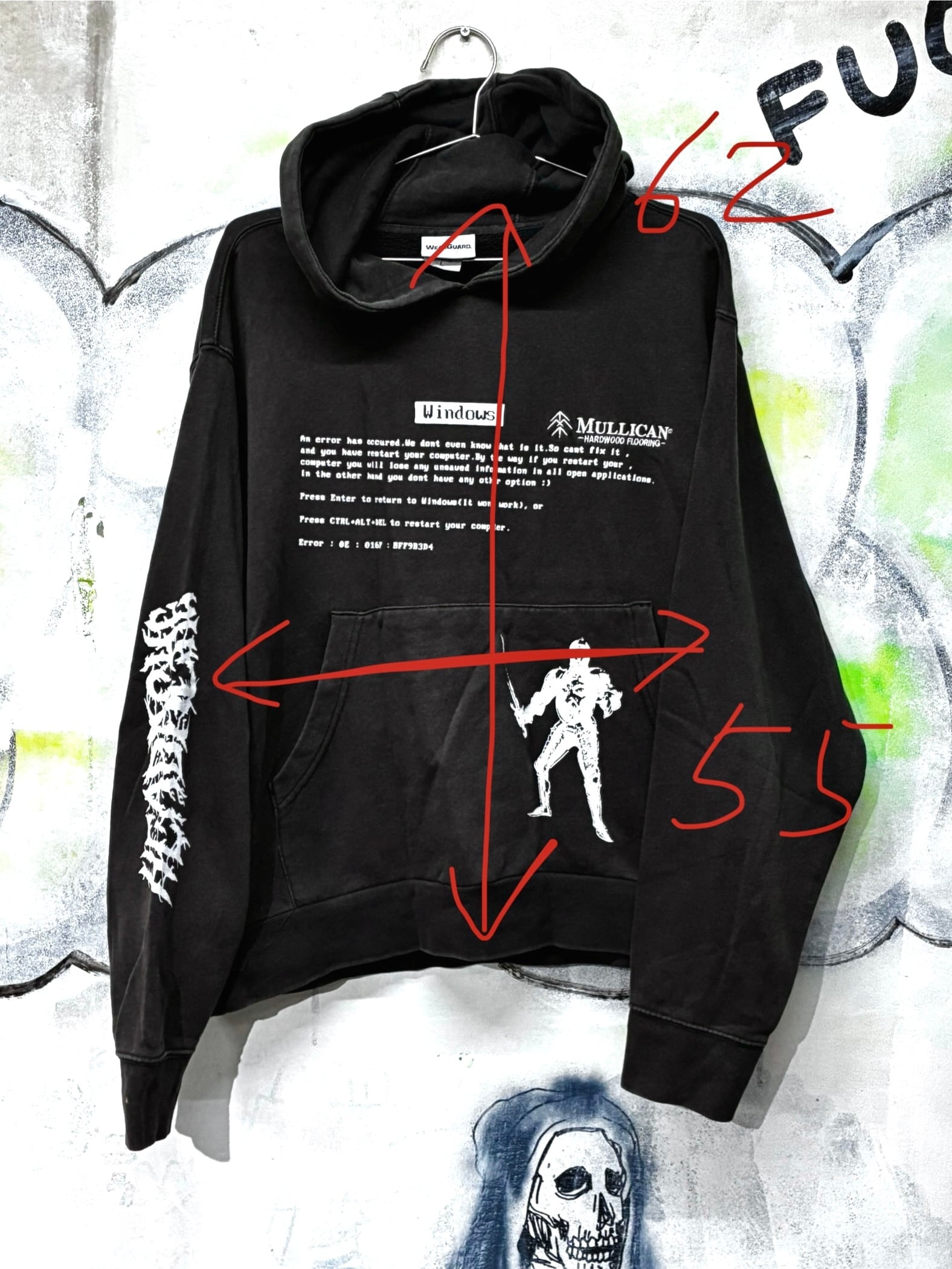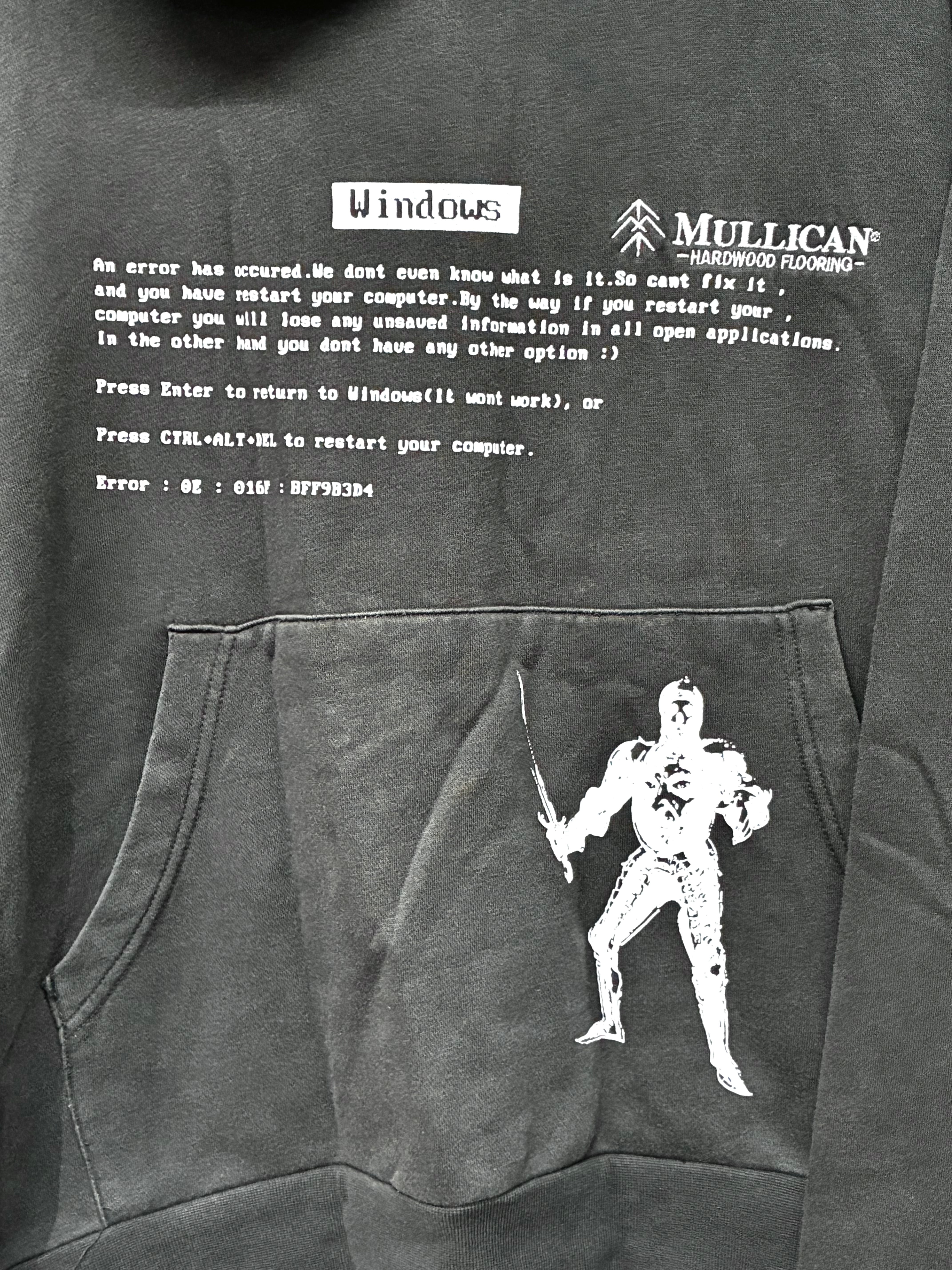 古着にシルク印刷でタトゥーを入れています。アメリカのフローリング製造販売企業のパーカーです。胸に初期Windowsのエラーメッセージ、ポケットに80年代のPCゲームウィザードリーⅡの骸骨騎士フィーンド、腕にHEADACHE(頭痛)などをプリントしています。