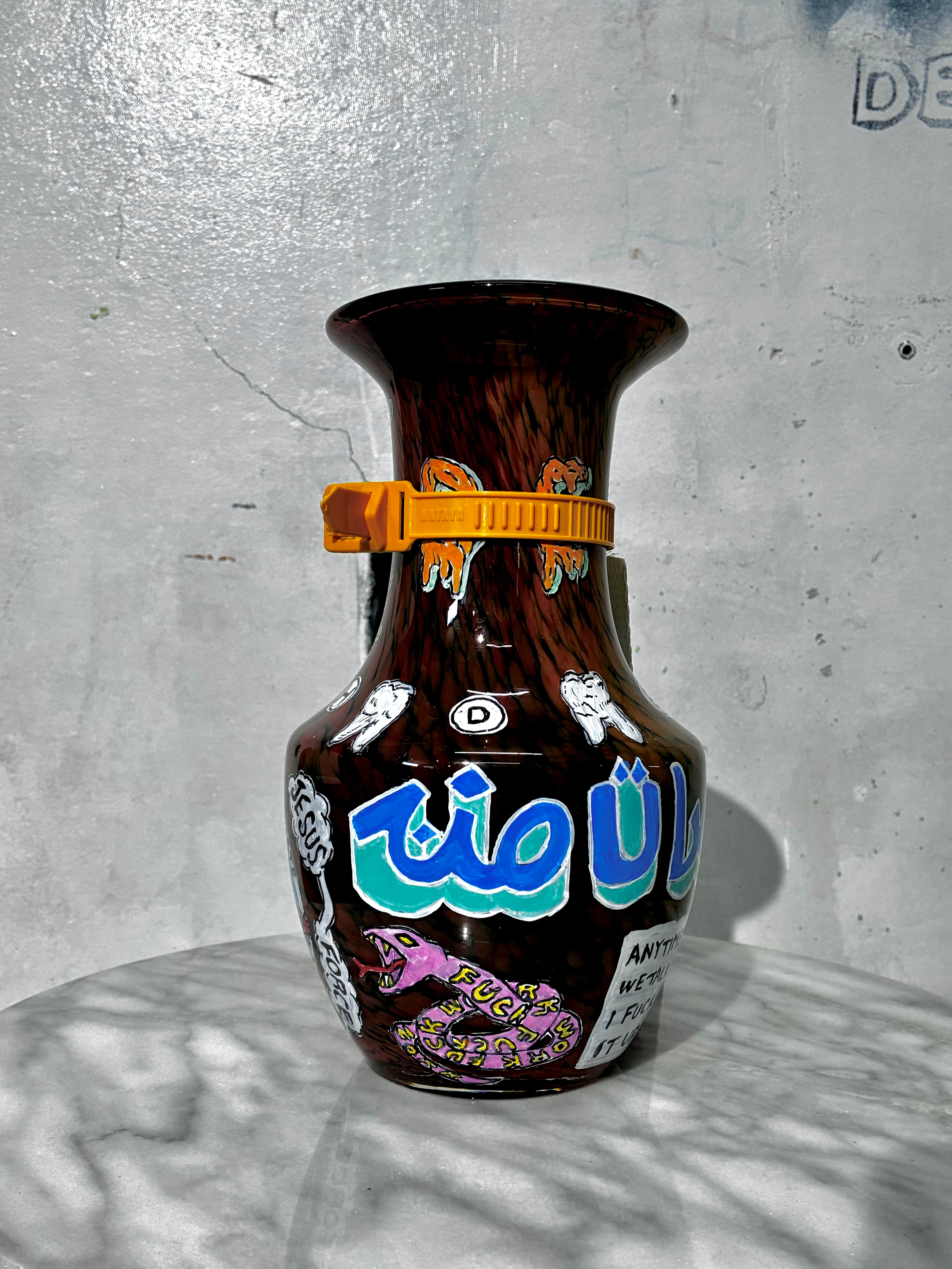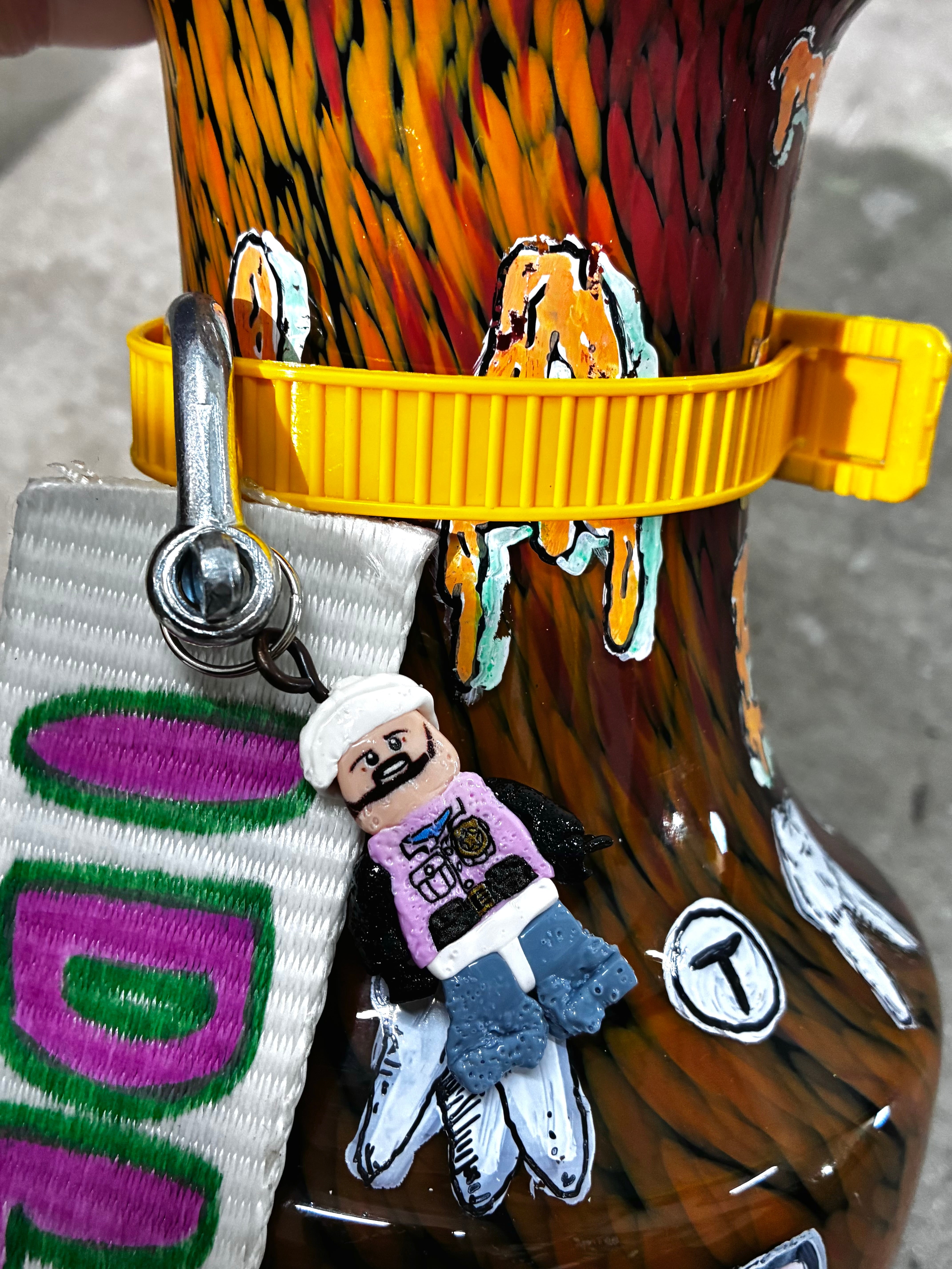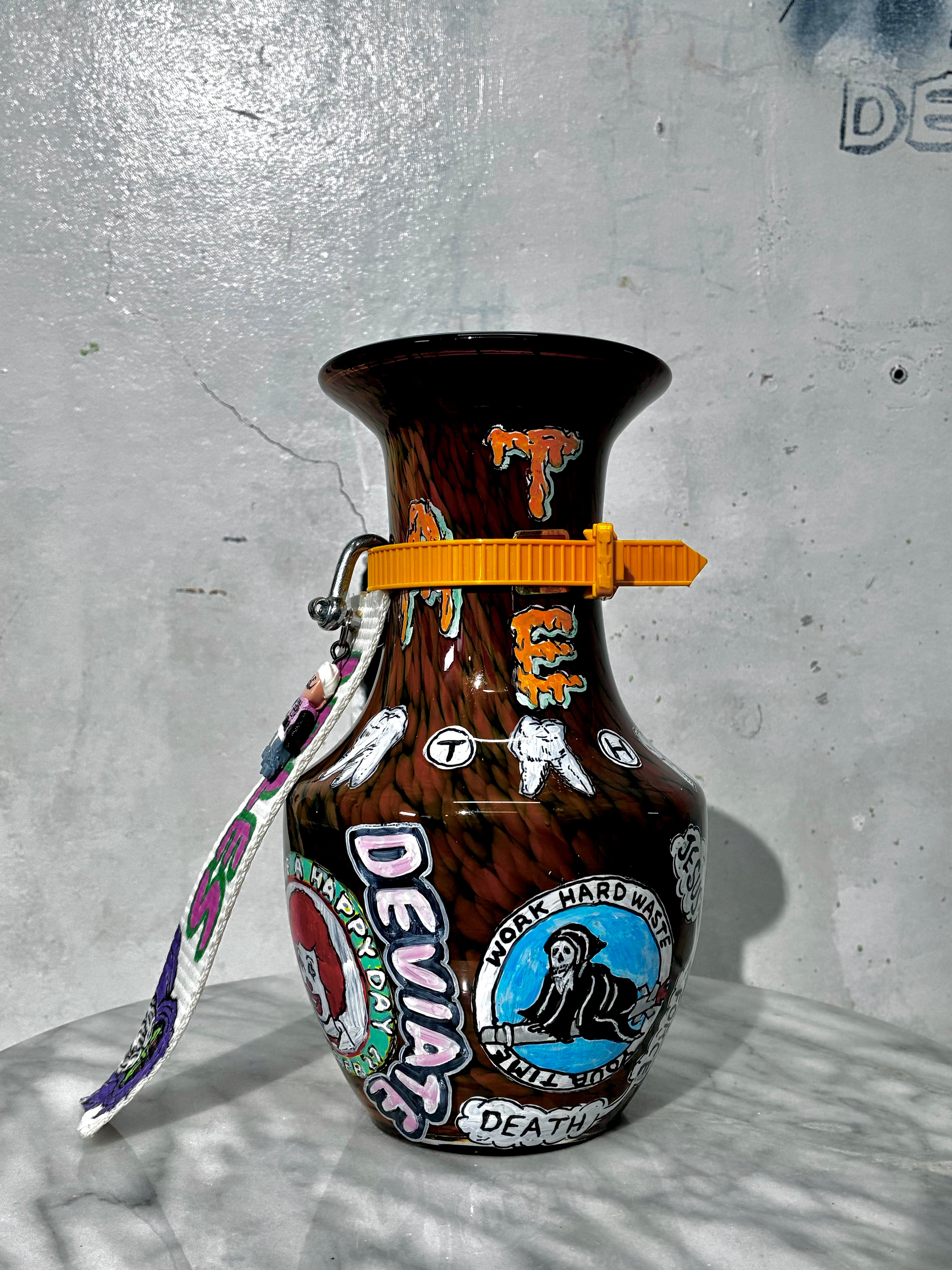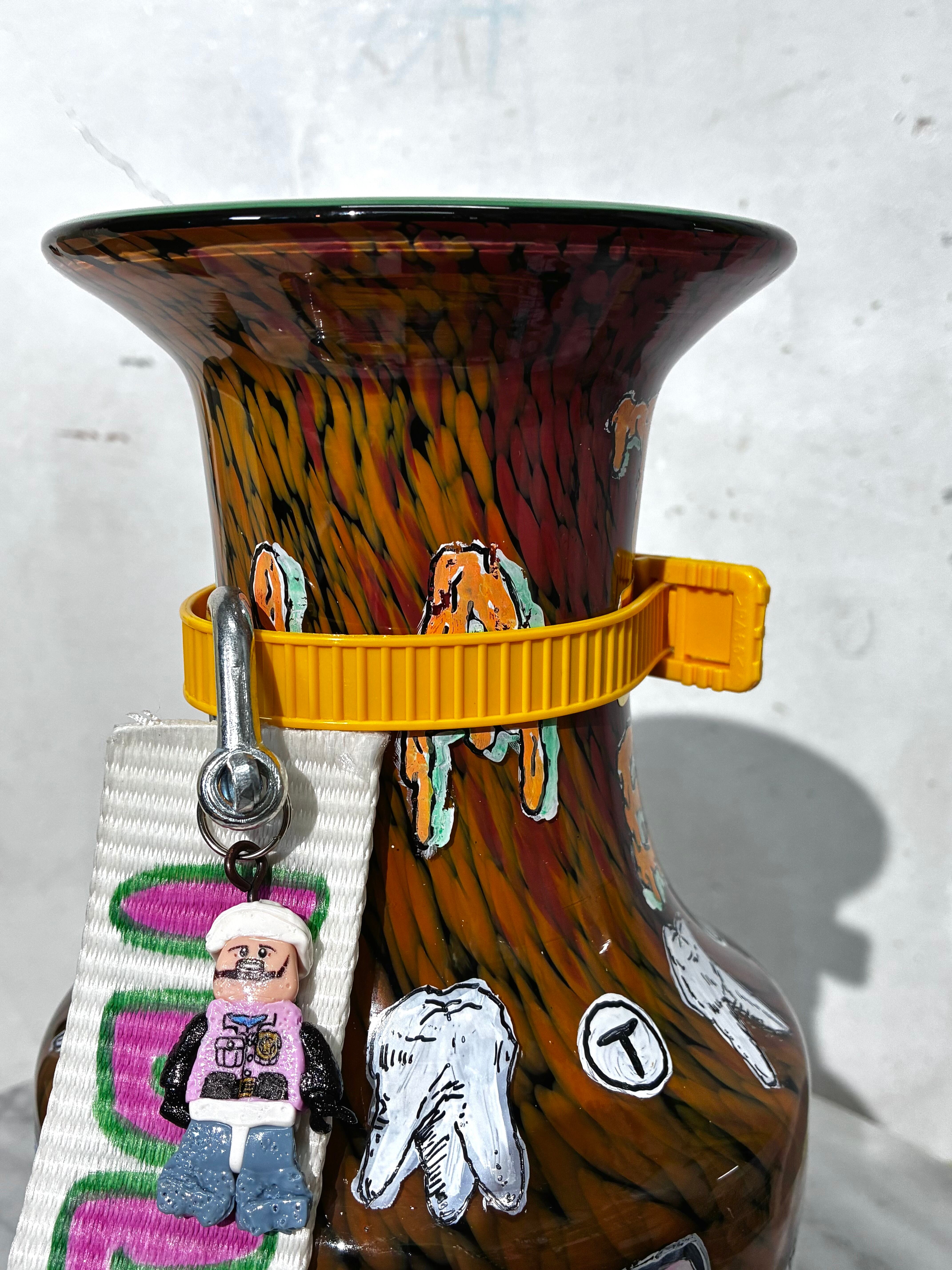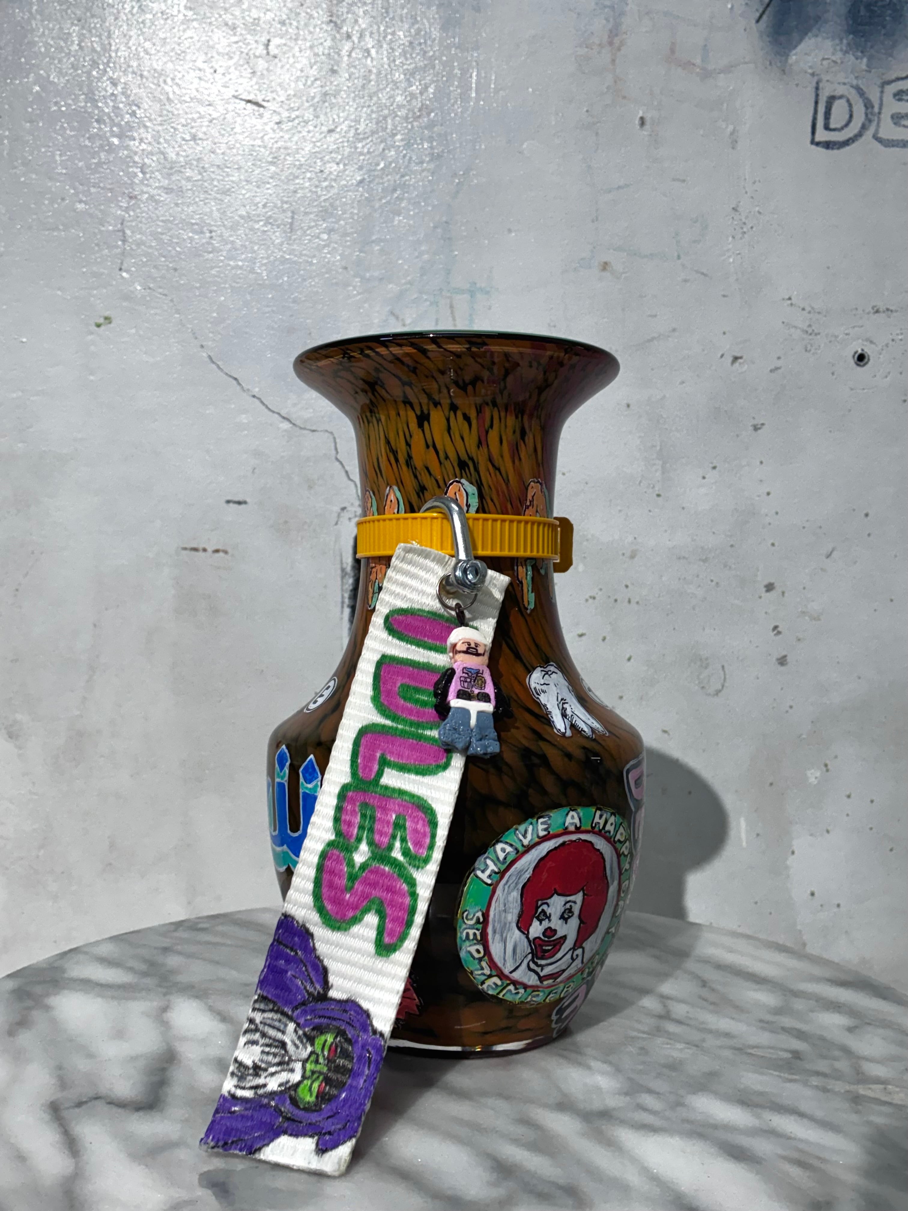今は無き大阪のメーカーカメイガラスの花瓶にペイントし、工業部品で作ったタグを付けています。ベルト部分はラッシングベルトというトラックの荷締めなどで使うものにペイントしています。またタグに付属しているLEGOはブート品で、関節がゆるゆるなので溶かして一体化しています。