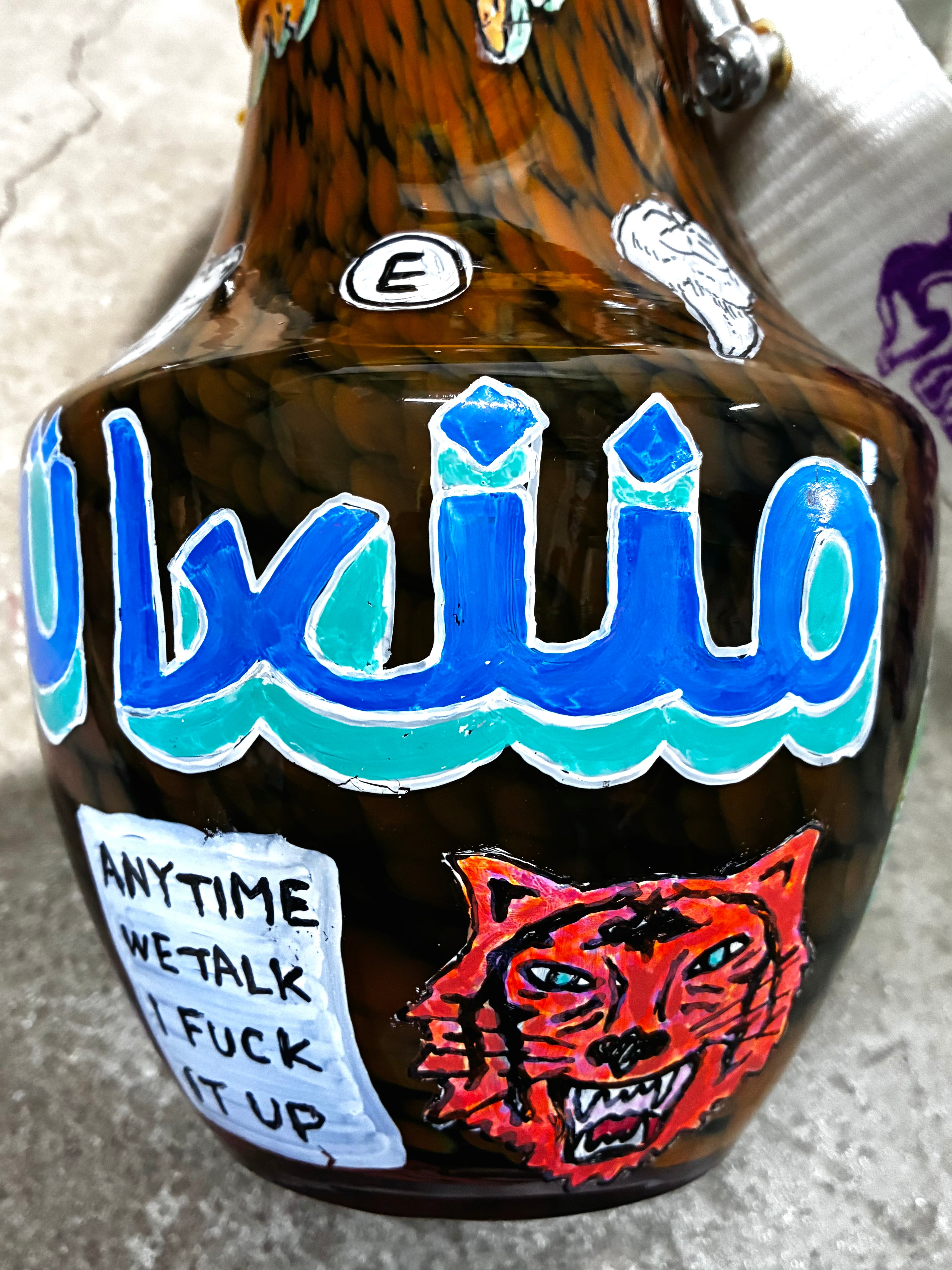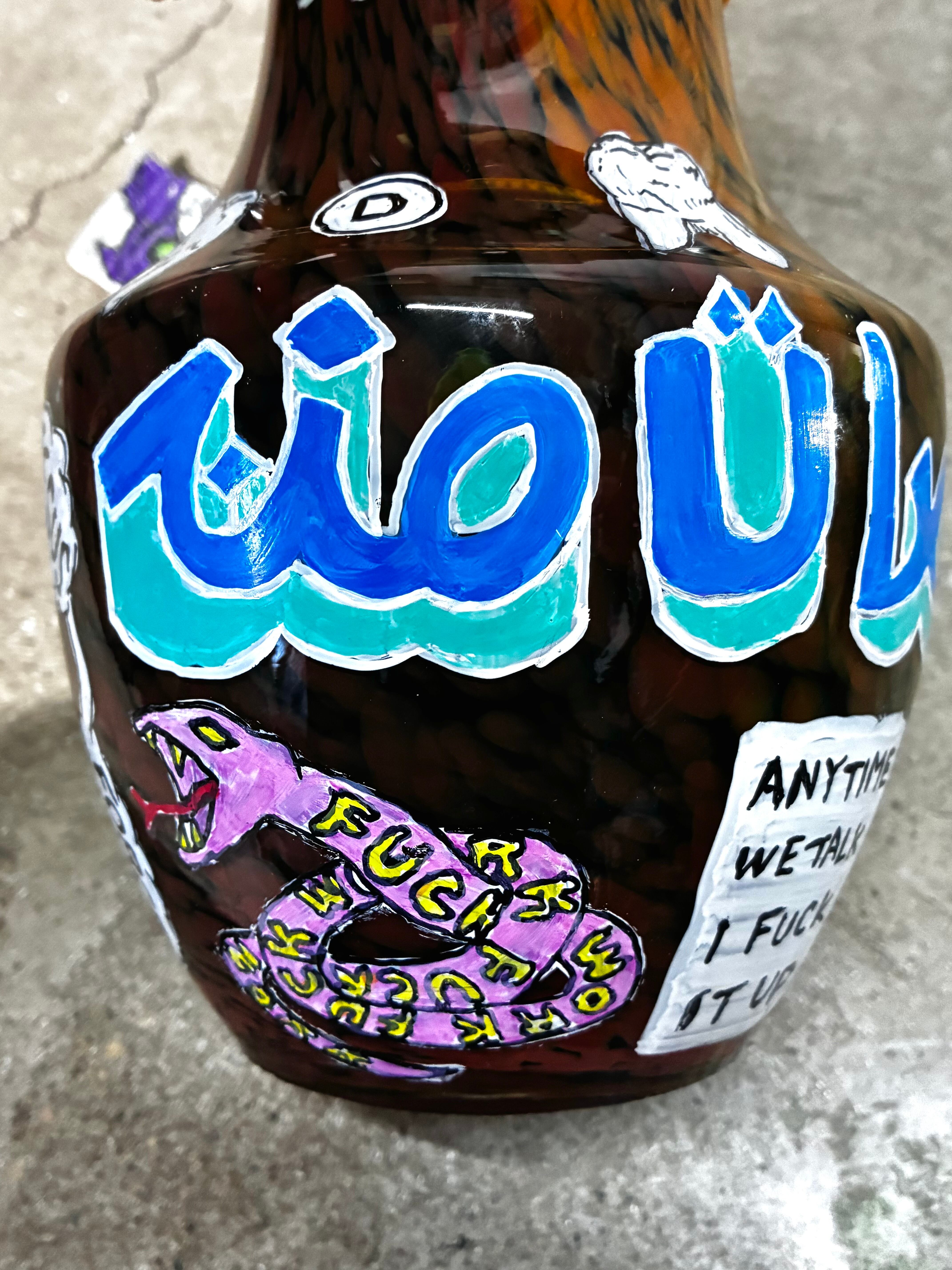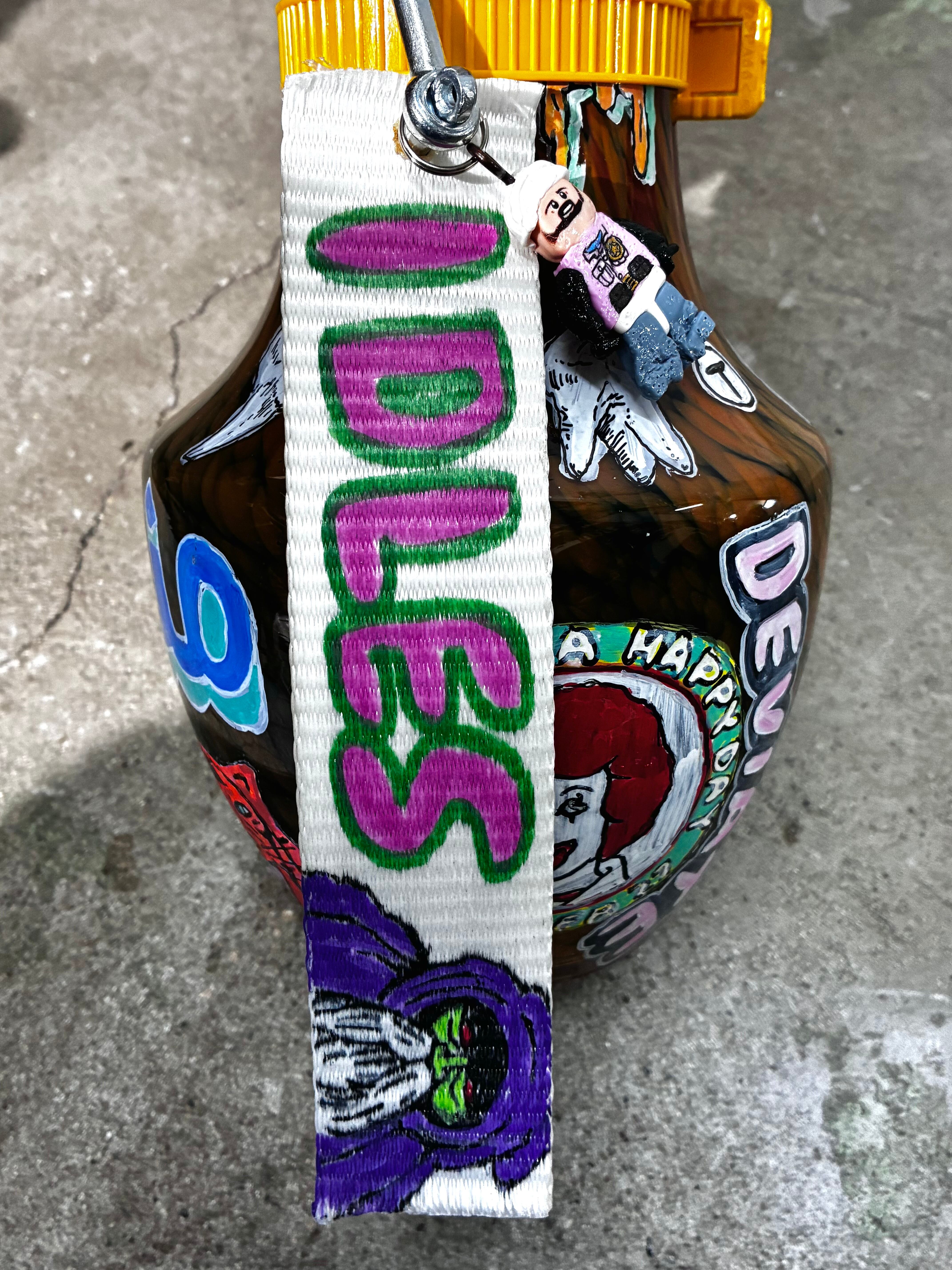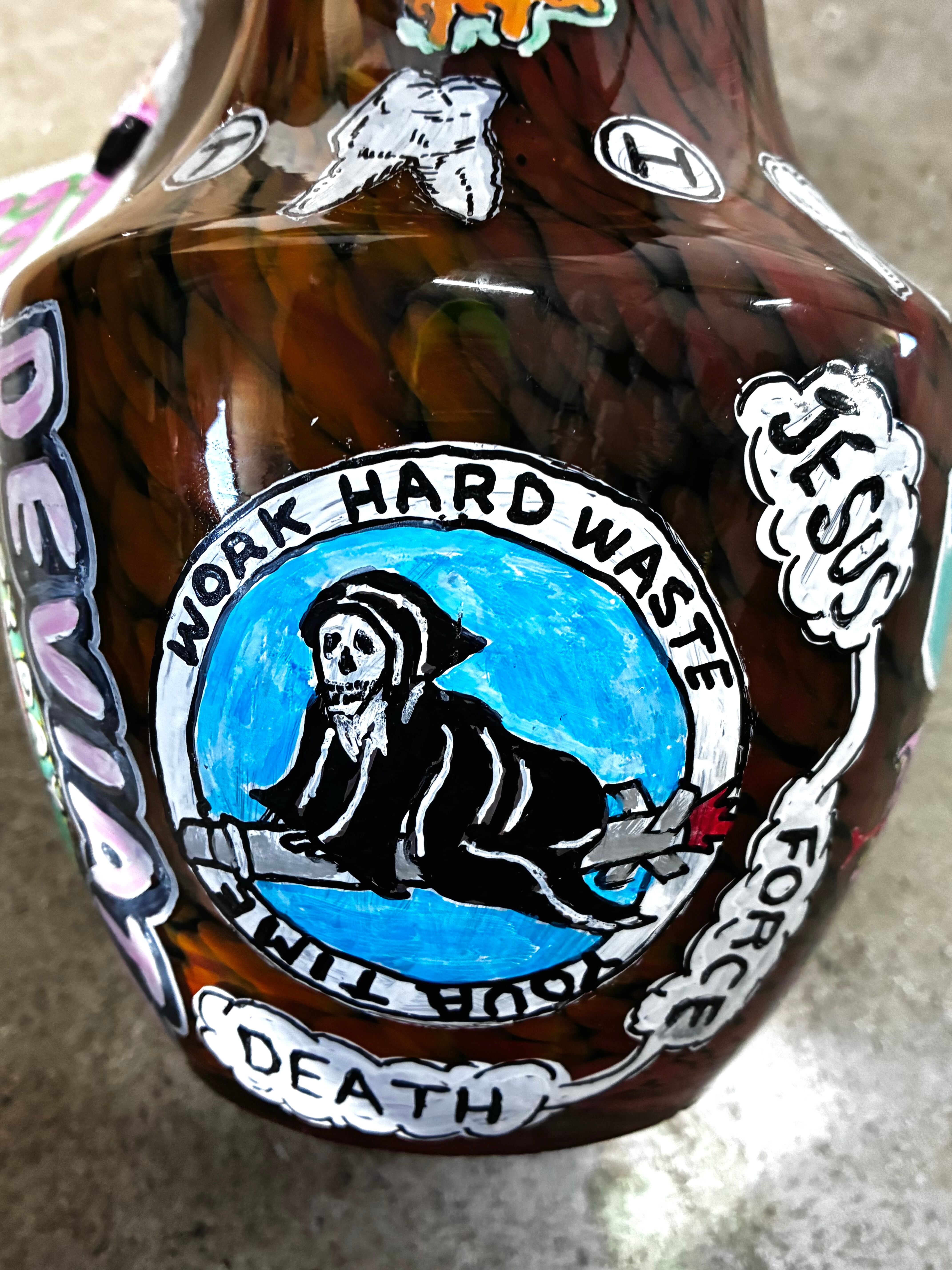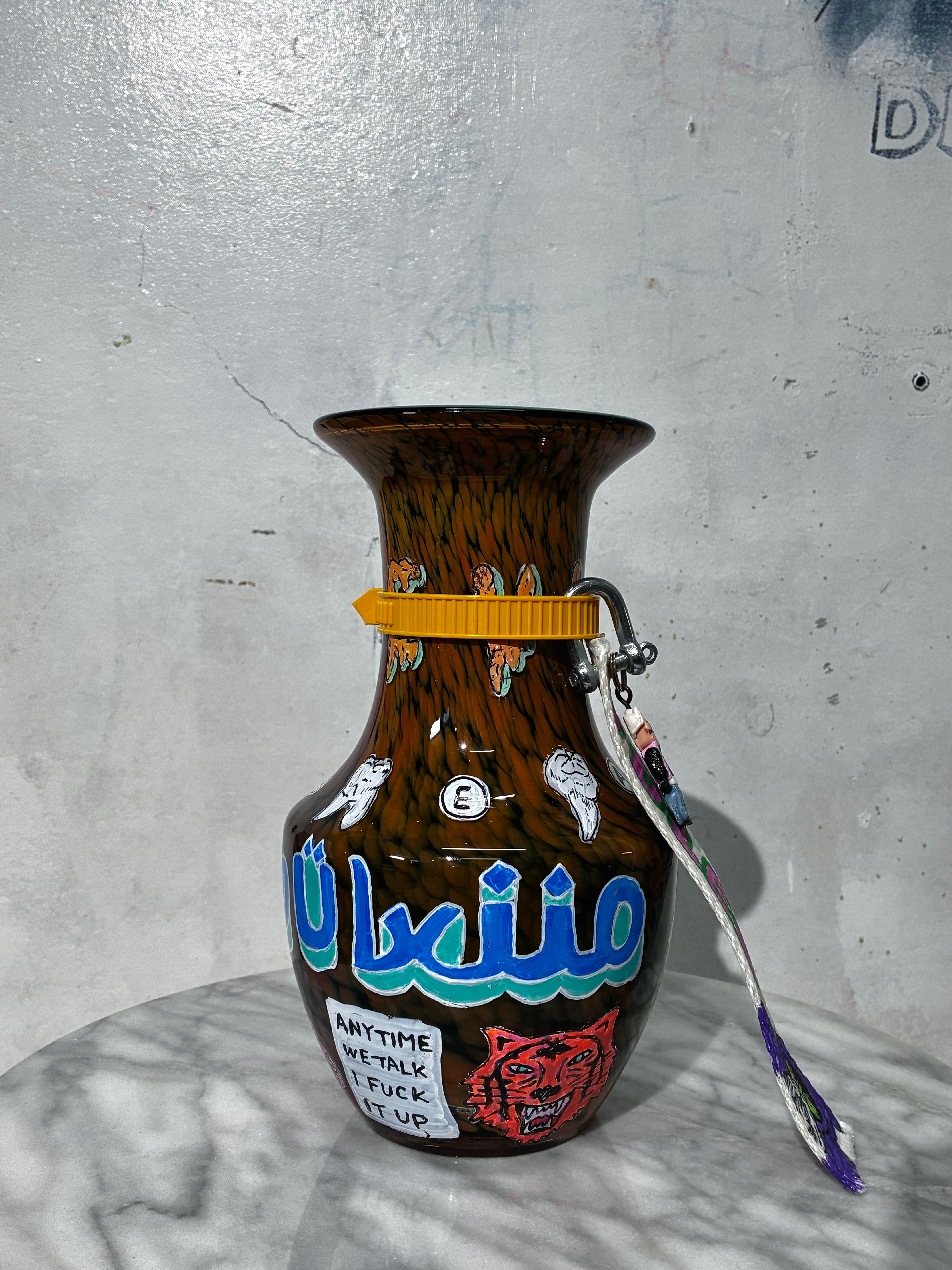 今は無き大阪のメーカーカメイガラスの花瓶にペイントし、工業部品で作ったタグを付けています。ベルト部分はラッシングベルトというトラックの荷締めなどで使うものにペイントしています。またタグに付属しているLEGOはブート品で、関節がゆるゆるなので溶かして一体化しています。