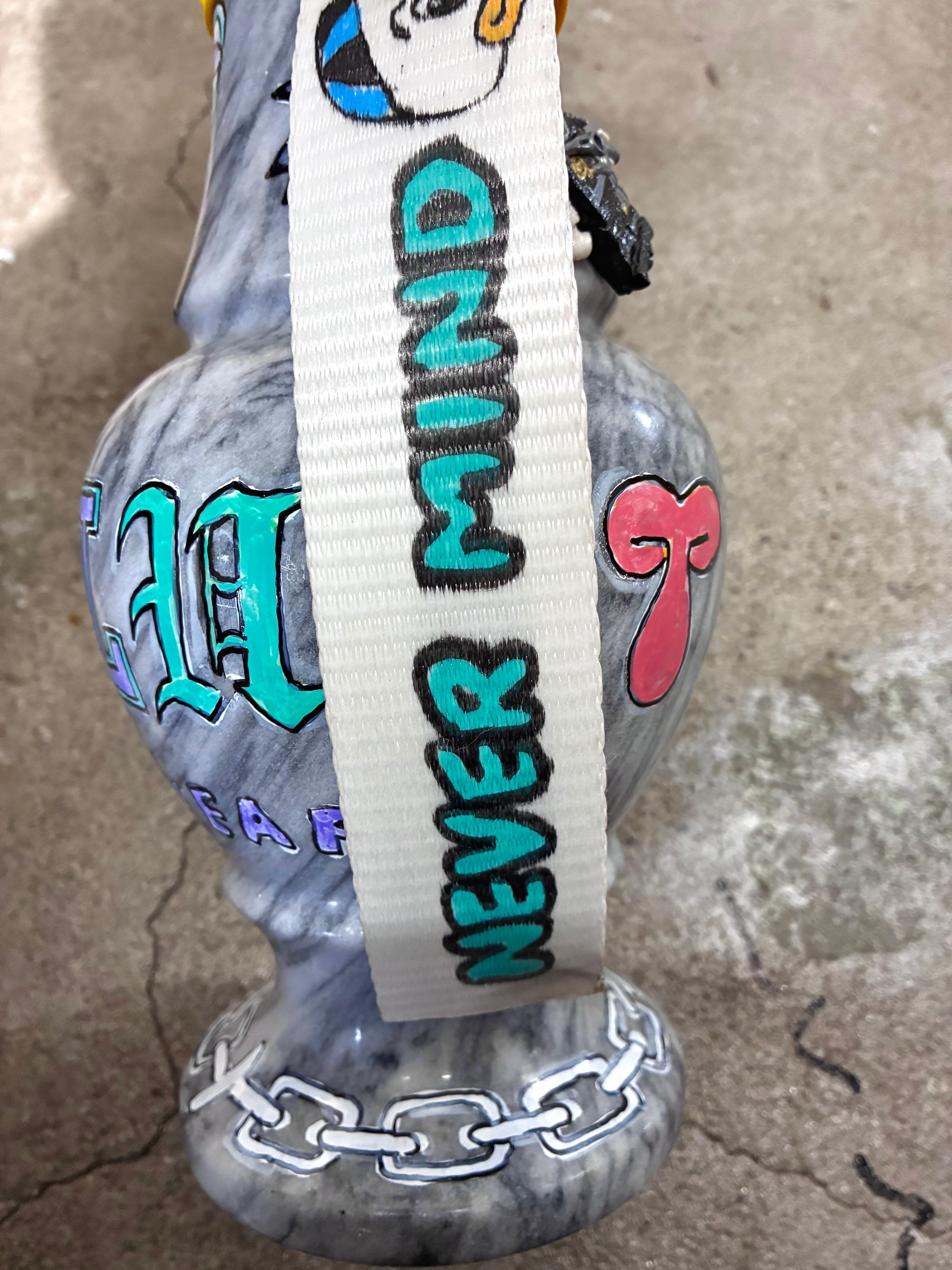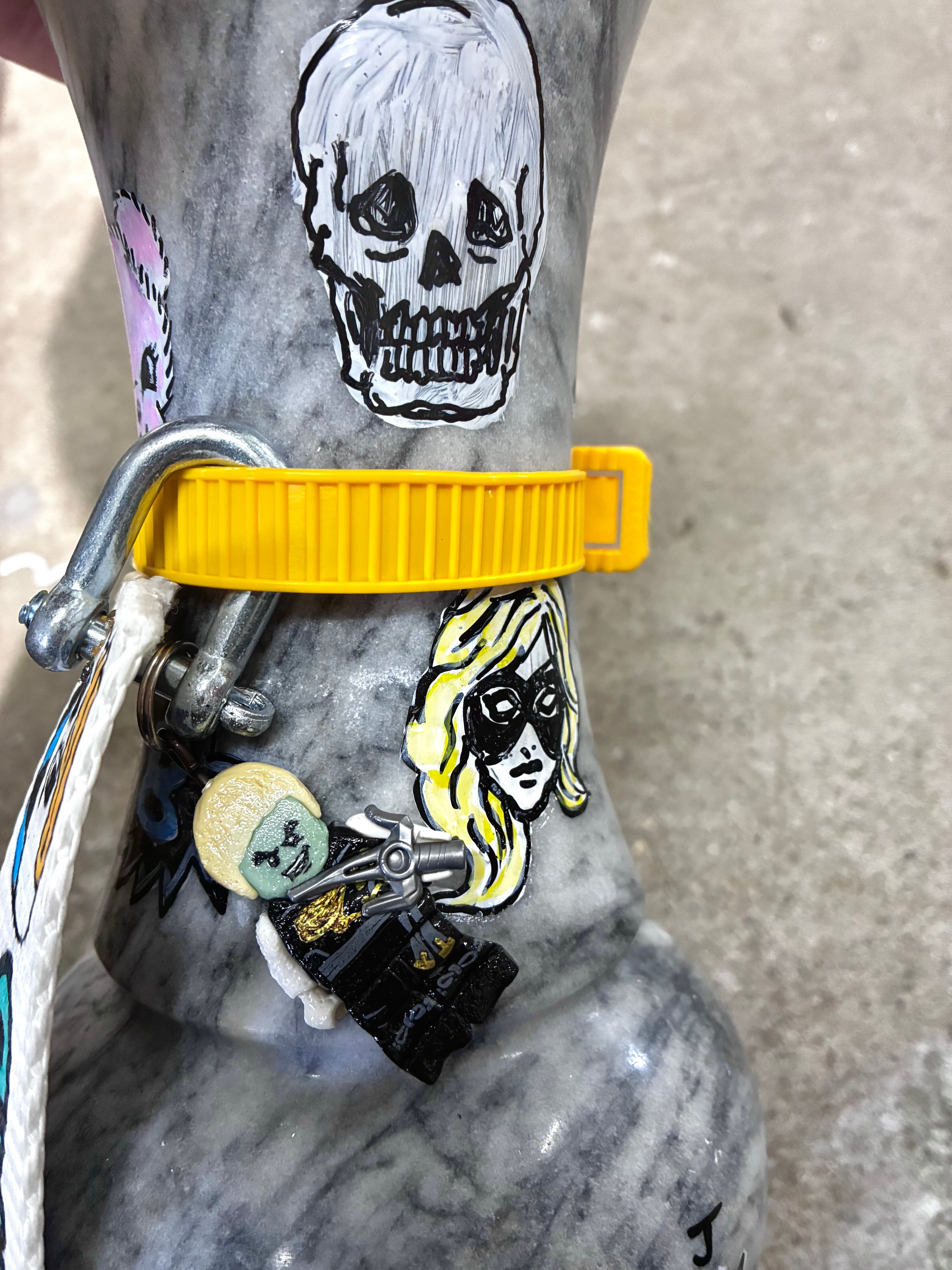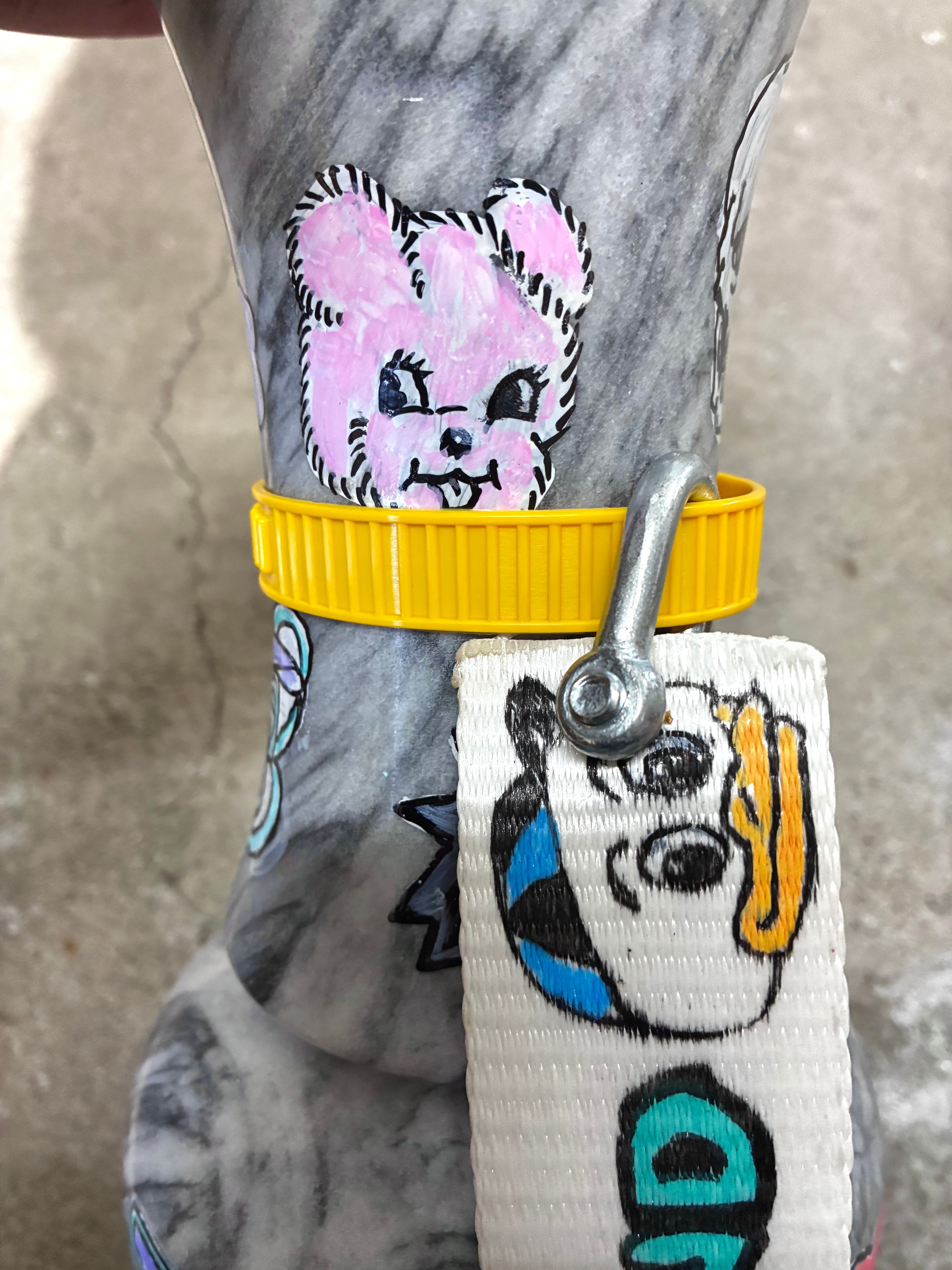 鈍器とも言うべき重い花瓶にペイントし、工業部品で作ったタグを付けています。ベルト部分はラッシングベルトというトラックの荷締めなどで使うものにペイントしています。またタグに付属しているLEGOはブート品で、関節がゆるゆるなので溶かして一体化しています。