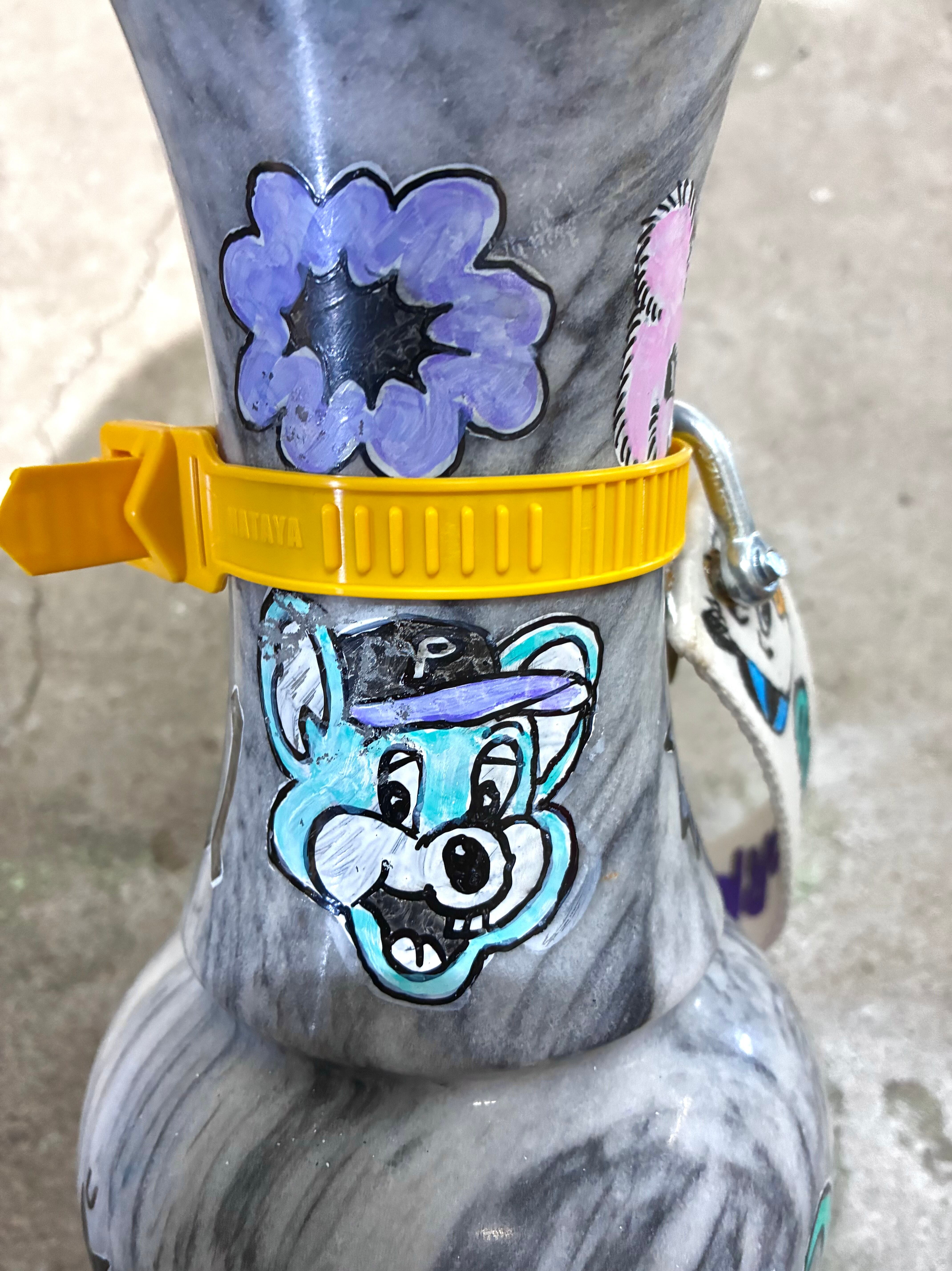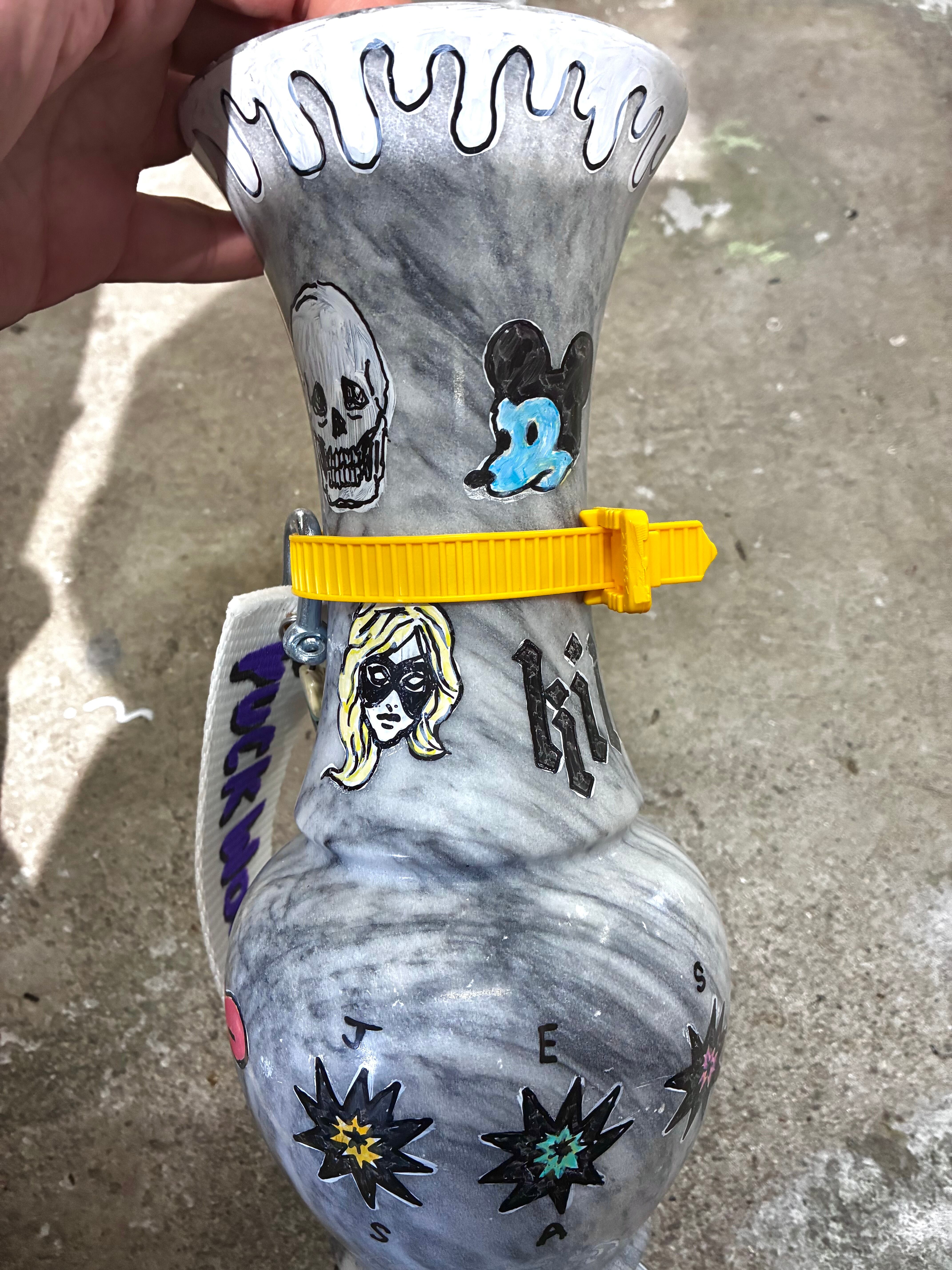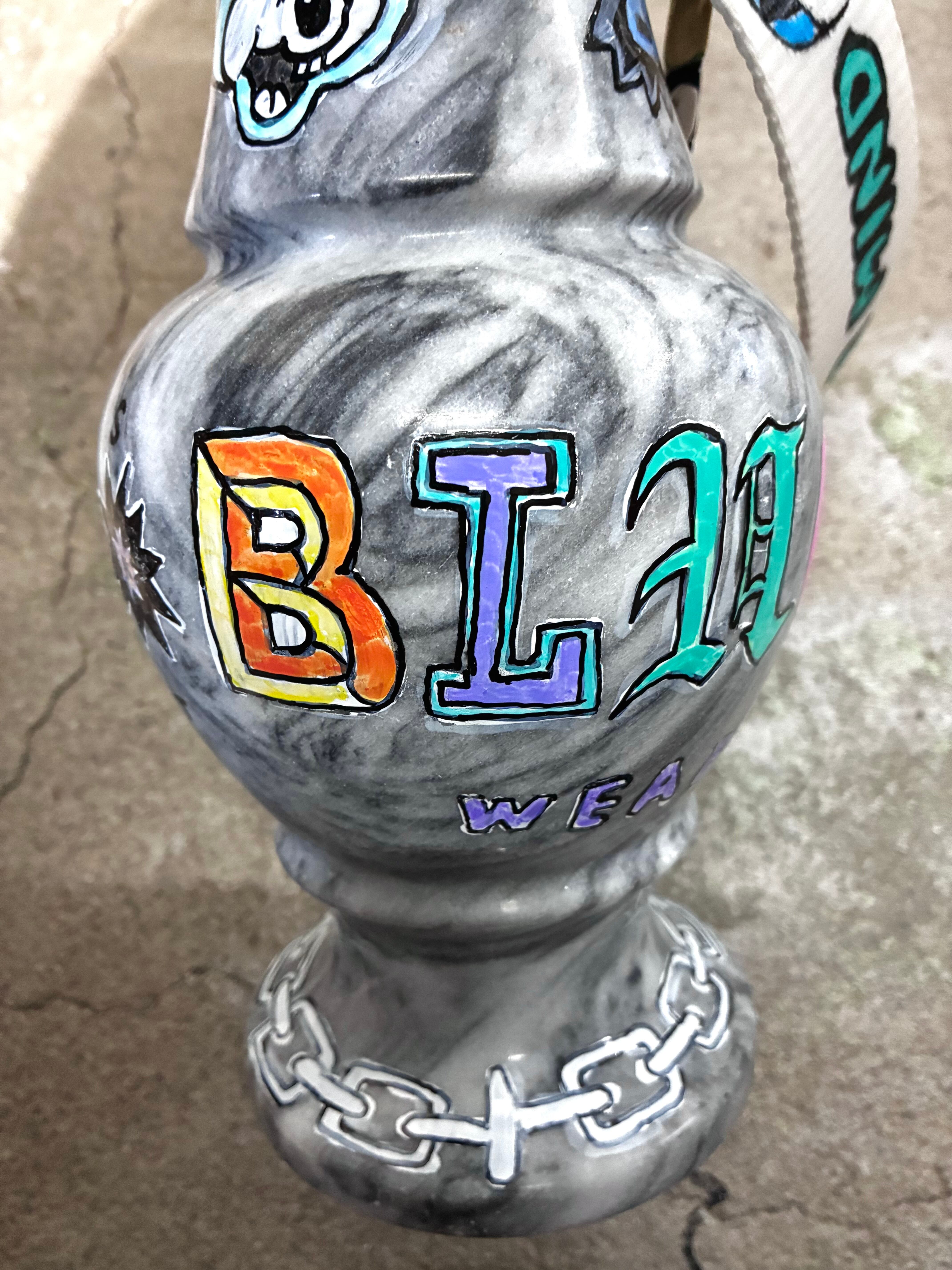 鈍器とも言うべき重い花瓶にペイントし、工業部品で作ったタグを付けています。ベルト部分はラッシングベルトというトラックの荷締めなどで使うものにペイントしています。またタグに付属しているLEGOはブート品で、関節がゆるゆるなので溶かして一体化しています。