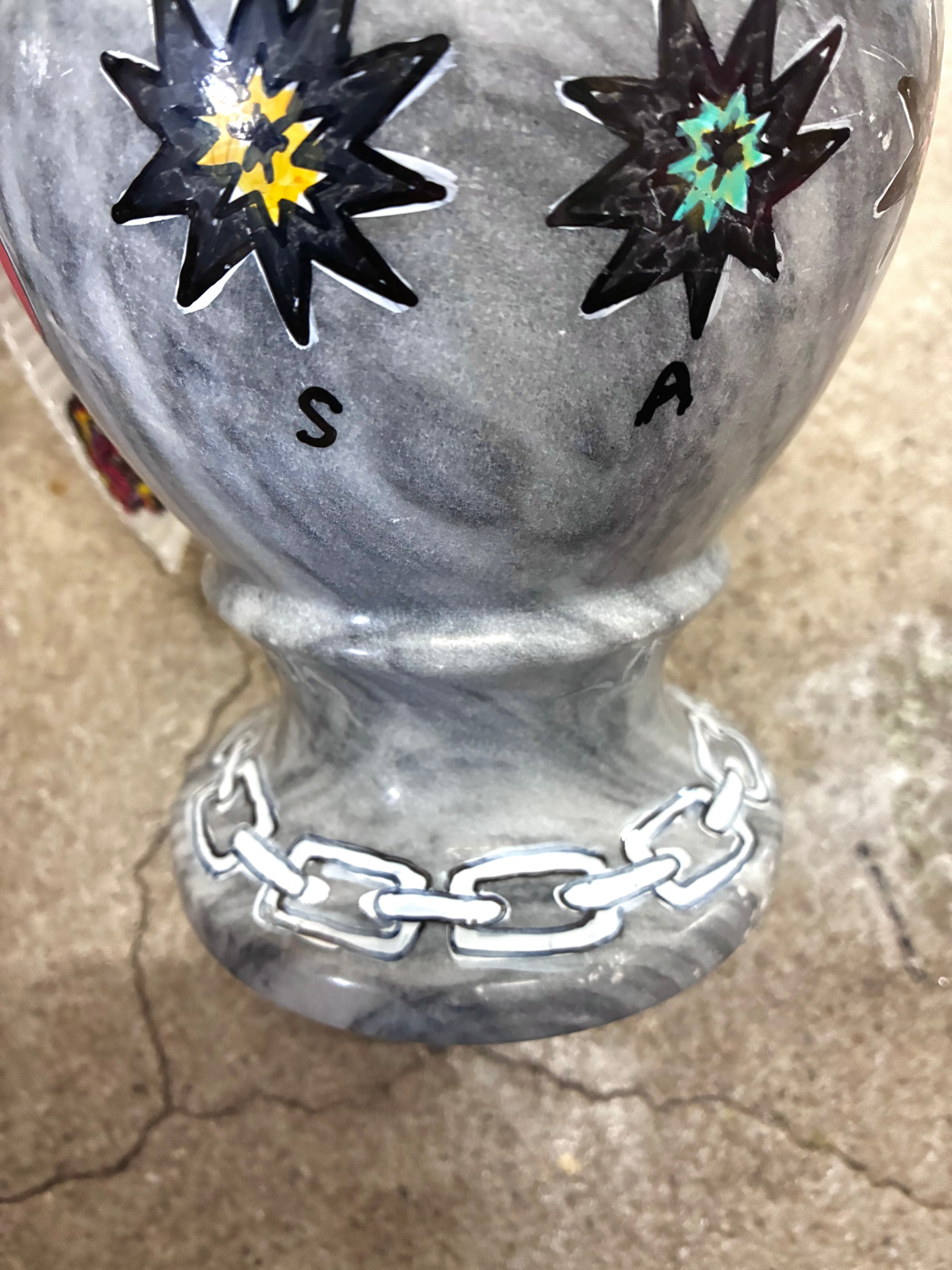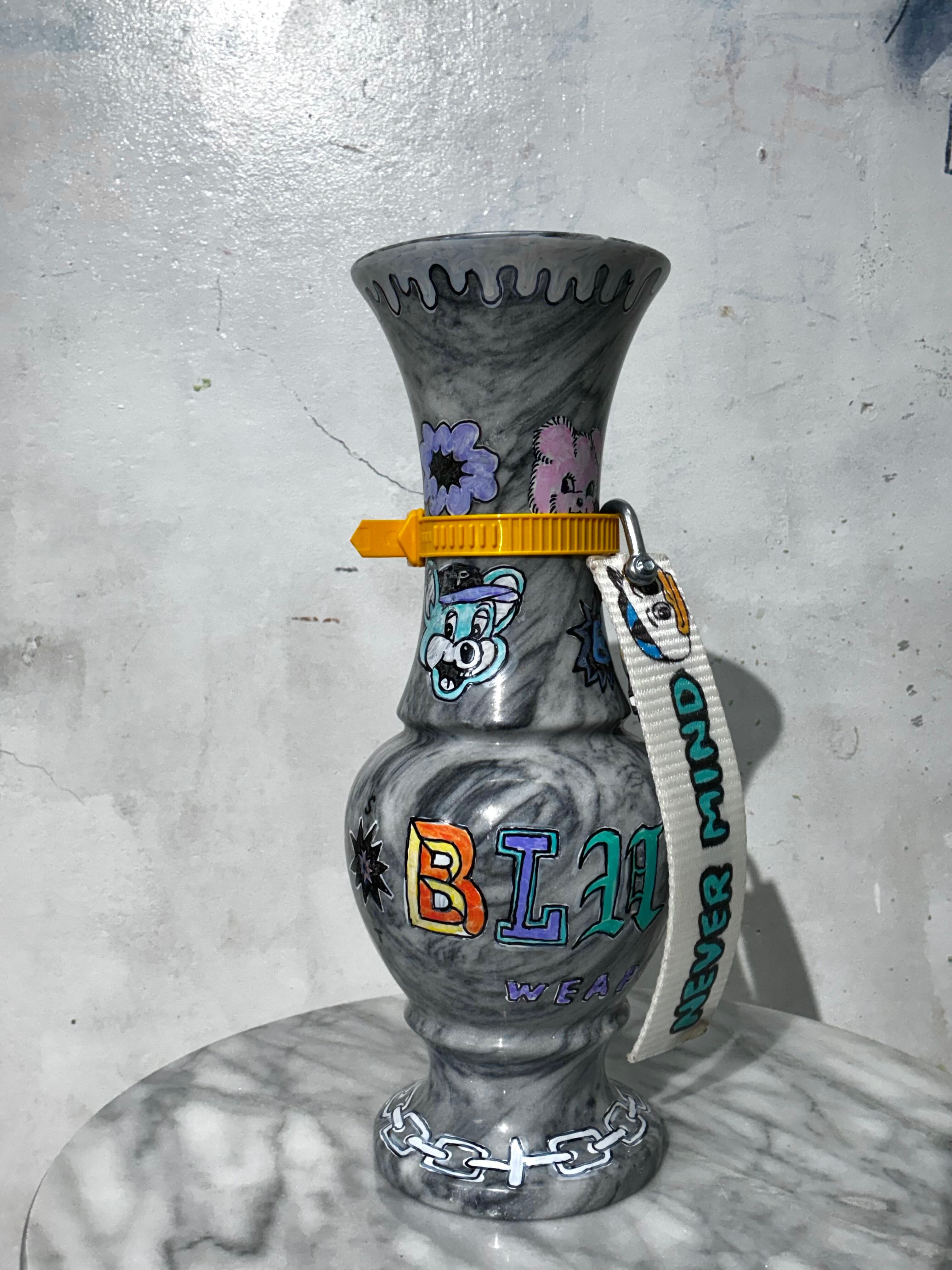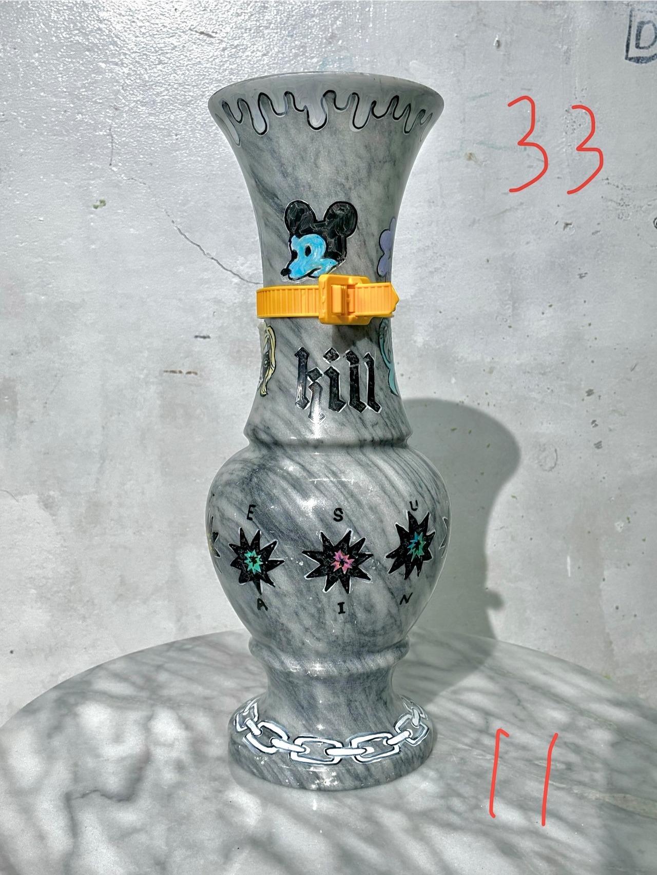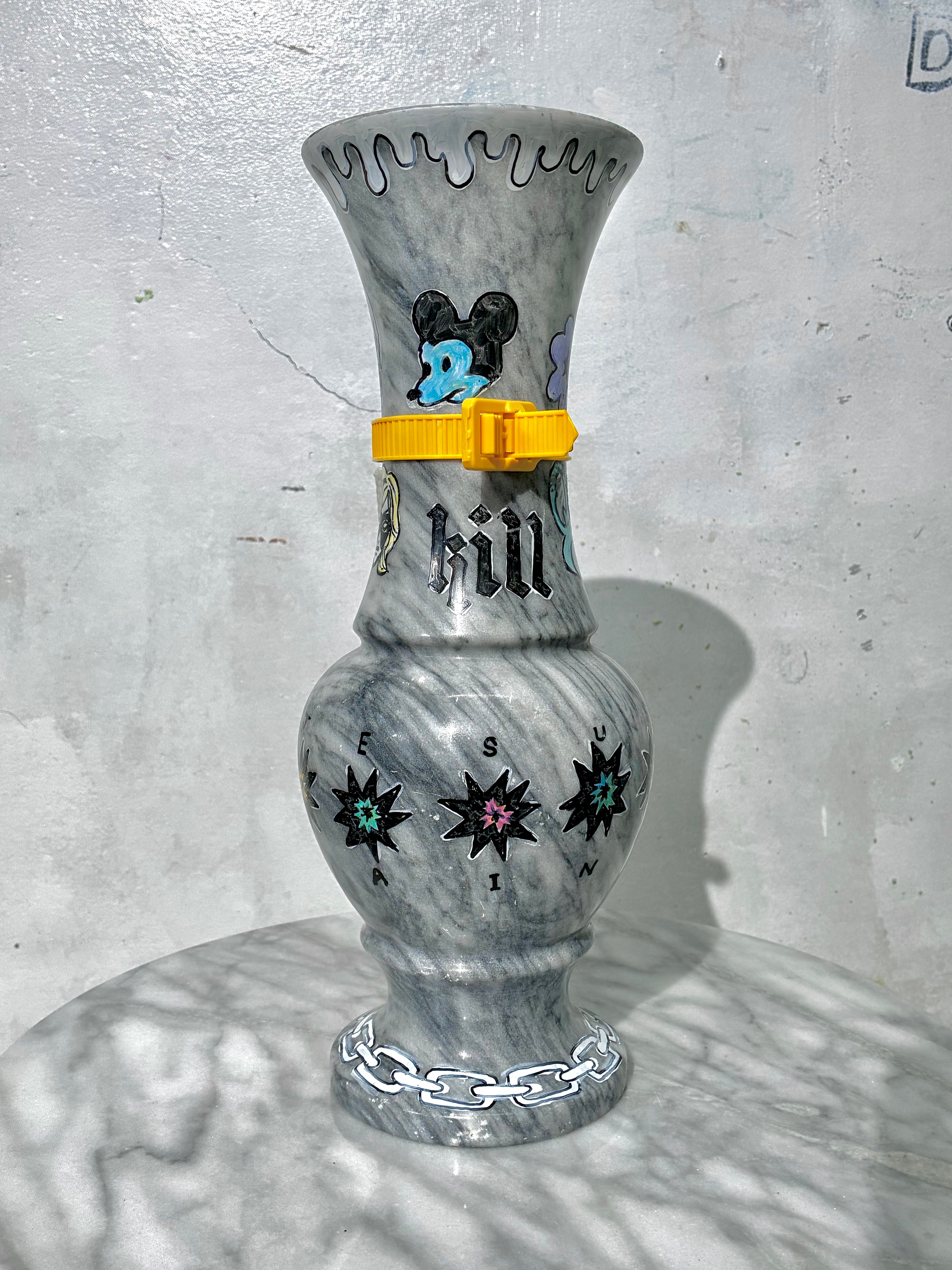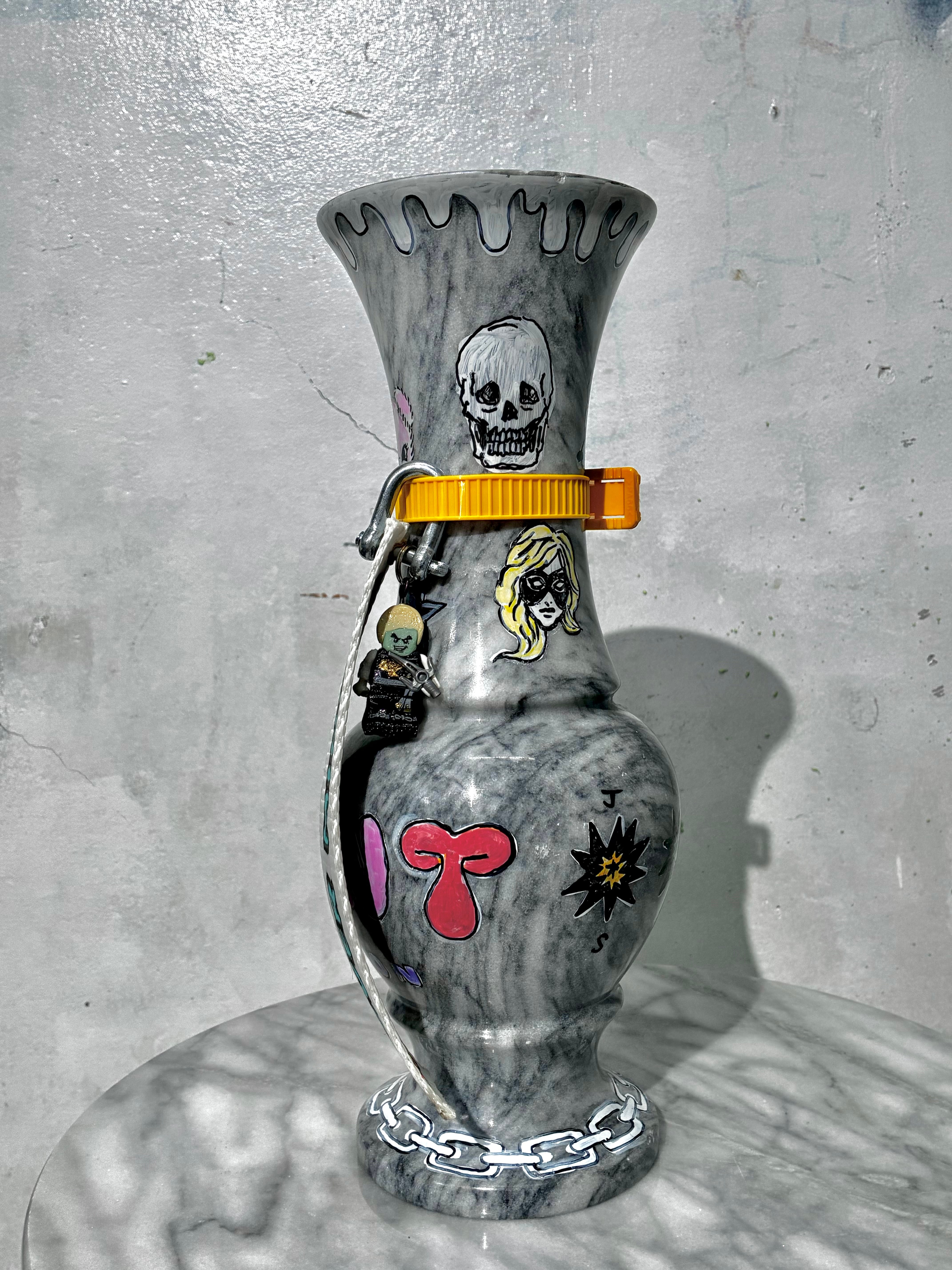 昭和の大理石花瓶とポップカルチャー、工業部品などをマッシュアップし、1点ものとすることで価値を高める、価値のリサイクル作品です。