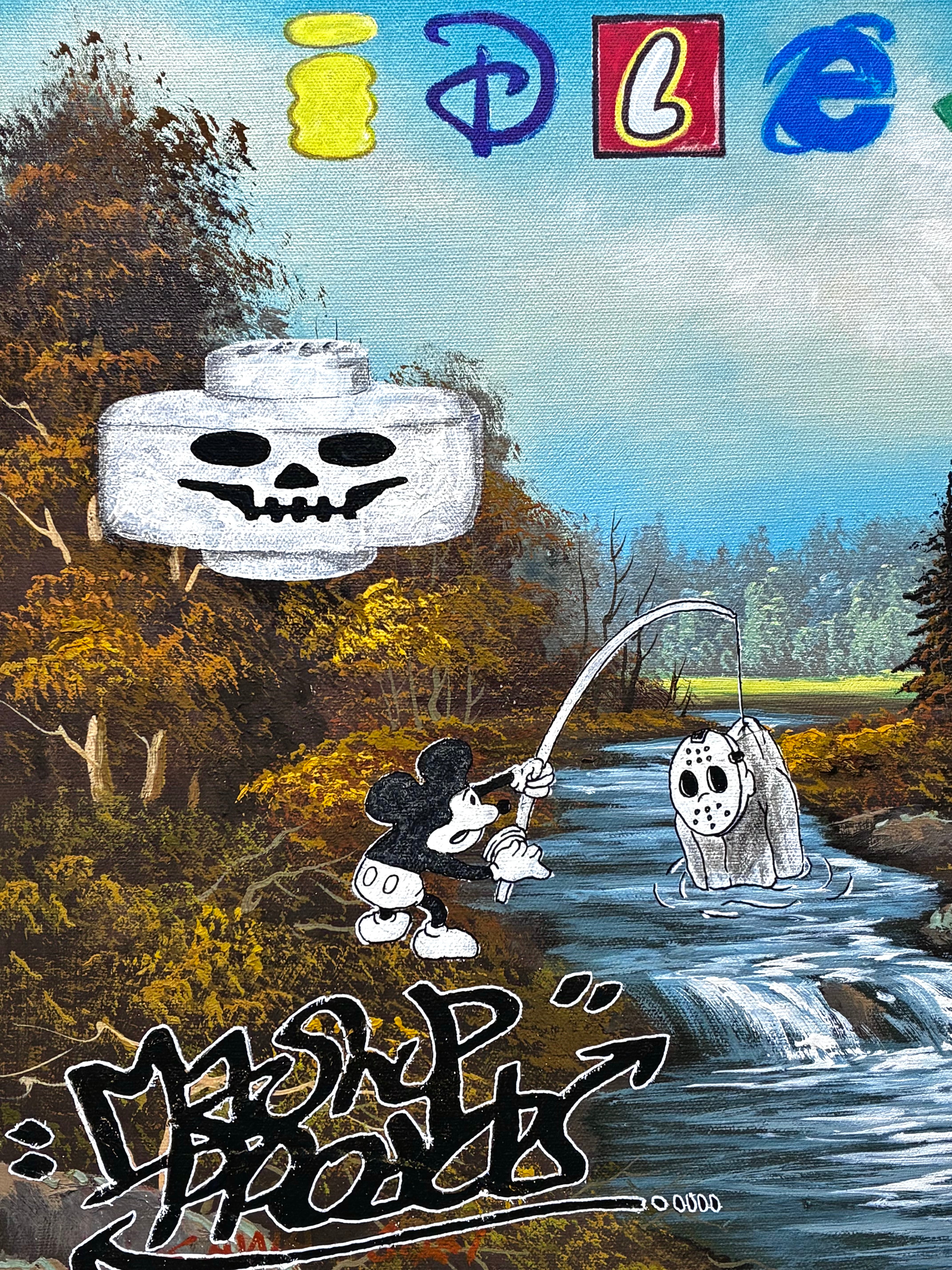 アート市場から見放されていた、古いありふれた風景画にポップをマッシュアップし、1点ものの”ありふれてない風景”に再構築する、価値のリサイクル作品。要するに、誰が描いたかわからない風景画の上からペイントし、私の作品にしています。