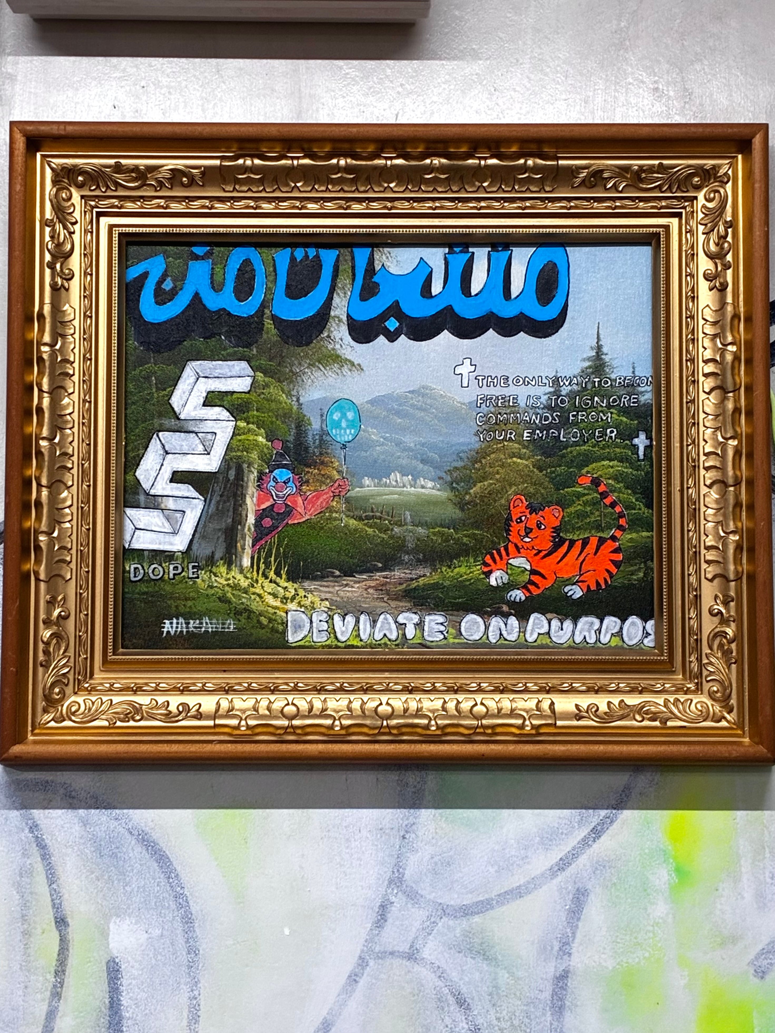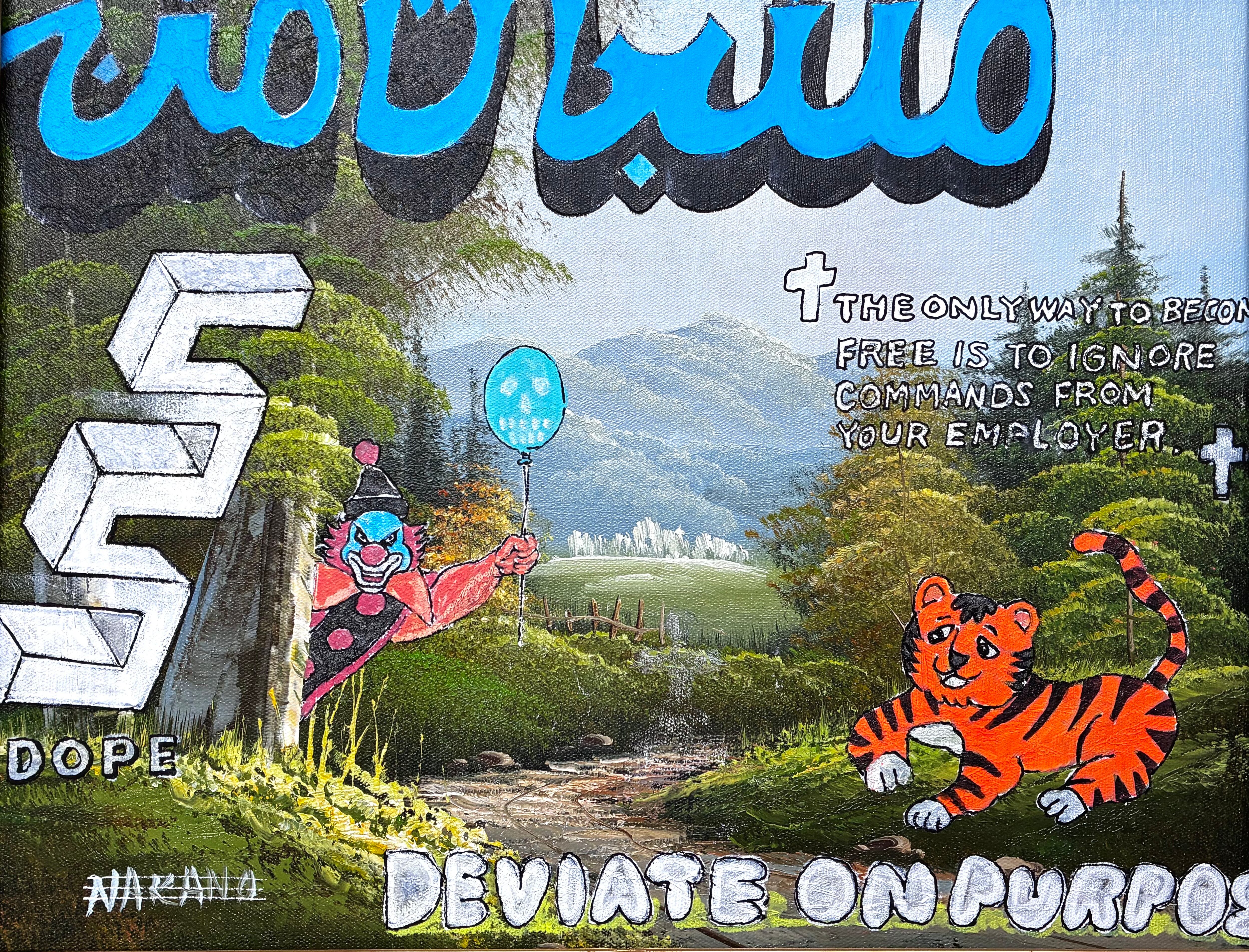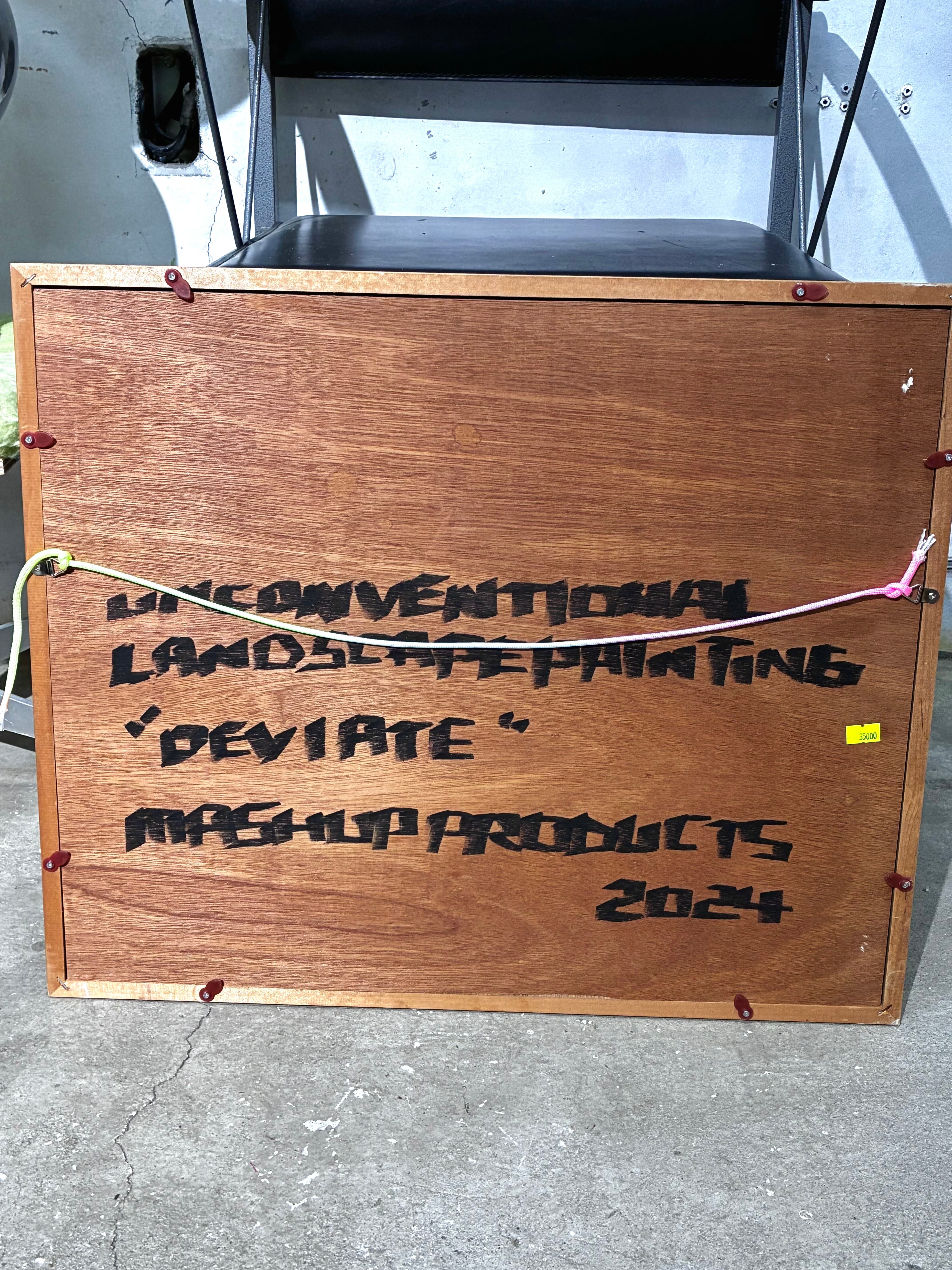 アート市場から見放されていた、古いありふれた風景画にポップをマッシュアップし、1点ものの”ありふれてない風景”に再構築する、価値のリサイクル作品。要するに、誰が描いたかわからない風景画の上からペイントし、私の作品にしています。