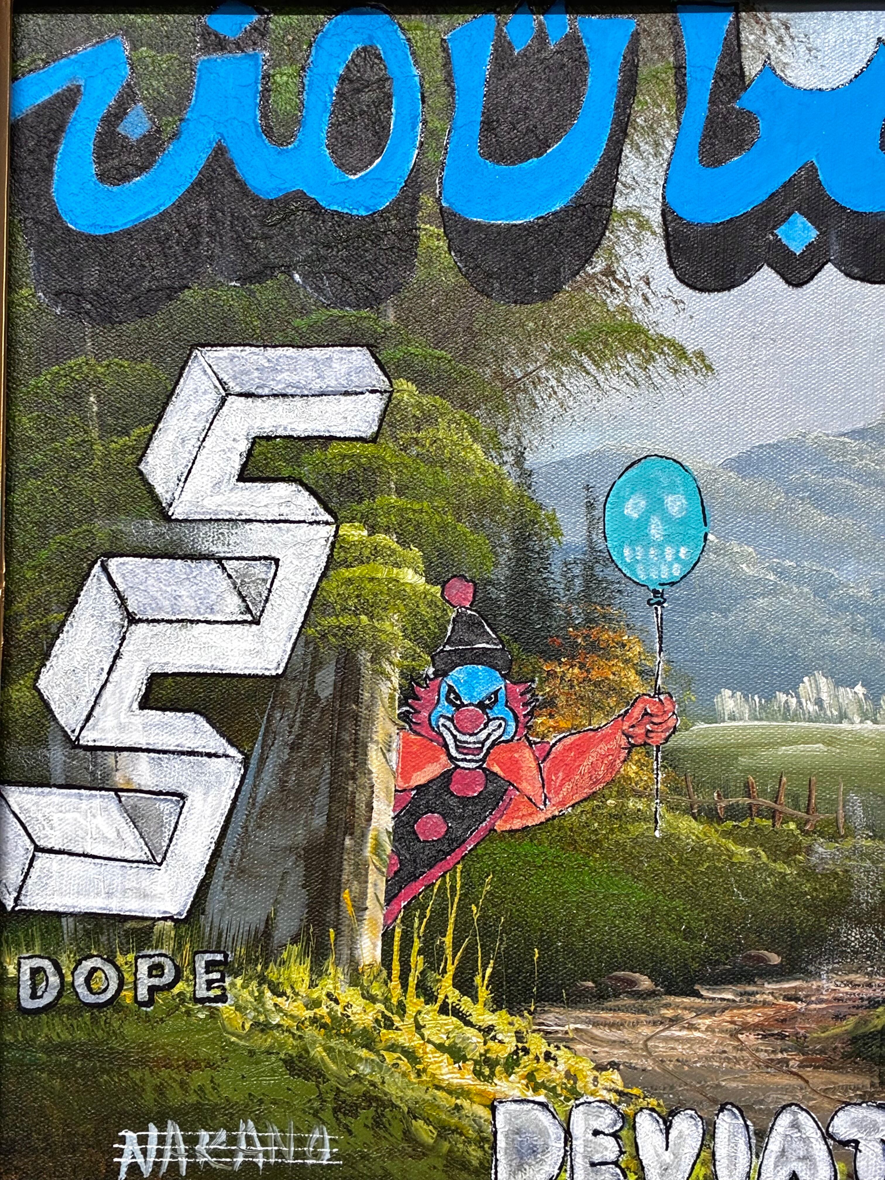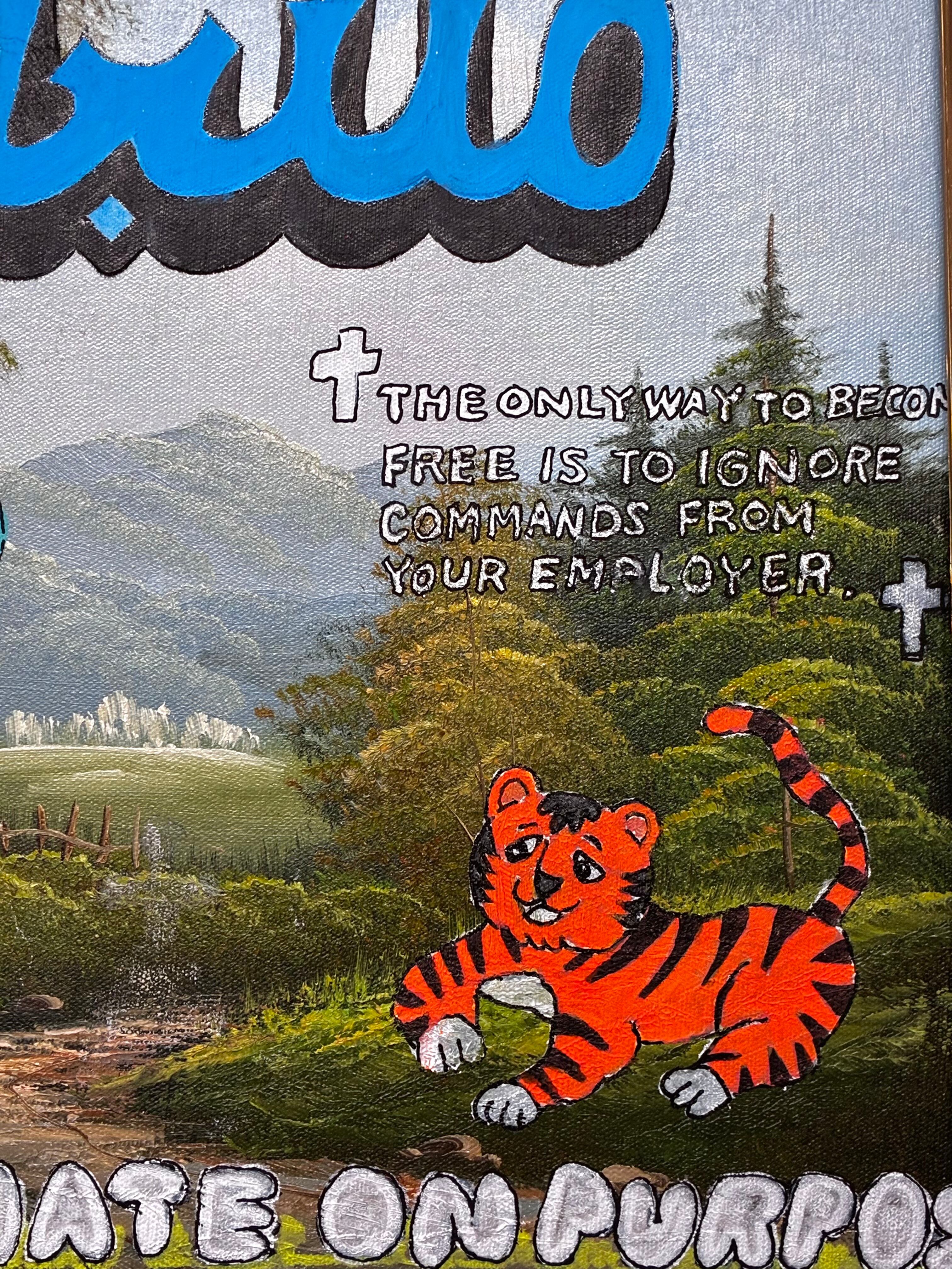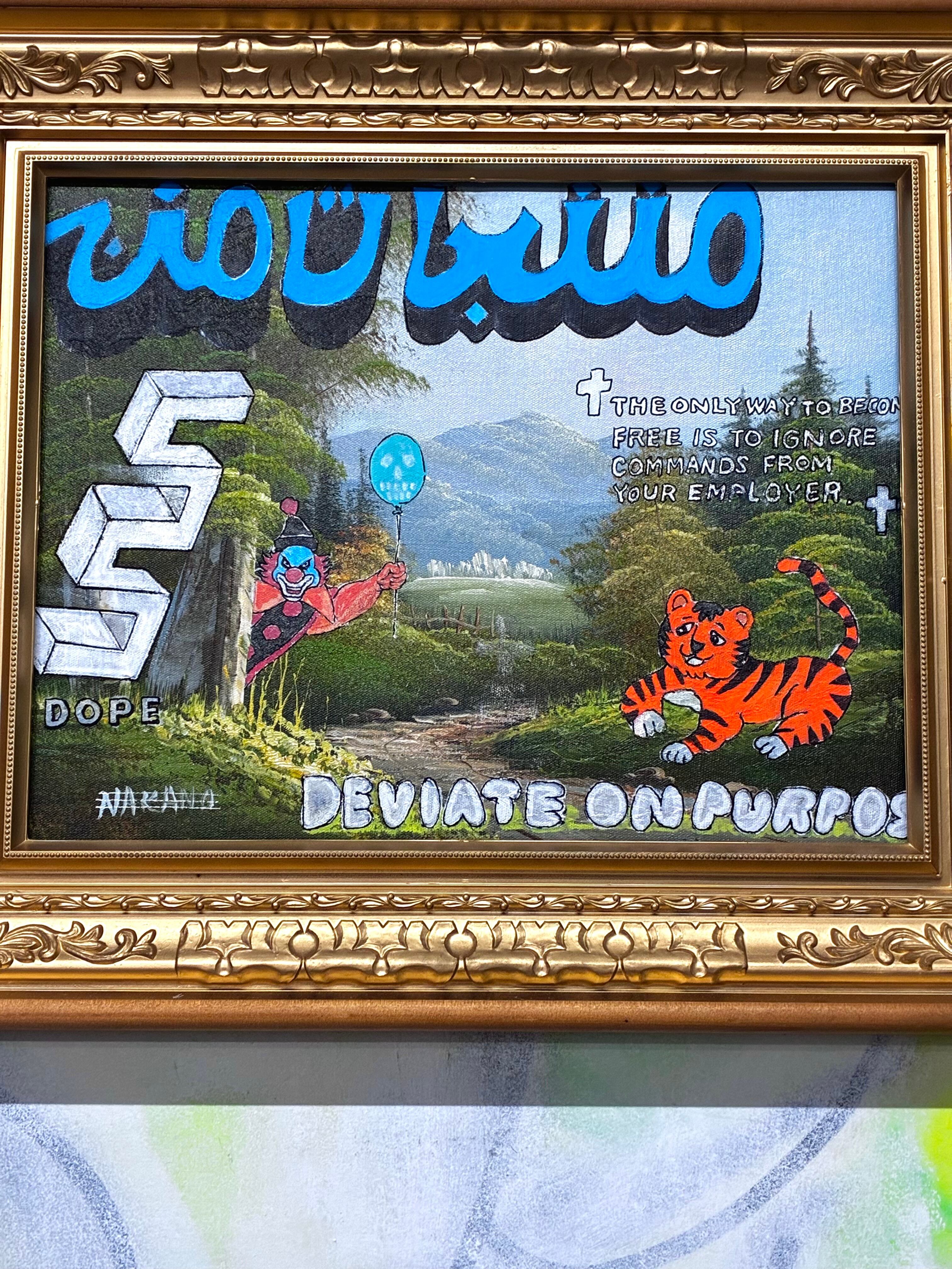 アート市場から見放されていた、古いありふれた風景画にポップをマッシュアップし、1点ものの”ありふれてない風景”に再構築する、価値のリサイクル作品。要するに、誰が描いたかわからない風景画の上からペイントし、私の作品にしています。